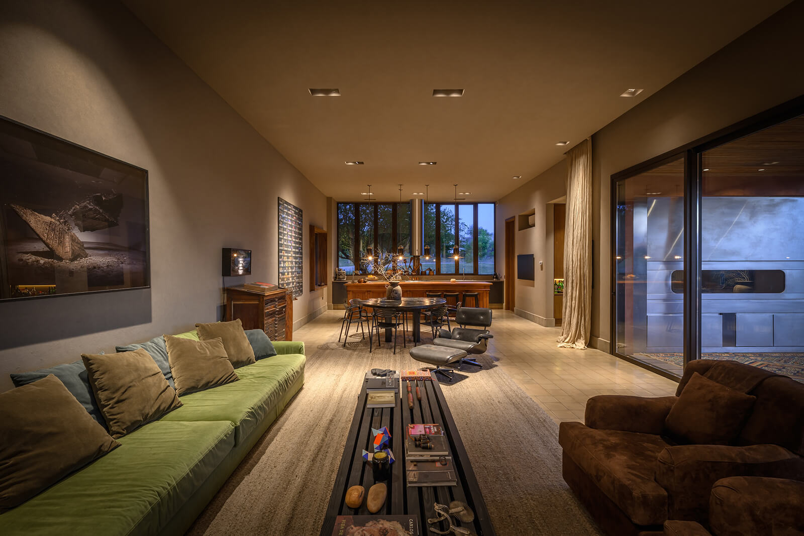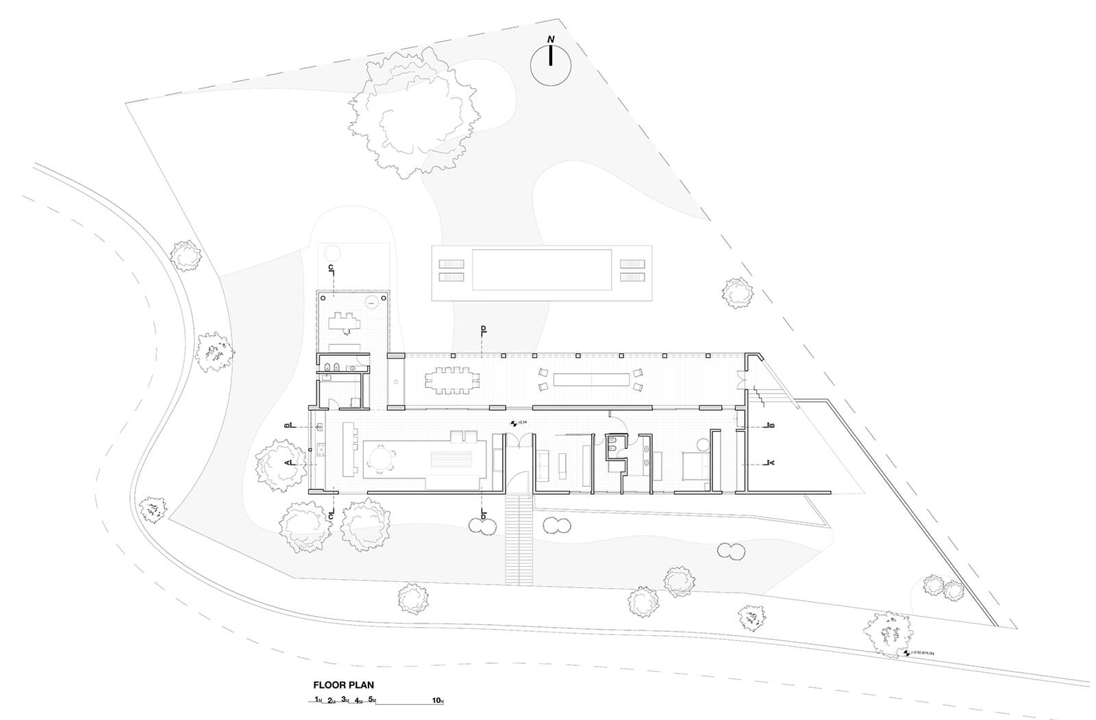 Running parallel to the gallery, a linear pool introduces a controlled horizontal element into this otherwise organic setting. Its reflective surface extends the geometry of the house outward, establishing a visual dialogue with the surrounding vegetation and amplifying the sense of continuity between architecture and landscape.