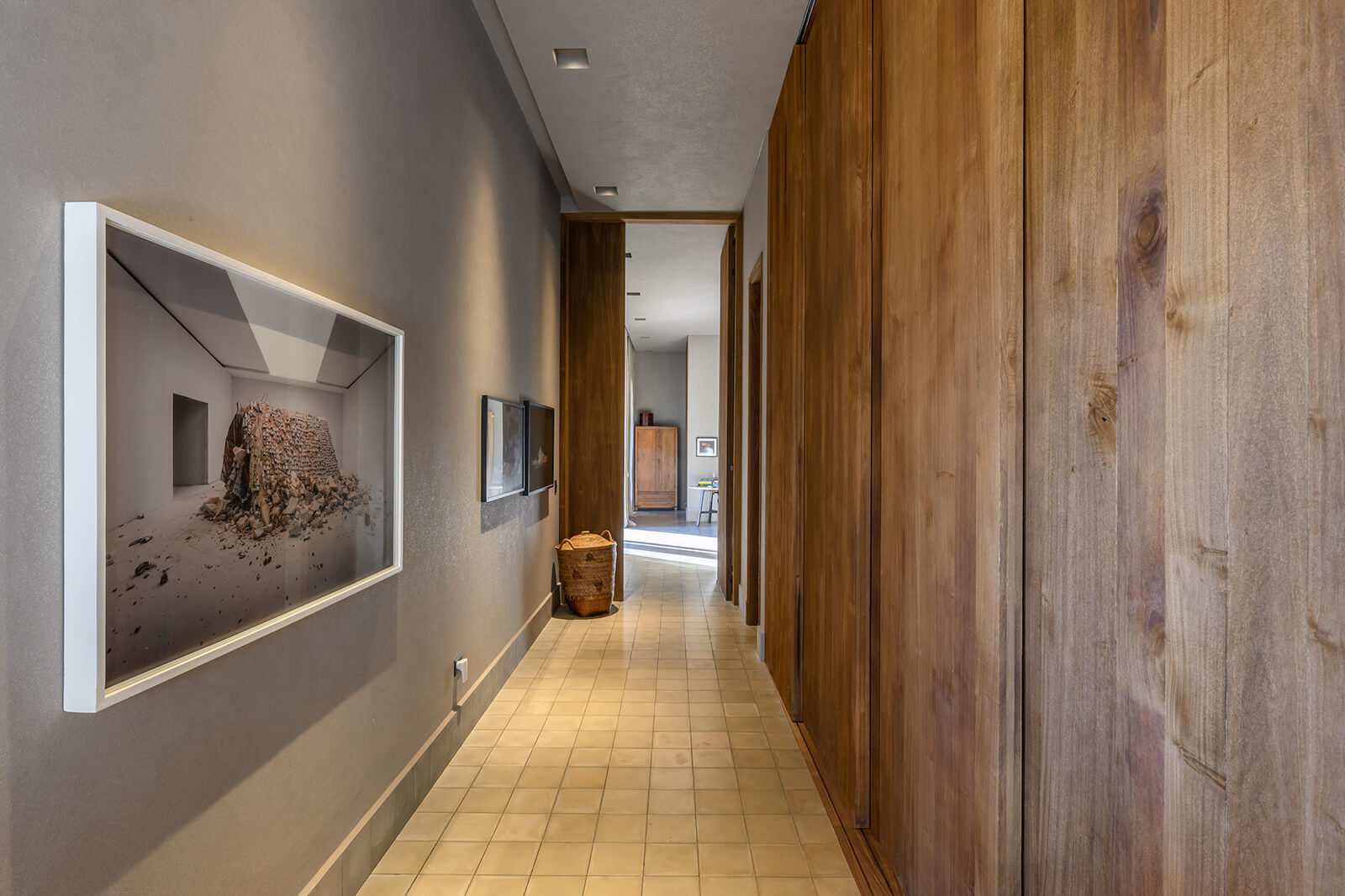 Internally, the house is organised with a clarity that reinforces its linear concept. The social life of the dwelling is concentrated at its core, where the living room, dining area and kitchen form a single, continuous space. Rather than being compartmentalised, these functions flow into one another, allowing for flexibility in use and movement. This central nucleus connects directly to a parallel longitudinal gallery that runs alongside the main volume. Carefully oriented and generously open, the gallery acts as an intermediary zone, where daily activities extend outward, shaded and protected, yet visually connected to the natural landscape.