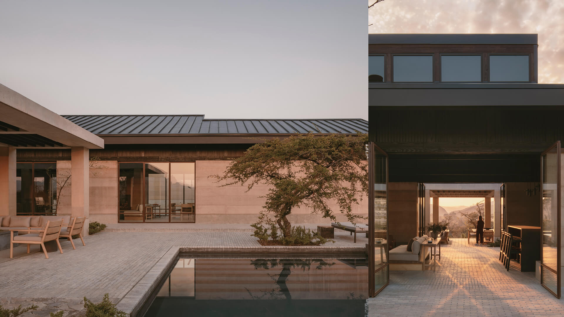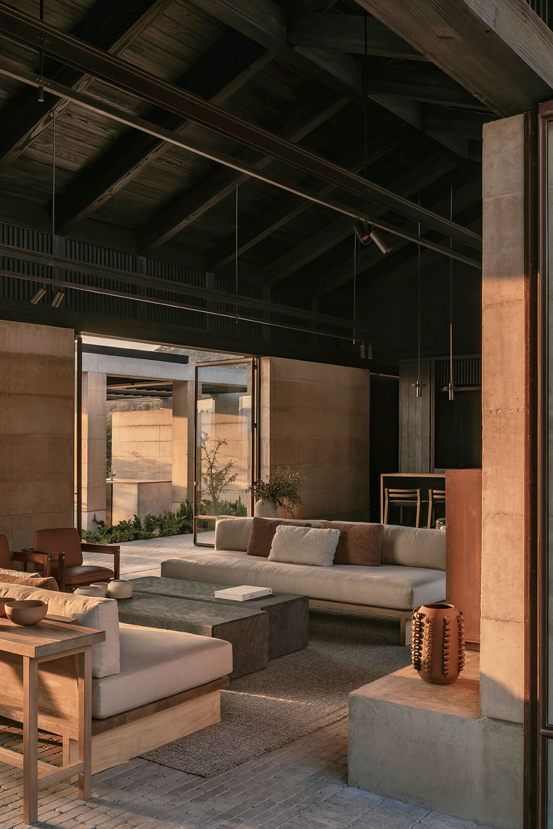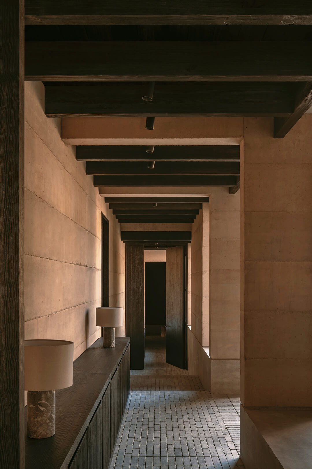 Material selection throughout the project is intentionally limited. Concrete, stone and wood form the primary palette, chosen for their durability and their capacity to weather over time. Grey stone floors extend across interior spaces, while walls are finished in muted earth tones. Ceilings lined with dark-stained wood absorb light and temper the brightness of the exterior environment. Oxidised metal details appear in fixtures and fittings, reinforcing a sense of material honesty. None of these elements seeks visual prominence. Their role is to support daily use and long-term endurance.