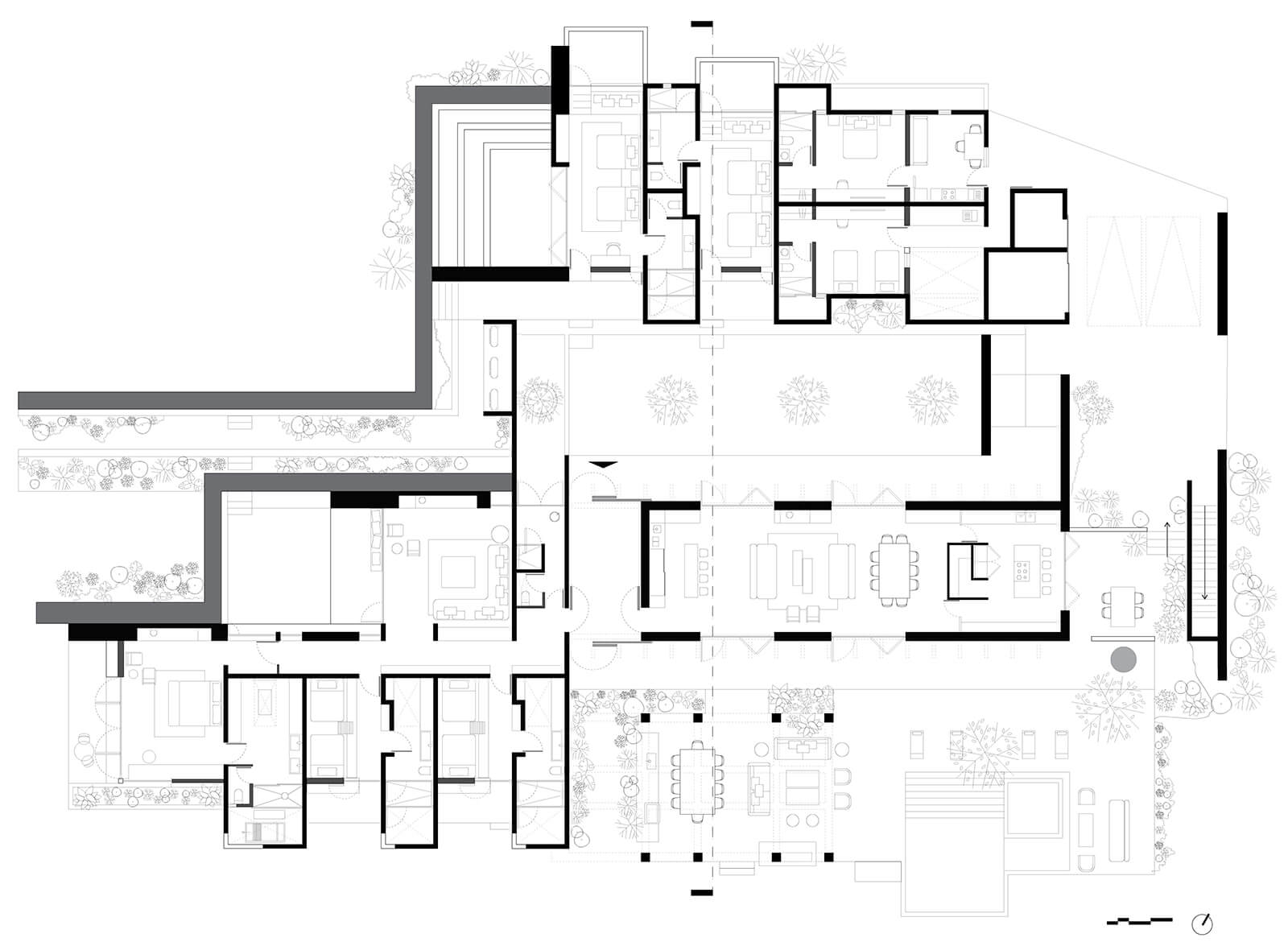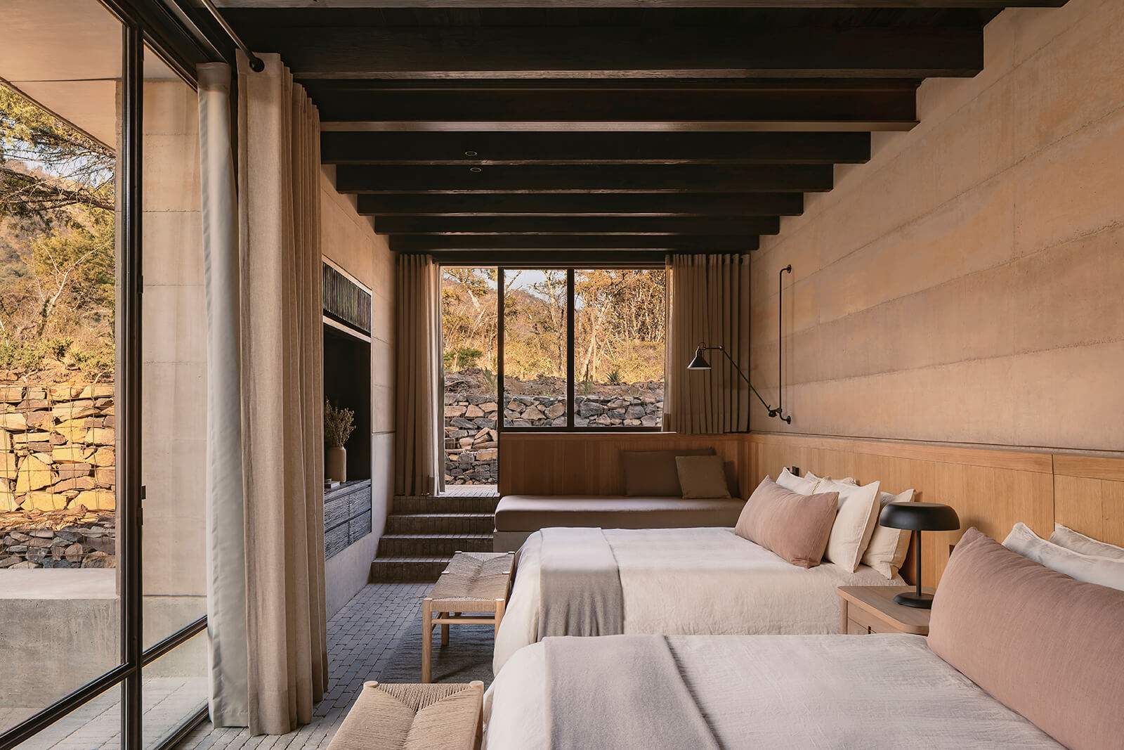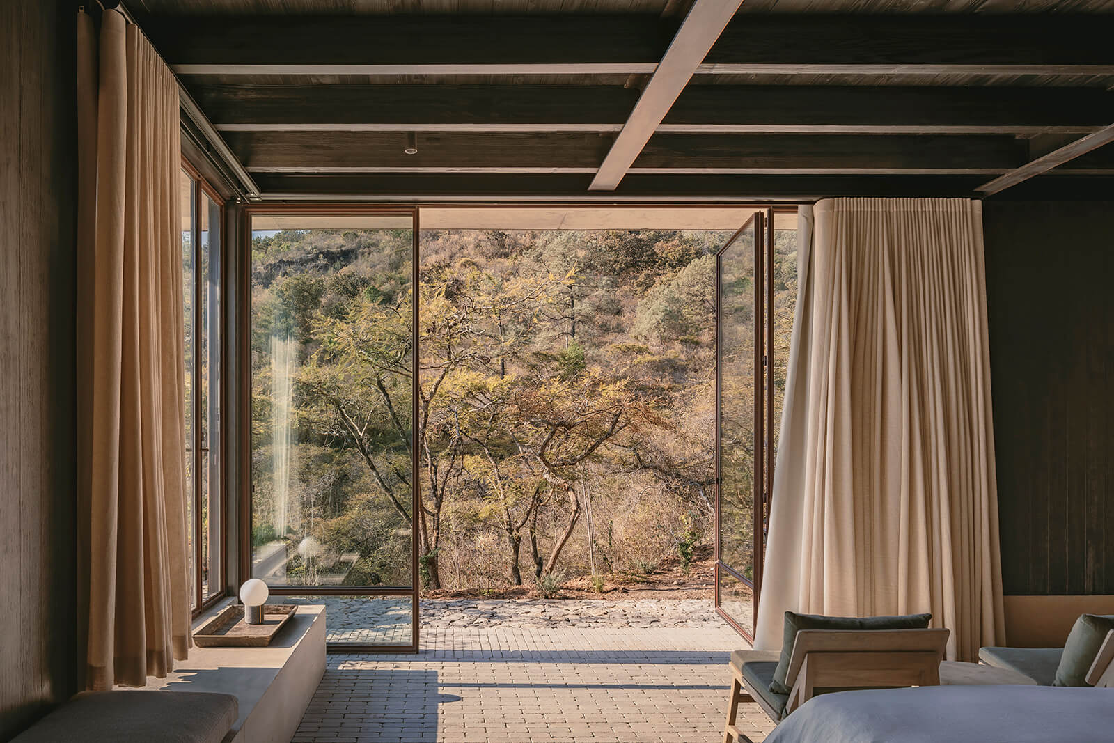 Private spaces are located within a flat-roofed volume that extends along the slope. Three bedrooms are arranged along a gently descending corridor, reinforcing the relationship between movement and terrain. The master bedroom is taller than the others and opens directly toward one of the ravines, marking the end of the sequence with a measured pause rather than a dramatic gesture. At the opposite end of the house, a covered terrace overlooks a rain-fed water feature adjacent to the pool, providing a shaded outdoor room that remains usable across seasons.