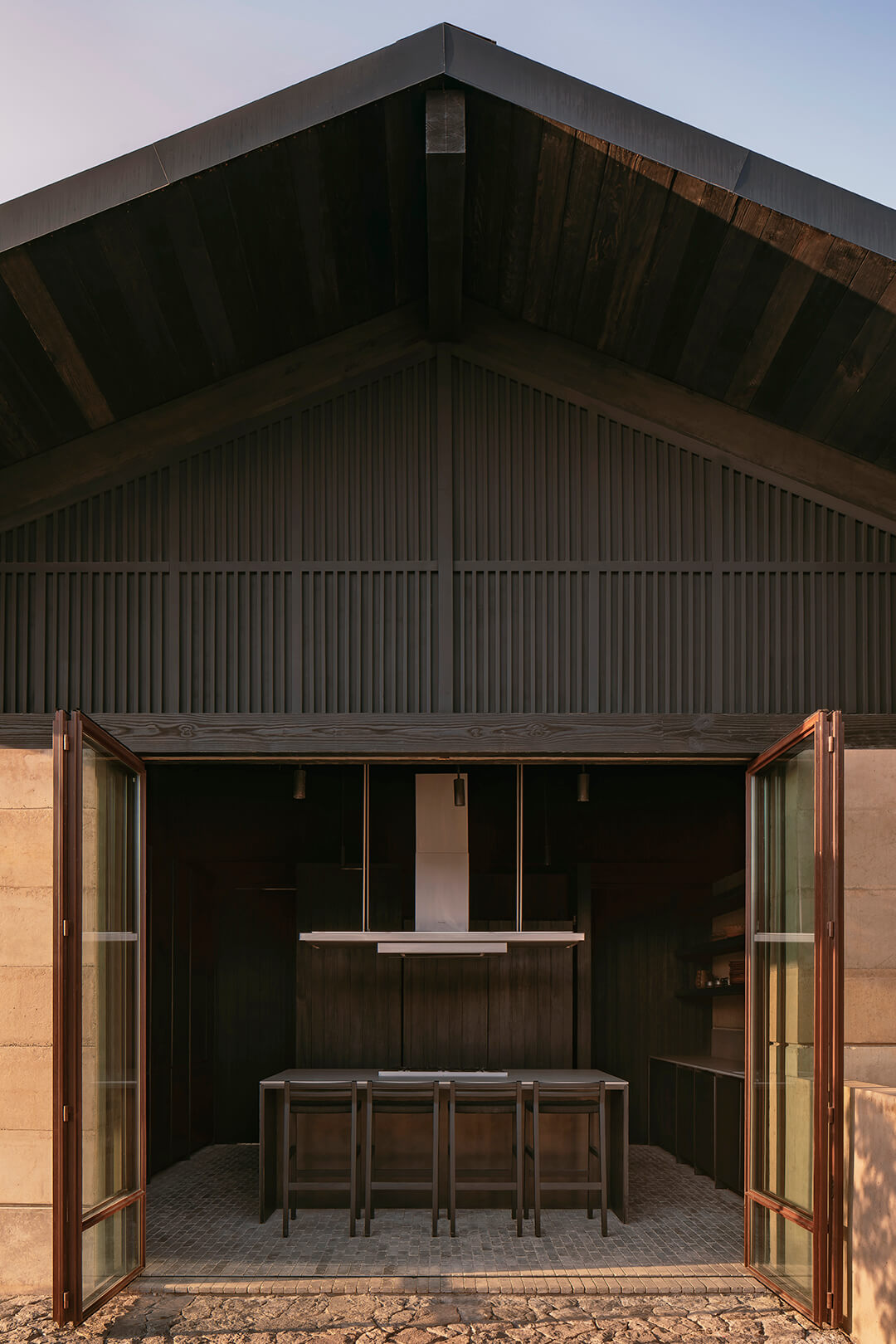 From the courtyard, a covered passage leads into the social core of the house. This space is formed as a gabled nave constructed from a black-stained wooden structure. The kitchen, dining area, living space and bar are accommodated within a single volume, encouraging continuous use rather than formal separation. Large openings connect the interior to the surrounding landscape, while the pitched roof allows natural light to enter in controlled bands, reducing glare while maintaining visual openness.