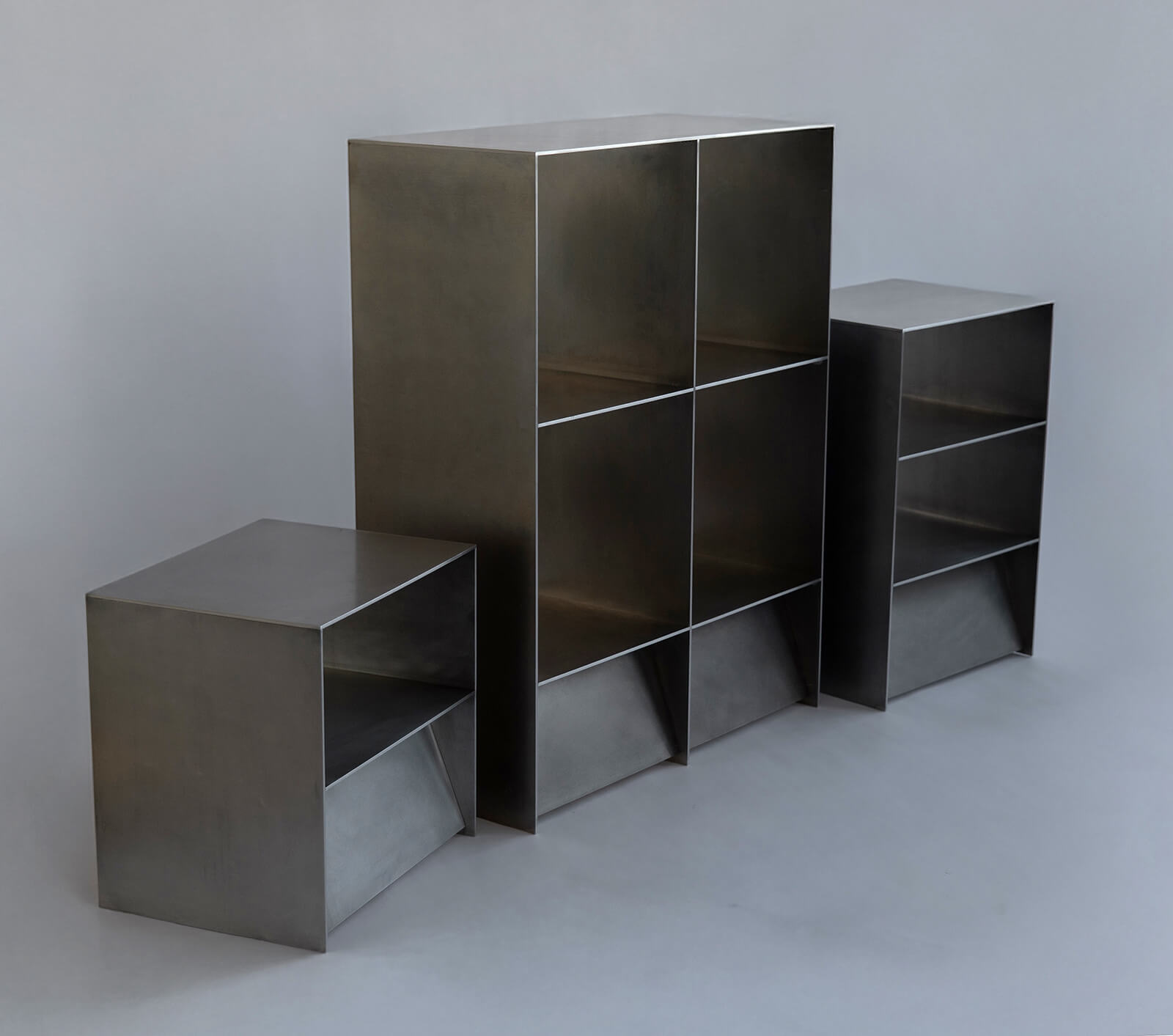The Drone series is similarly rife with an aesthetic that feels futuristic but rendered intimate through the polarity of the two materials: supple leather and hard metal. Particularly notable in the chair and sofa designs, the angularity of the metal framework for the seating is offset by round forms encased in leather. On the other hand, the shelves, drawers and desk that are part of the collection are pure, unmarred and razor-sharp. Noting the tendency towards a dystopian aesthetic for the works, Kubica explains, “I’m fascinated by the tension between modernism and traditionalism, often viewing natural objects through a slanted, almost futuristic lens.”