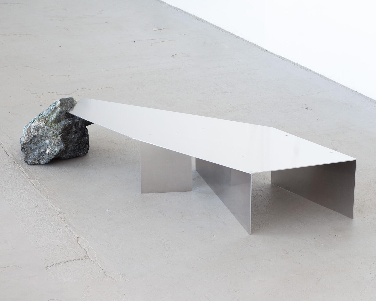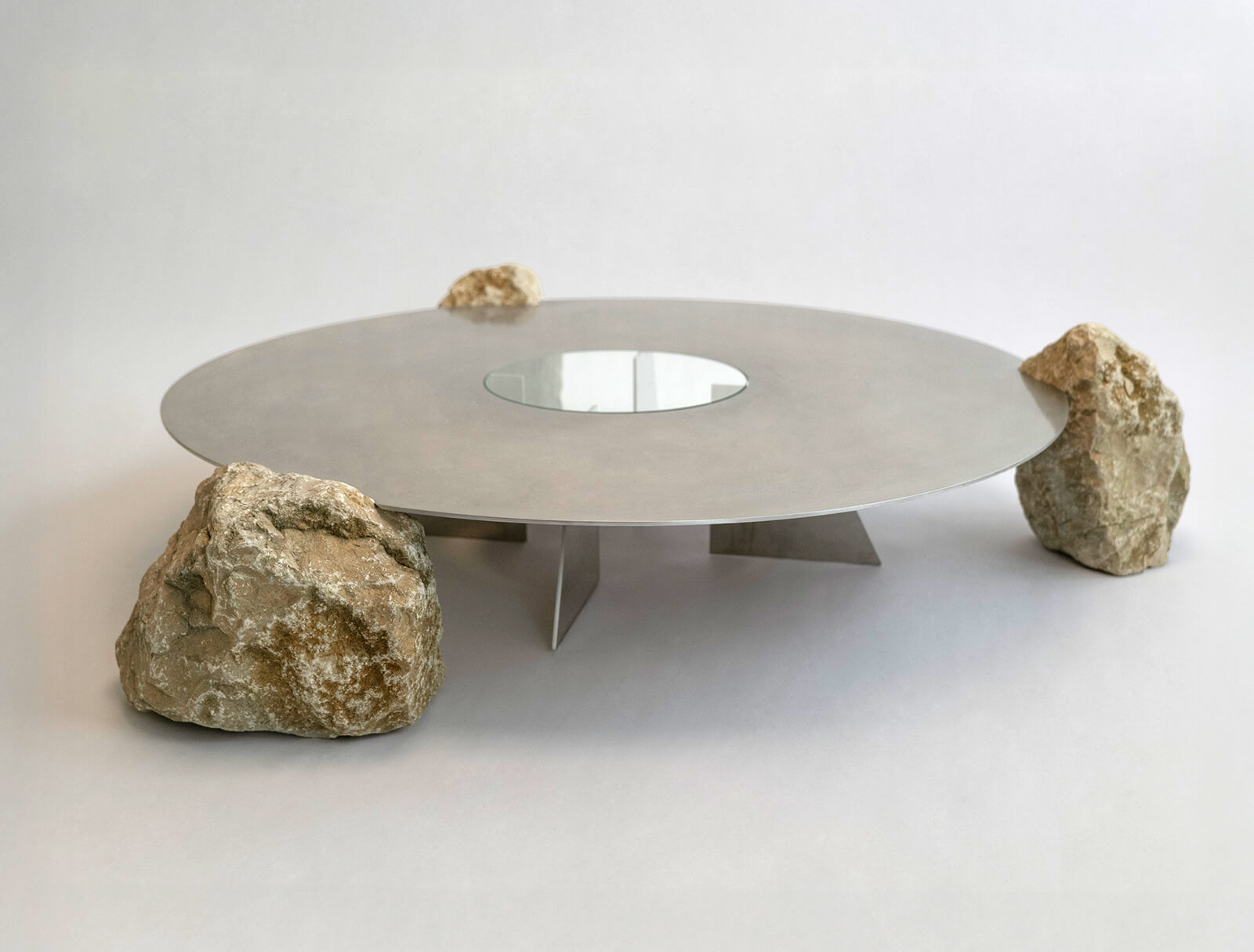 The harsh confrontation and creative resolution between the natural and artificial that Kubica hopes to demonstrate in his practice are manifested in his ongoing series of table designs aptly titled Merge. Pitting the flawless qualities of metal against the jagged, natural texture of stone, the series features coffee tables and side tables. It offers, seemingly, a laboratory for Kubica to experiment with different combinations of natural materials with metal’s meticulous craftsmanship. Not particularly adhering to an inherent logic to determine their form, the tables in the collection are all distinct. Yet, even the same form or shape could be interpreted completely differently if the stones that seem to grow out of them were changed. It’s this interplay between materiality that is crucial here.