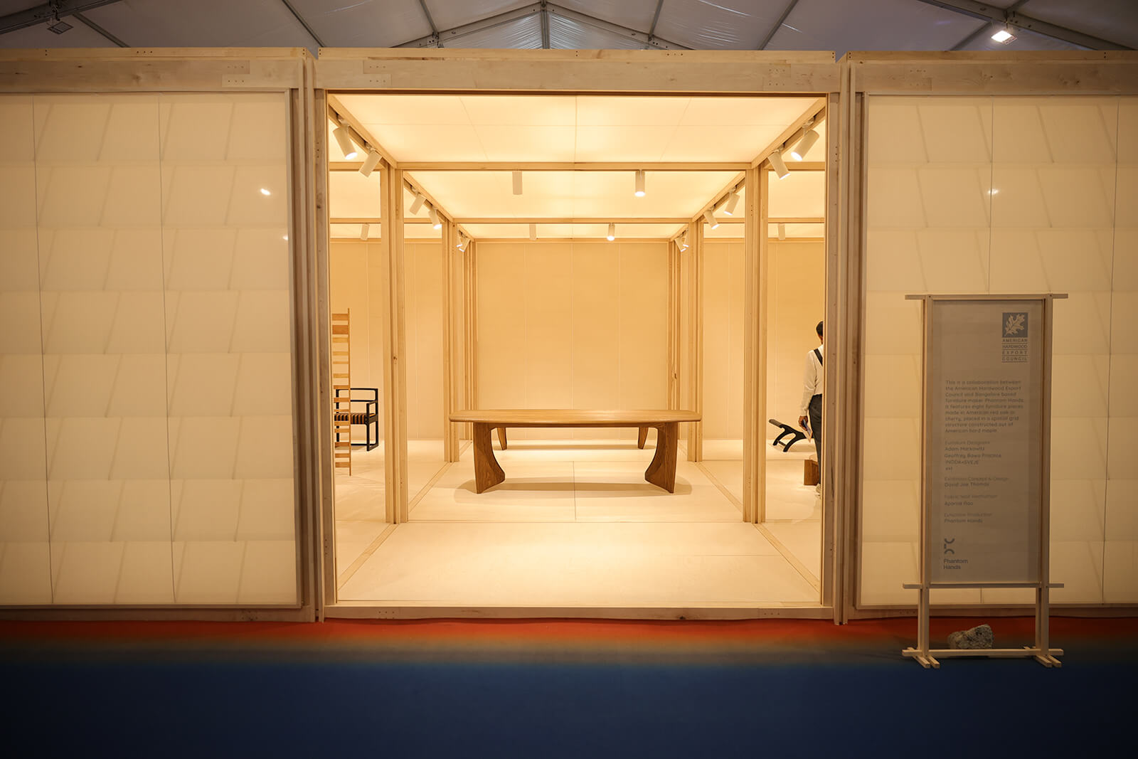 Created in collaboration with the American Hardwood Export Council (AHEC), the pavilion combined a wall, lightbox ceiling and floor, with a curated series of furniture pieces in red oak and cherry, exploring what responsibly sourced timber could look and feel in contemporary craft. The visually light walls echoed the integrated brise-soleil that Corbusier used across Chandigarh and Ahmedabad projects, while also referencing the bookshelves designed by Pierre Jeanneret. Inside, the pavilion featured furniture such as Refractions by Adam Markowitz alongside reinterpretations from Sri Lankan architect Geoffrey Bawa’s The Bawa Collection.