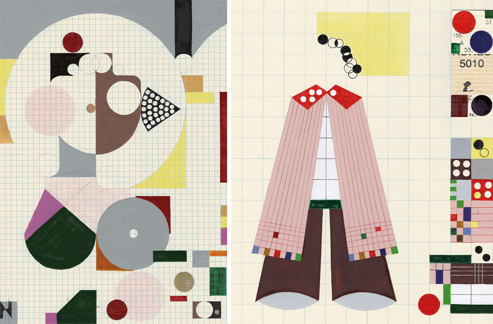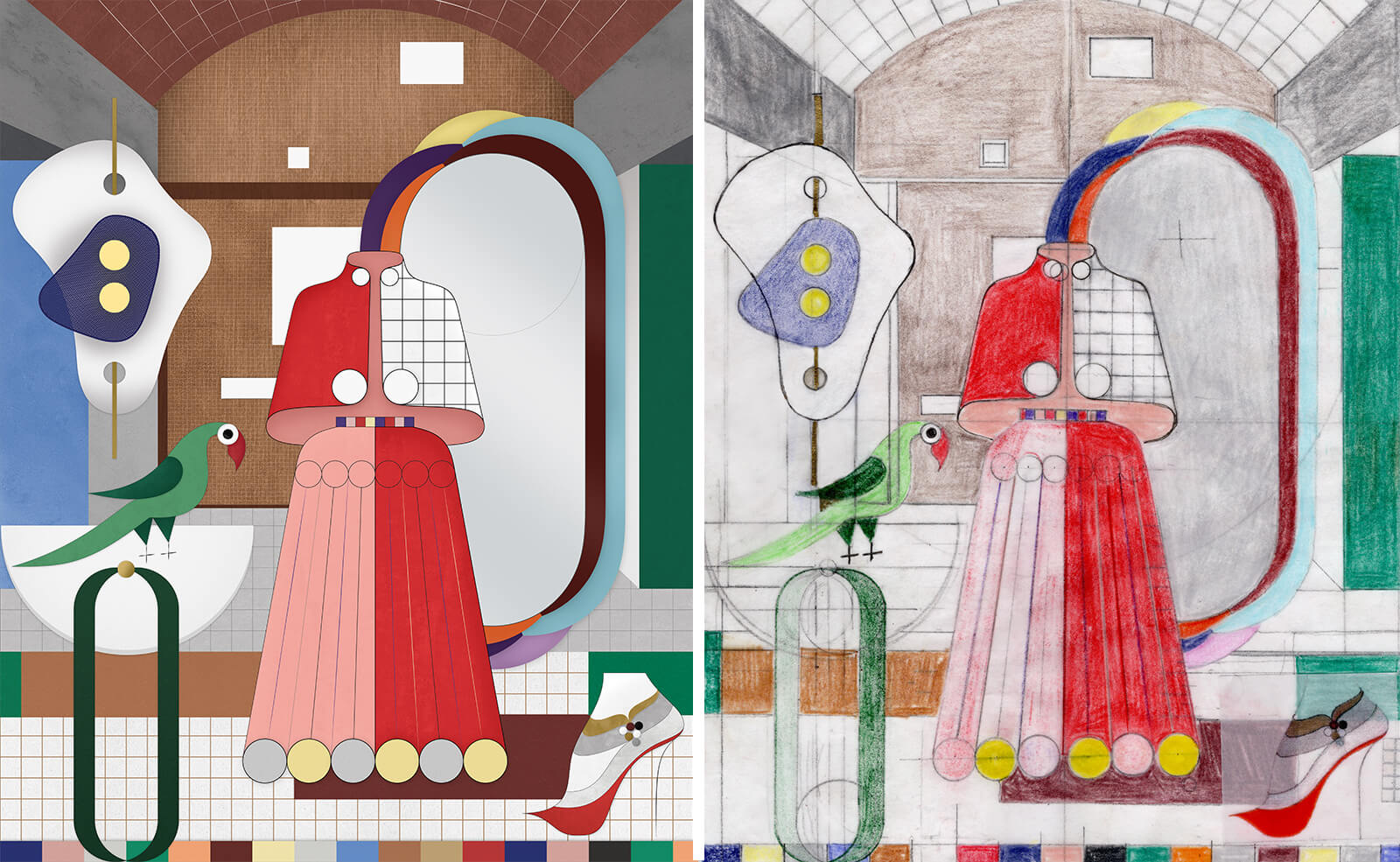 Inside, one finds a constellation of portraits: women Doshi has known in real life, admired on screen or absorbed through memory, abstracted, freed and immortalised. Her grandmother’s gold enamel earring; avant-garde 1970s Indian actress Zeenat Aman, with her garland of flowers from the song Dum Maaro Dum (1971) and her palpable femineity from the film Satyam Shivam Sundaram (1978); her aunt Maya, whose head takes the form of Gandhi’s charkha; voluptuous ‘loud ladies’ who gossip and laugh unabashedly over tea; and her architect-friend Nina, rendered as an intersection of circles. “What I’m trying to embody is that these women were generous. They were kind, they were fearless, they were glamorous,” Doshi exclaims. “I wanted to communicate their qualities, not their likeness.” The central portrait is a quiet self-reflection, mirrored—a woman observing herself within her own myth.
