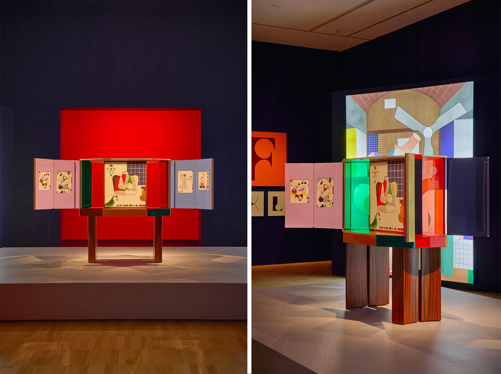 “Combining solid and void, colour and geometry, the materials and structure of the cabinet create an architectural composition that recalls the buildings that inspire the designer,” mentions NGV.