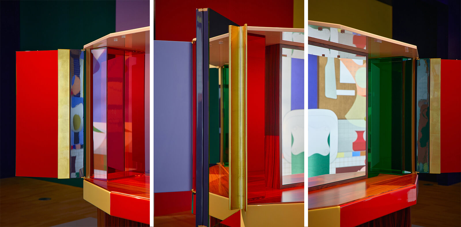 There is a choreography in the cabinet’s unveiling. “Accessible from two sides, the cabinet also includes a vanity and a writing desk, components that support contemplation and self-expression,” as NGV states, and fuses modernist architecture and miniature painting, Bollywood technicolour and temple ornamentation, personal memory and collective myth. If one looks at its closed surface, its horizontal striations invite touch and tempt one to find the cabinet’s opening. Its glass light boxes filter illumination into its recesses; mirrors refract fragments of the room back at the viewer. One encounters a form and an atmosphere, a spatial composition in which product design becomes meditation, even a statement of solidarity, once you converse with it. “The moment you open it, you are enveloped. You are inside a room of your own,” the industrial designer explains.