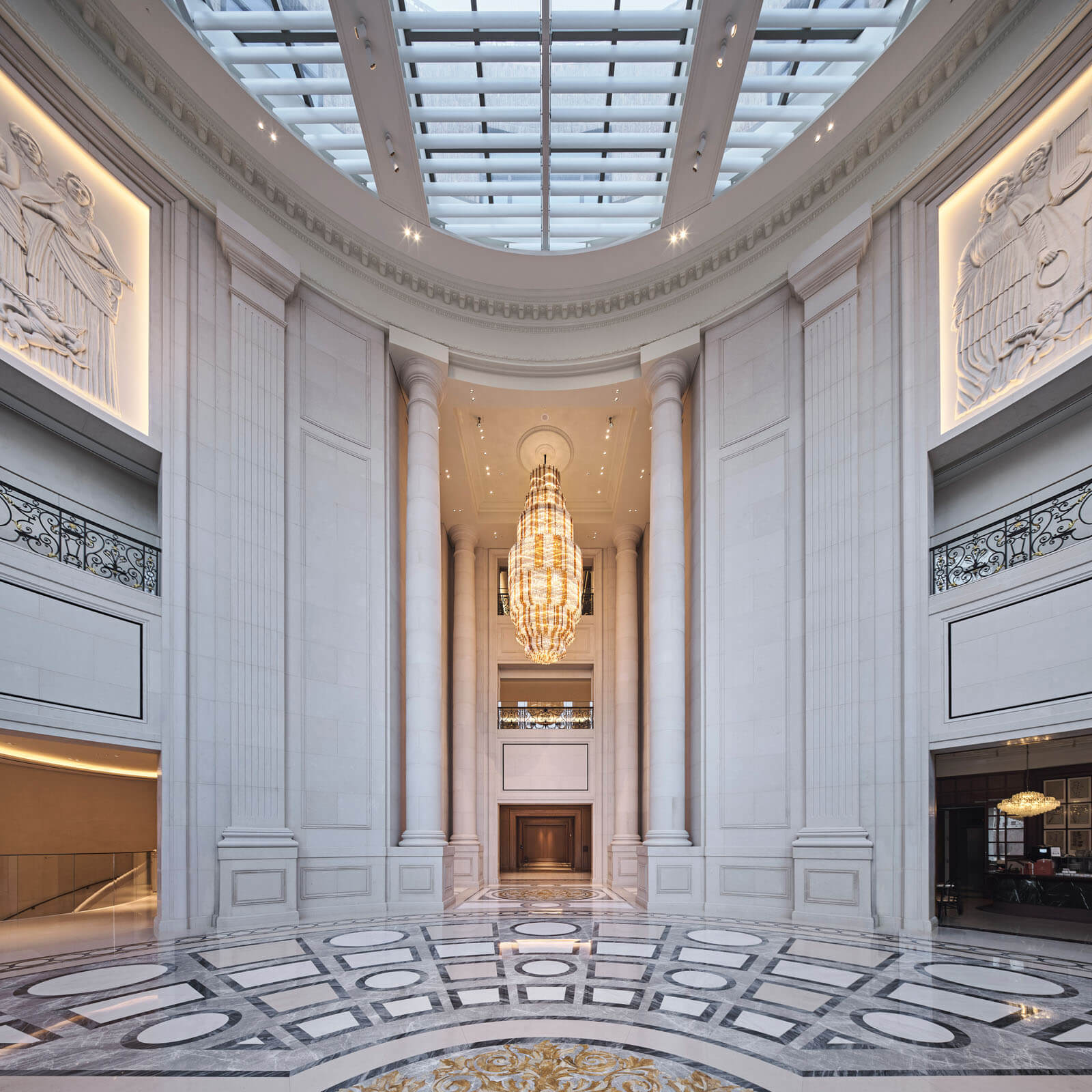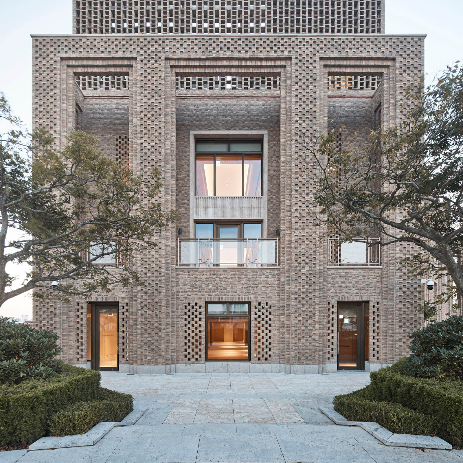 The perforated brick wall that rises above the limestone base, primarily composing the façade design, is among the building’s most striking features. Hand-moulded bricks arranged in intricate recessed and screen-like patterns lend a sense of depth to the structure, exuding fine craftsmanship, while also providing functional benefits such as shading and ventilation. The façade culminates in a decorative brick-screen penthouse, which creates a lantern-like effect at night, subtly marking the building’s presence on the Seoul skyline. This meticulous design attention to detail further reflects RAMSA’s expertise in masonry, honed through decades of studying and reinterpreting architectural precedents.