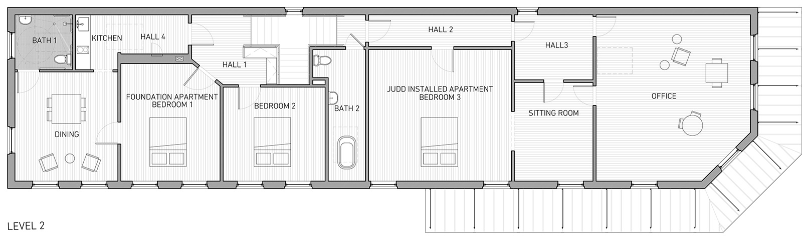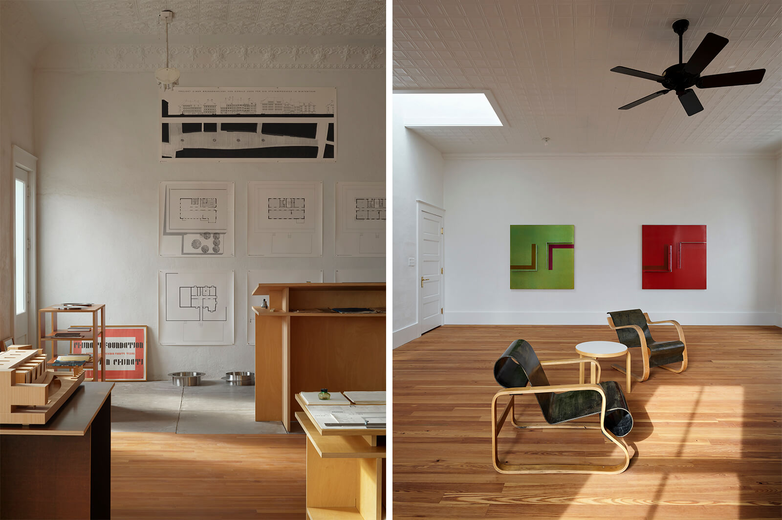 Inside, the ground-floor office now houses Judd’s plywood and metal furniture, along with models, drawings, and prototypes. The second floor, known as the Architecture Apartment, includes multi-room living spaces furnished by Judd, with paintings by John Chamberlain and designs by Alvar Aalto. The building also includes new program spaces for the Foundation and accommodations for visiting researchers.