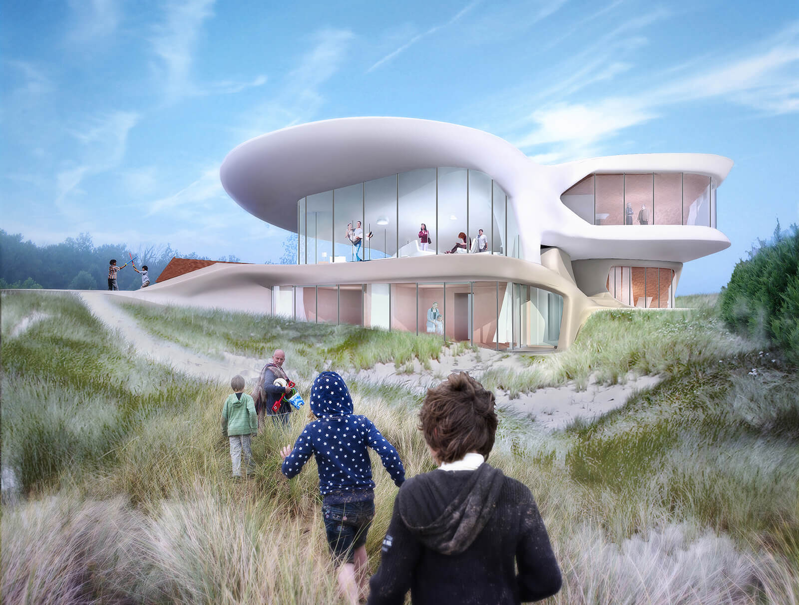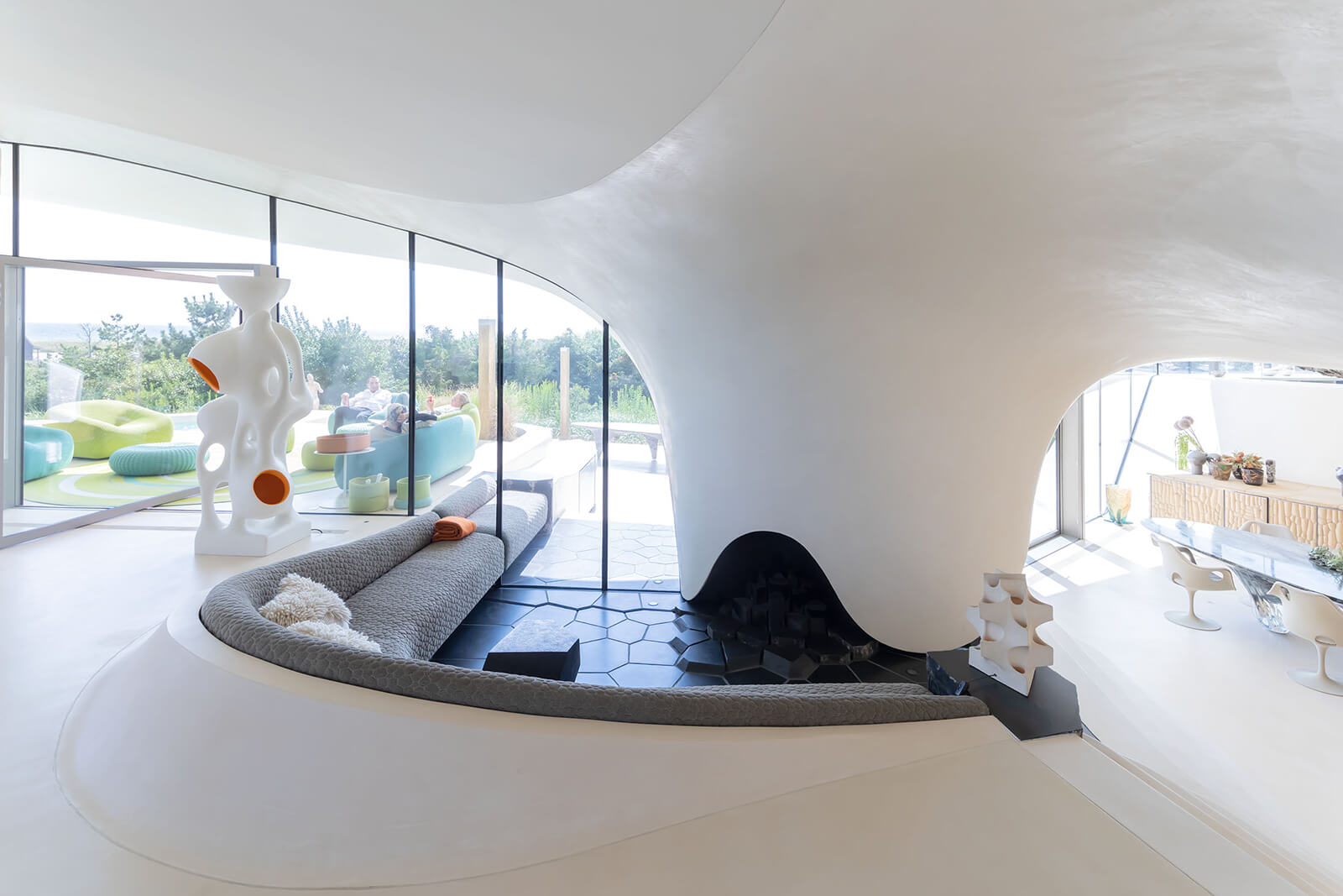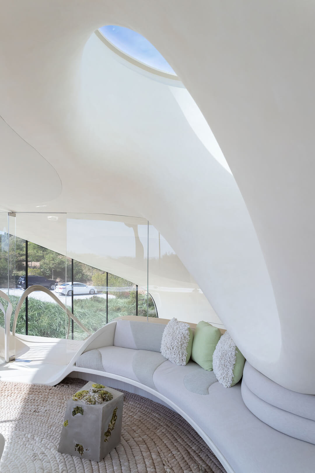 The avant-garde is captured in the composition of the roof, drawn from aerospace modelling and fabrication methods. Fabricated by Seattle-based aerospace design firm Janicki Industries, the softly curving edges of the fibreglass and foam monocoque structure rise and fall in a surreal display, sheltering living spaces while making sure every corner of the house remain closely connected to the outdoors. The interiors evoke the impression of a cave sculpted in a modernist aesthetic. Some spaces remain tucked within the dunes while others are enveloped by the roof creating distinct lookouts into the landscape.