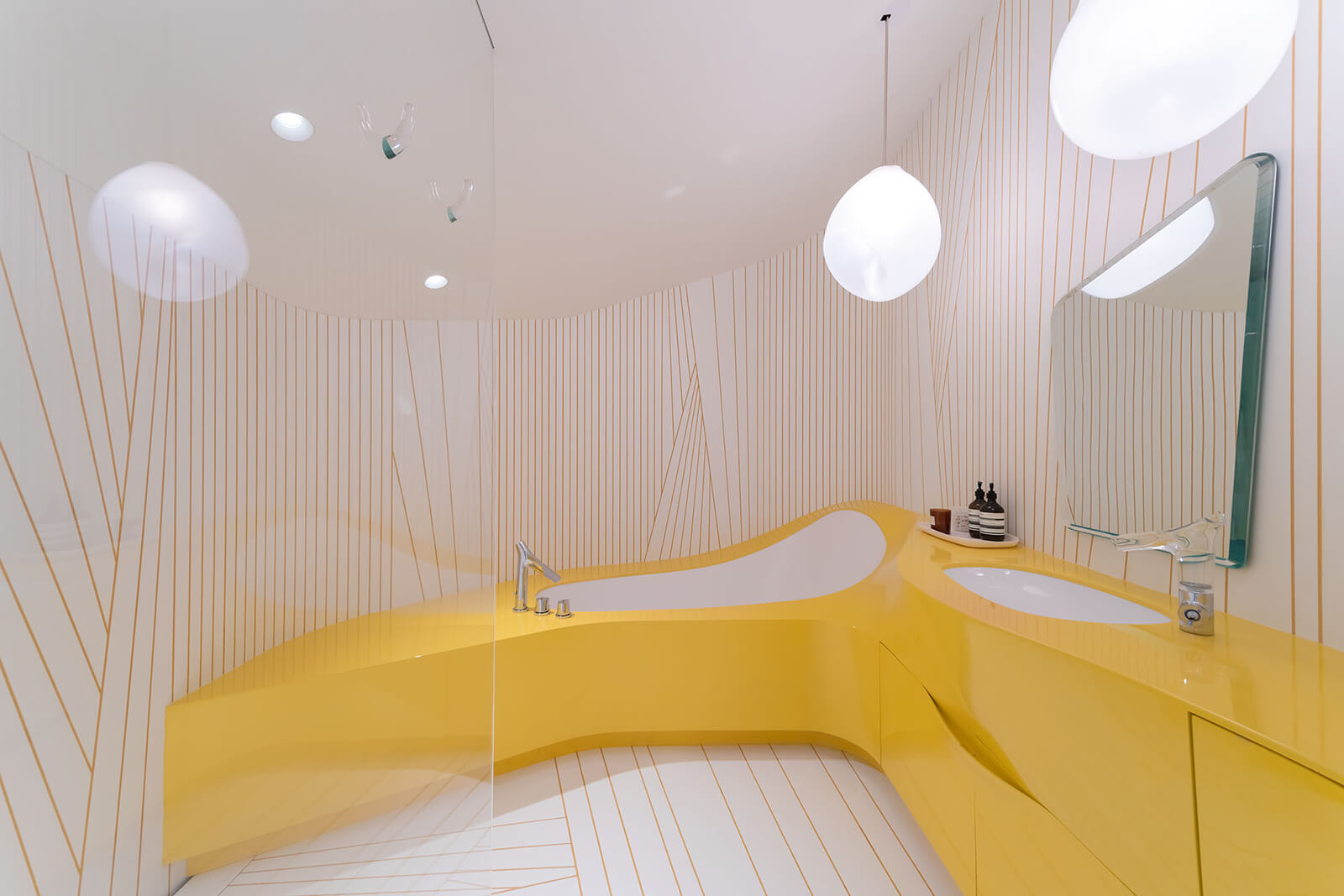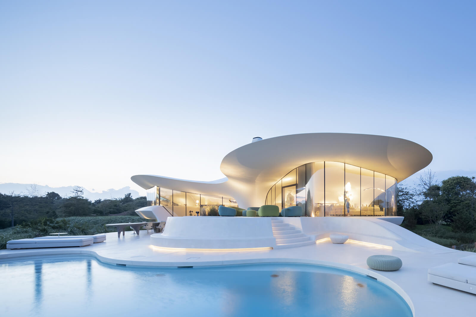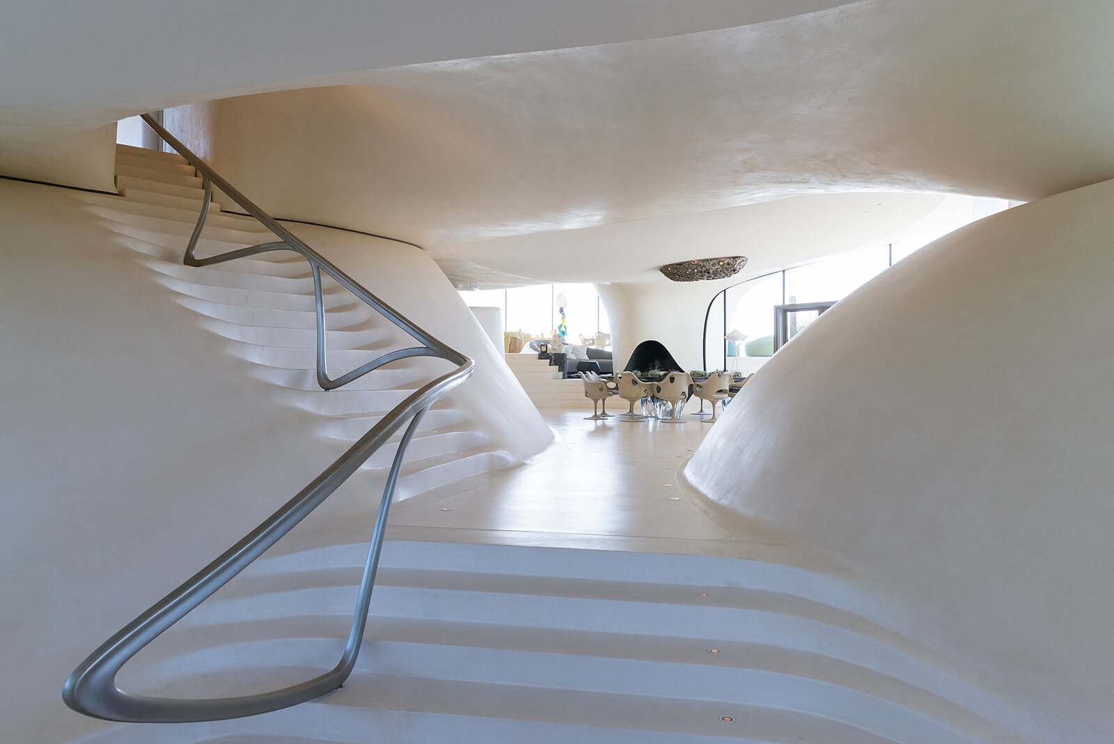 Inside the main level, a series of platforms and stairways define the living space. With interior design by Paris and New York-based designer Michael Lewis, the furniture and upholstery draws harmony with the overarching scheme. A series of vintage dining chairs by Eero Saarinen, customer marble tables by Joseph Walsh, and a long sectional sofa placed about the periphery of the flowy walls dot the living space. Seamlessly opening onto the outdoor court, stairs further lead people to the pool area and open living space, and a rooftop lounge.