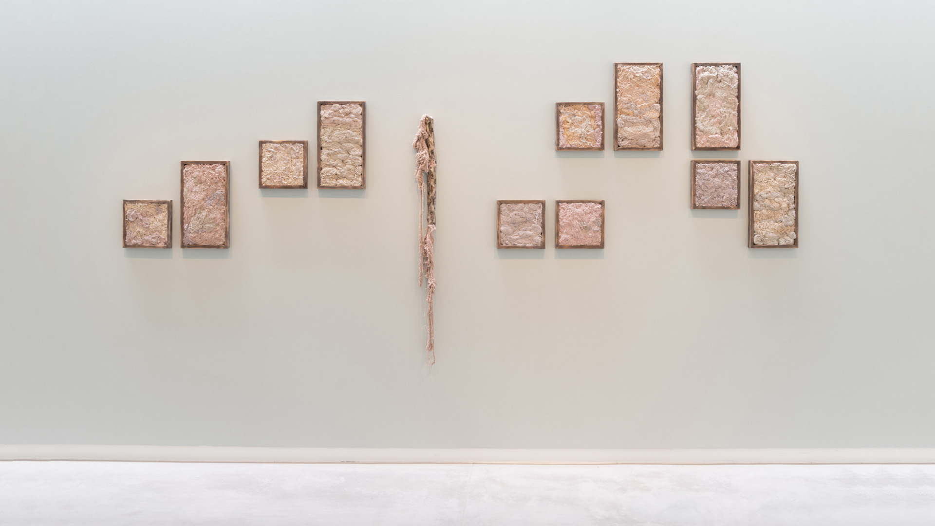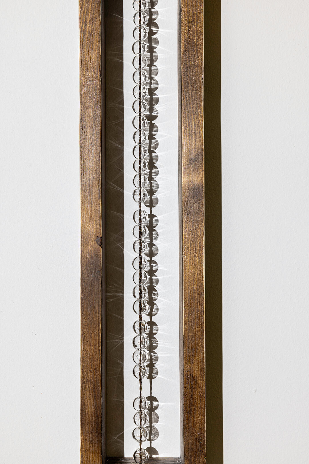 Braiding—whether rope or hair—is central to the exhibition, embodying repetition as a means to make, shape and bind. In Pull, Tie, Release (2024), for example, knotted cotton ropes hang from a frame, falling to varying heights. Through the title, the dimension of time becomes visible, illustrating the choreography behind the piece and underlining the moments of tension and release therein. Hair Bubbles (2023) makes the braiding motif even more visceral—small glass spheres are enclosed in a wooden frame, each holding fallen strands of the artist’s hair: detangled, braided and threaded through. Each bubble holds time—the moments spent arranging the hair and the years spent growing each strand.