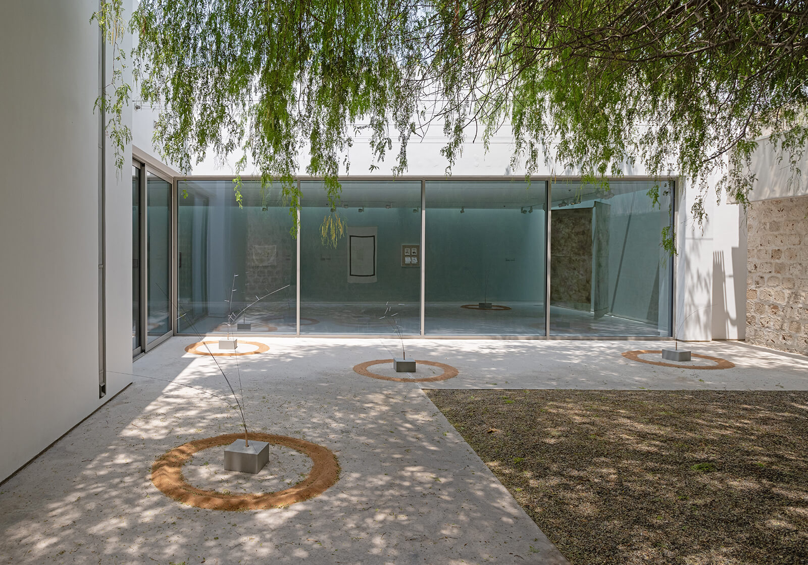 Grey cement blocks lie in circles of sand, placed across a gallery space. Piano wires ‘grow’ out of the blocks, giving them a plantlike appearance. The wires rotate, touching the sand and etching circular, repetitive patterns into it, echoing spirals left in the desert by plants moving with the wind. This is Restless Circle (2025), an artwork by Abu Dhabi-based artist Afra Al Dhaheri for her solo exhibition of the same name, part of the Sharjah Art Foundation’s autumn 2025 programme at Gallery 6, Al Mureijah Square, Sharjah.