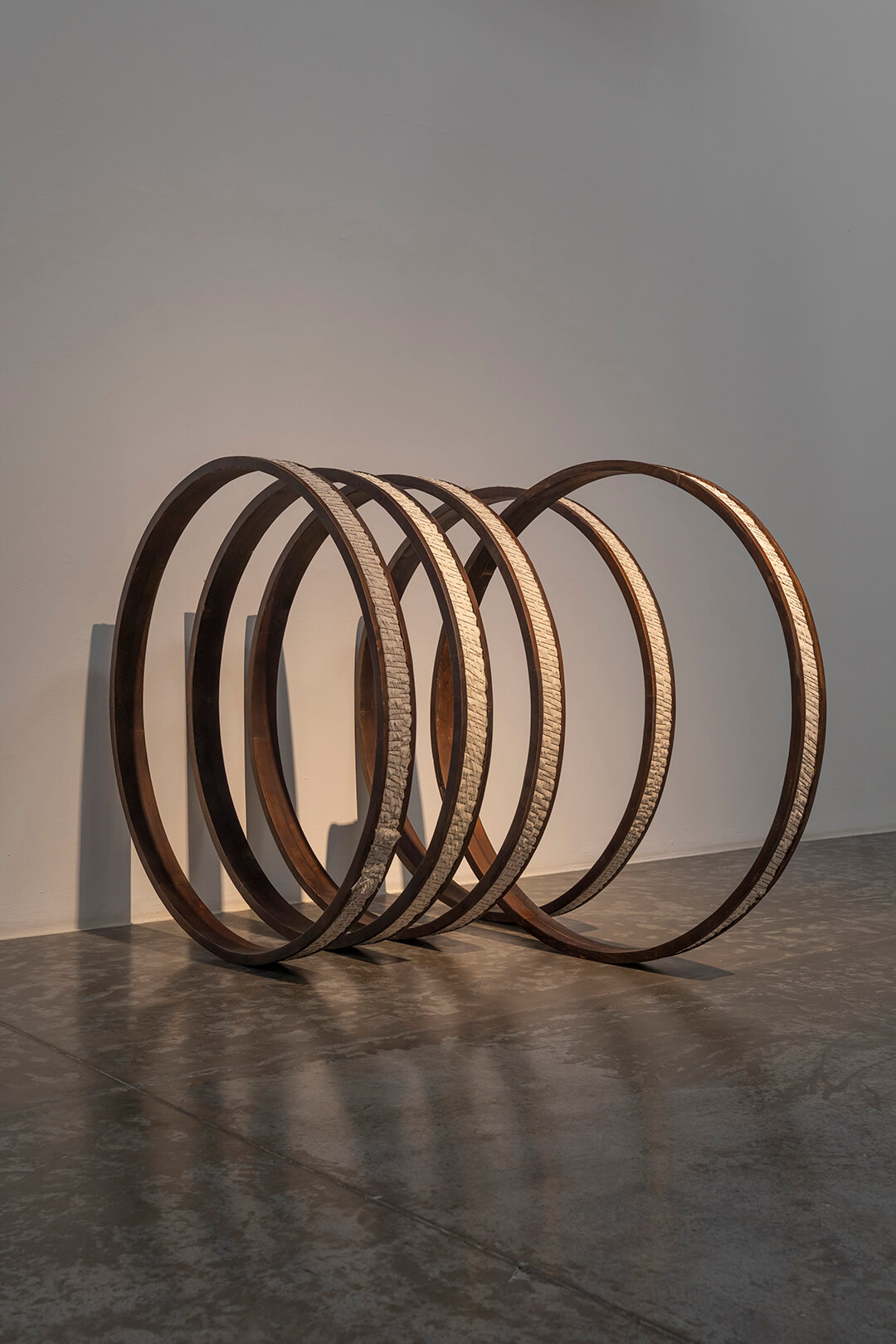 Elsewhere, five upright wooden rings sit alongside each other, coiled with multiple strands of thin cotton rope. The structure is held in place insistently by several bobby pins, at intervals of only a few centimetres. The sculpture, Round and Round We Go (2023), is defined by the visible strain of keeping itself intact. May Alqaydi, assistant curator at the Sharjah Art Foundation, spoke to STIR about the exhibition, saying, “Through Afra’s process, repetition becomes both fragile and alive, it carries time, emotion and persistence, and in a way, the exhibition lingers on endurance, the patience and quiet strength within those everyday habitual acts that usually pass unseen.”