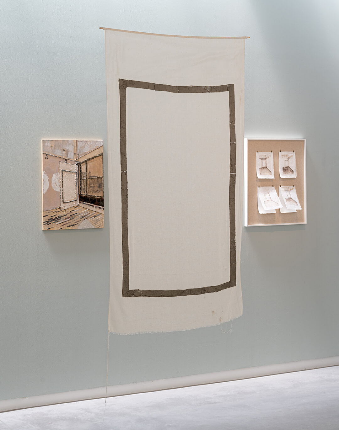 Al Dhaheri further explores the idea of unmaking in earlier works, such as In absence we forgot (2015), where a canvas-like white fabric is suspended from the ceiling, with a thick grey border that has begun to flake and fade, loose strings hanging from the fabric’s hem as it frays. It is displayed alongside an artwork commemorating it, To Preserve (2017), an attempt to recall the work’s initial form even as it decays with time.