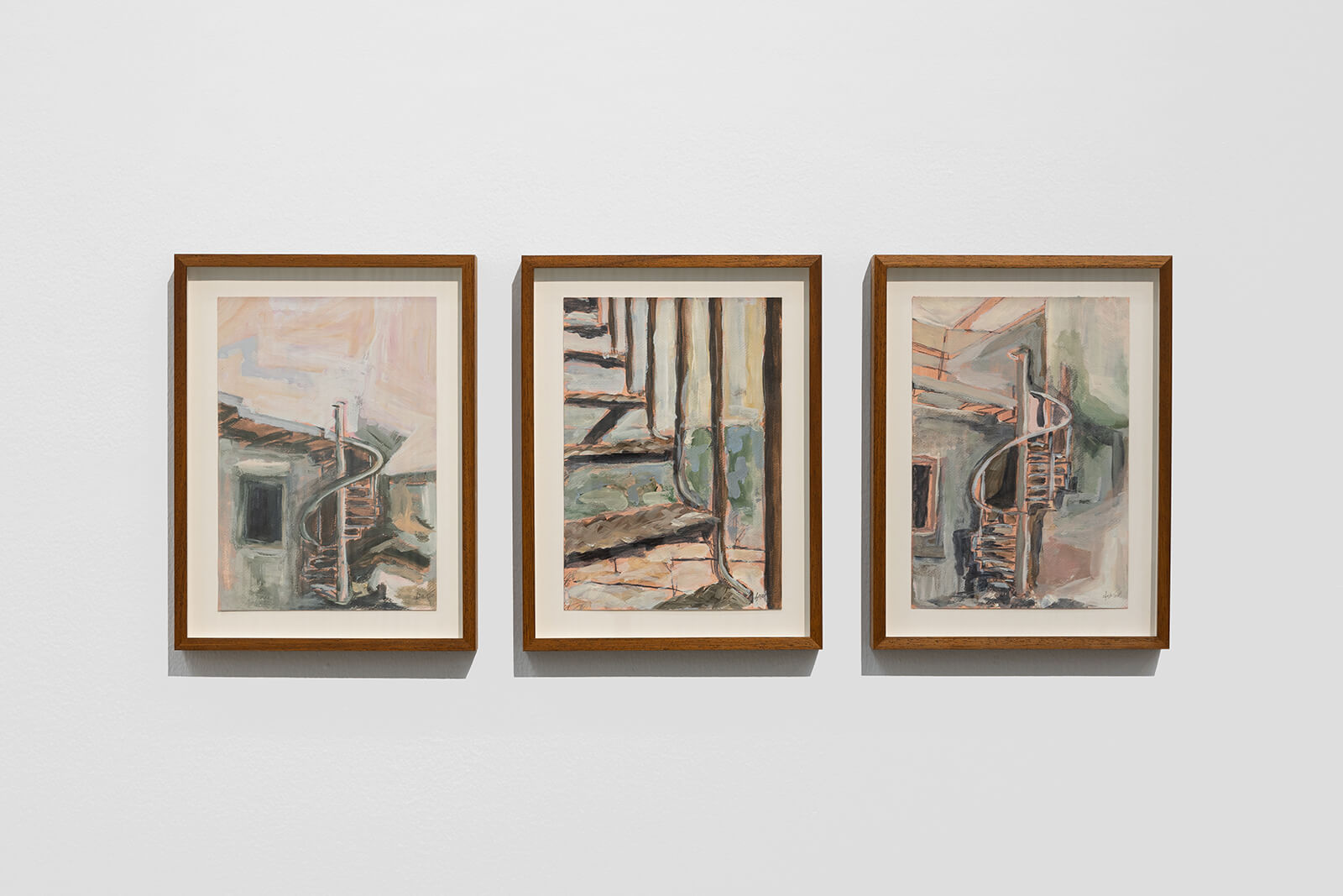 Al Dhaheri’s preoccupation with what changes and why, and what is left behind, forgotten and rendered invisible by progress, is inspired in part by her experience growing up in Abu Dhabi and the UAE at large, whose recent history is defined by a series of rapid structural changes. Spiral Staircase (2020), a triptych of acrylic and graphite drawings, depicts a now-fading element of Abu Dhabi’s architectural heritage—spiral staircases on the outside of buildings. These staircases connected outdoor areas in commercial and residential buildings, offering spaces for connection; their dwindling number reflects a shift in the city’s attitudes towards public and private spaces.