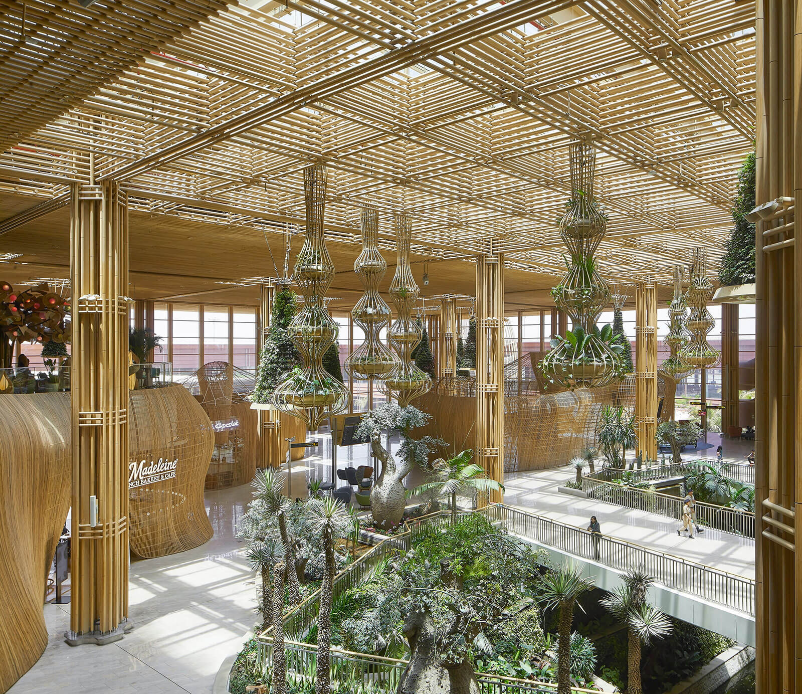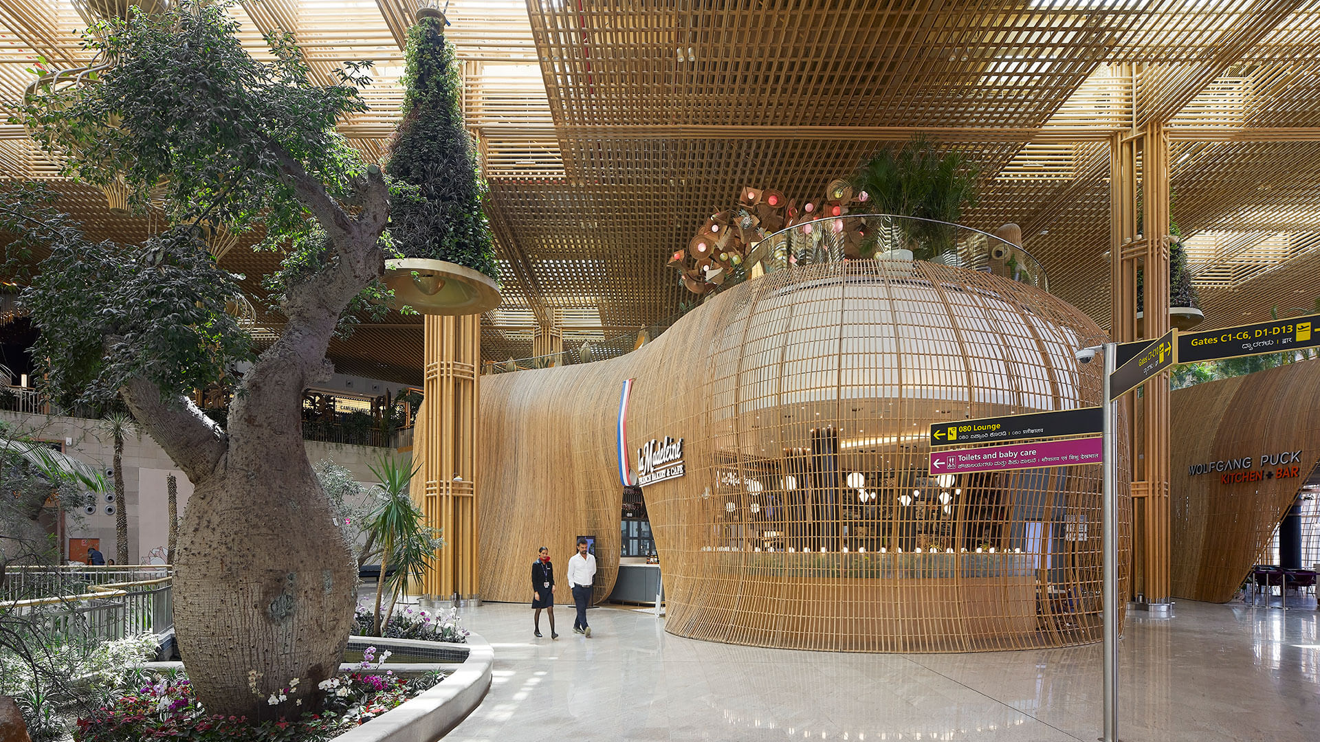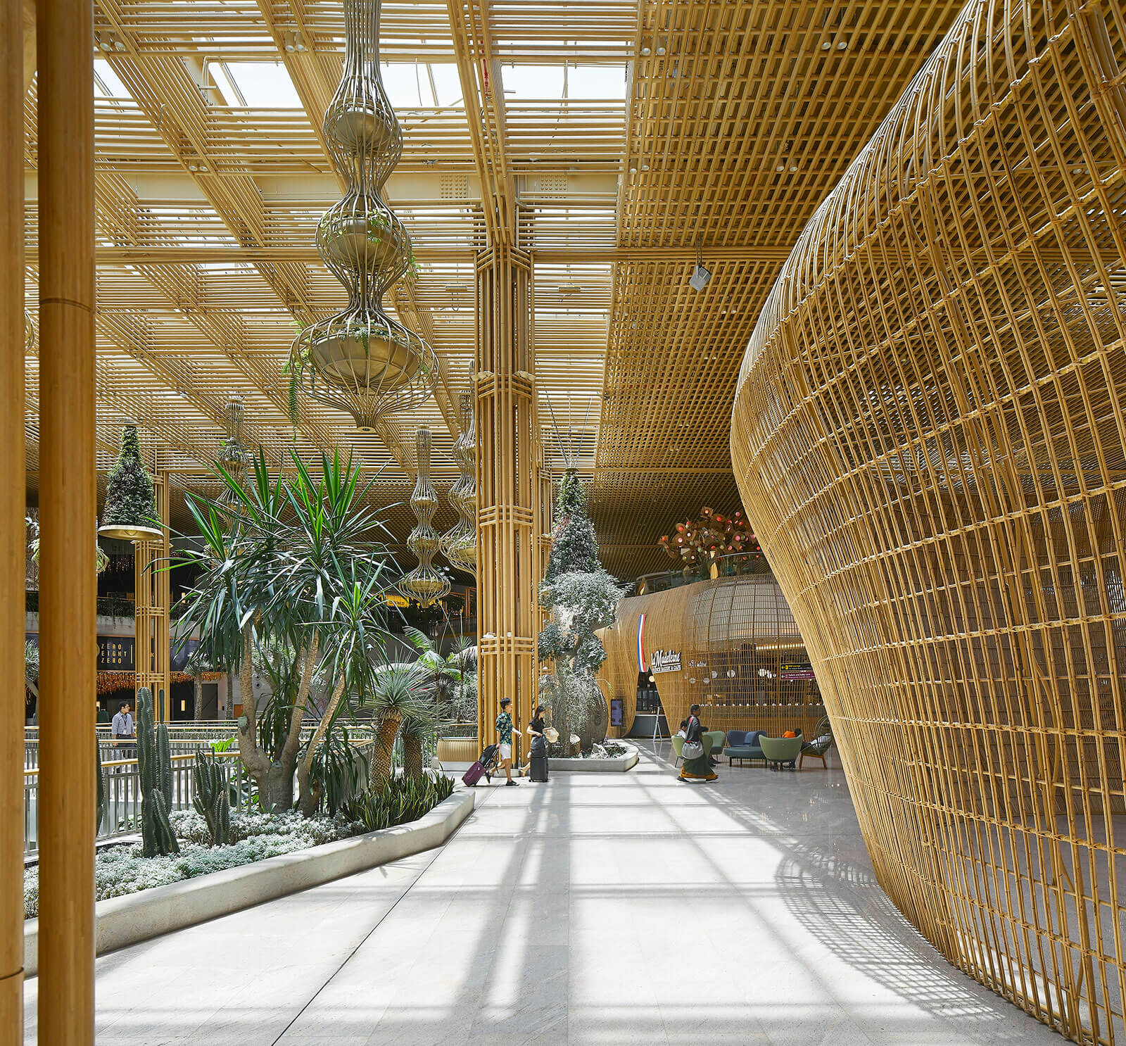 In the garden city of Bengaluru in Karnataka, Enter Projects Asia (EPA) illustrates the structural qualities of rattan outside this context of wellness architecture and implants it in the urban context of the city. The post-security departures area of Kempegowda International Airport's Terminal 2 features a 12,000 sq.m. space with retail, hospitality, and lounge areas, animated by a cluster of five rattan pods interspersed with green spaces.