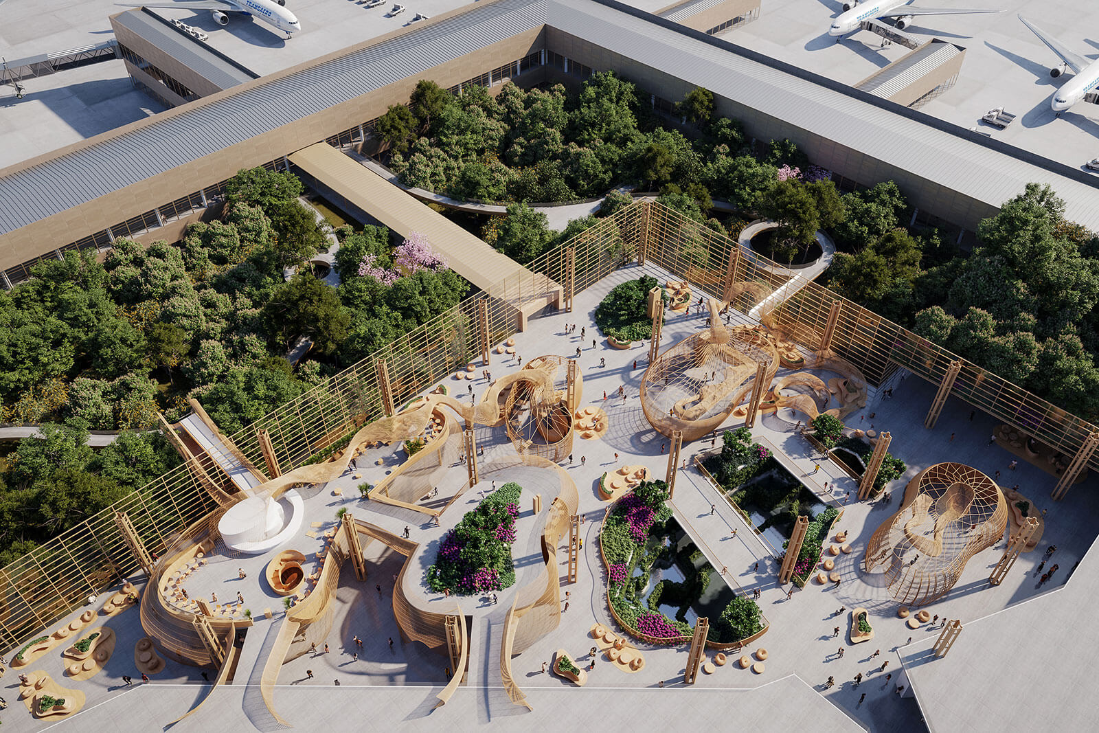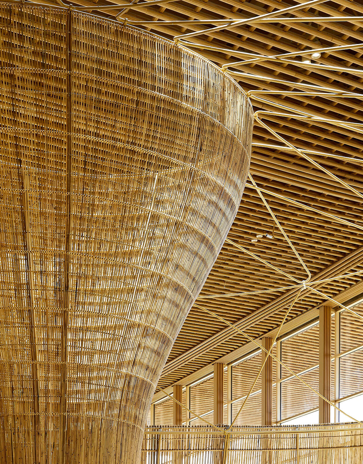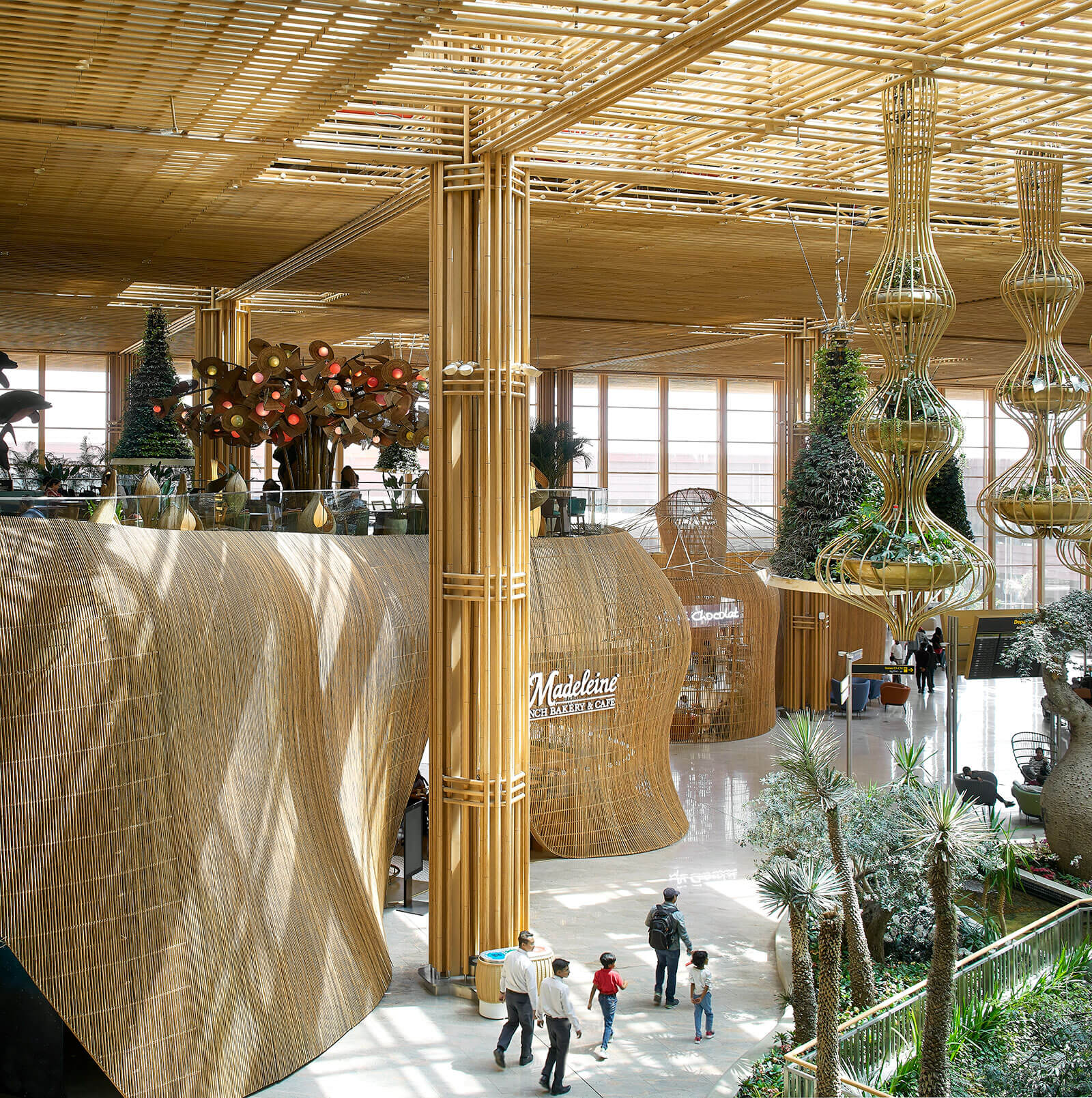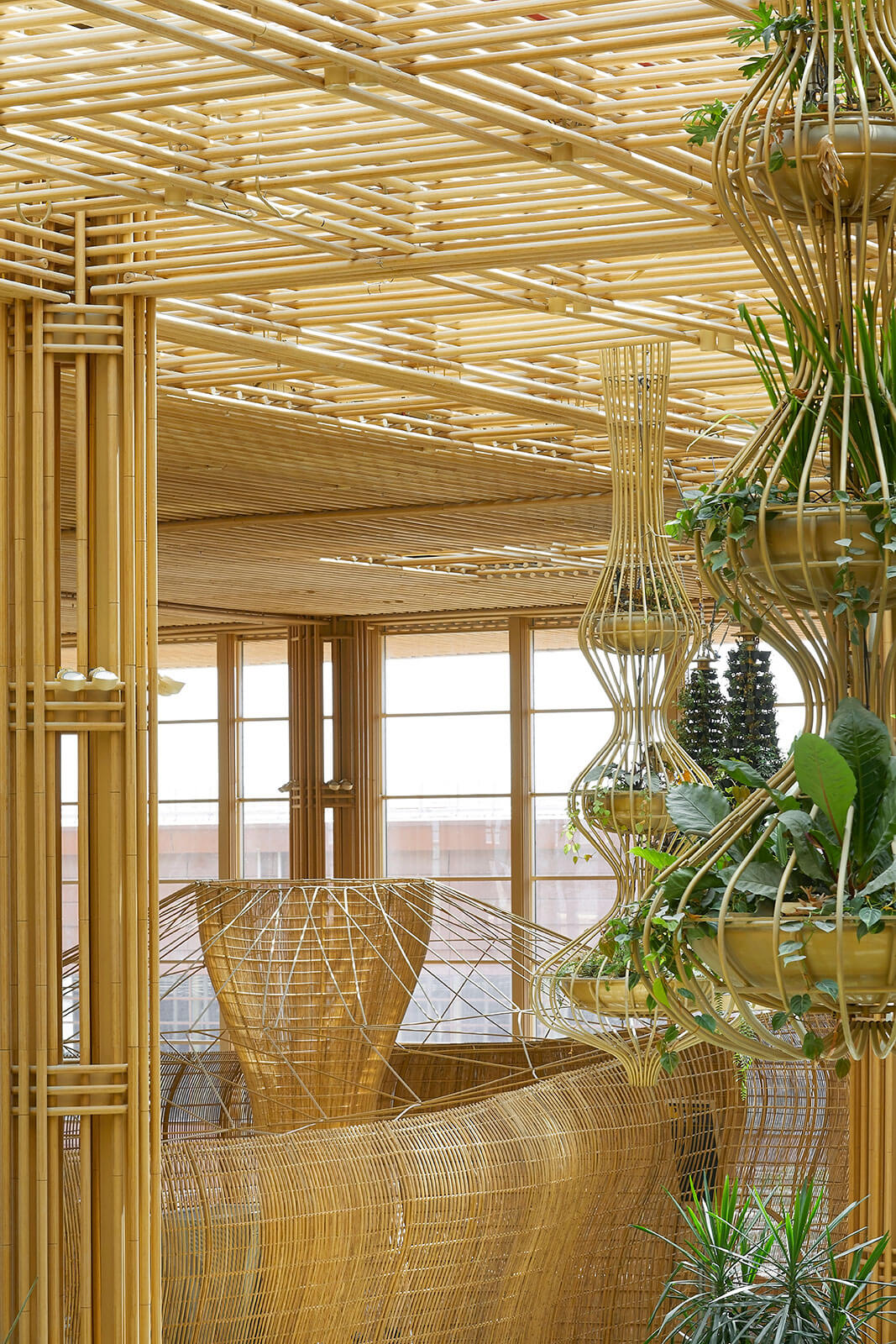 In the garden city of Bengaluru in Karnataka, Enter Projects Asia (EPA) illustrates the structural qualities of rattan outside this context of wellness architecture and implants it in the urban context of the city. The post-security departures area of Kempegowda International Airport's Terminal 2 features a 12,000 sq.m. space with retail, hospitality, and lounge areas, animated by a cluster of five rattan pods interspersed with green spaces.