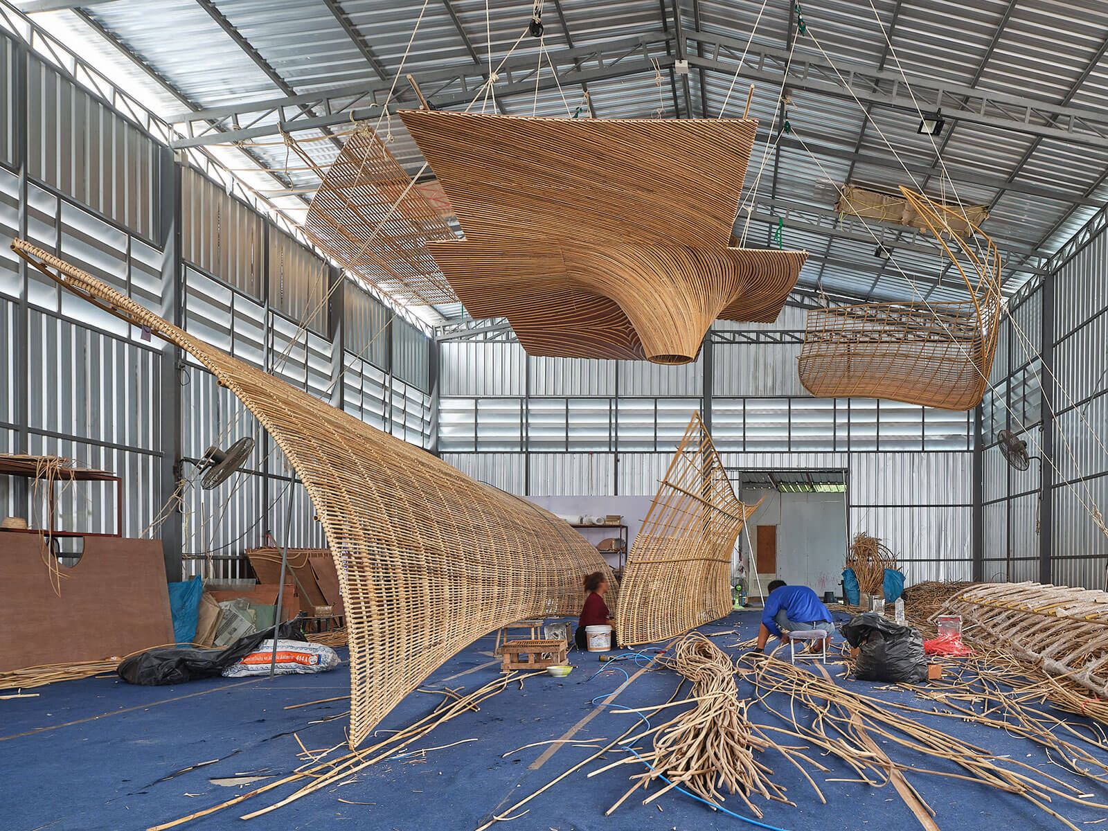 Handwoven at the studio’s factory in Bangkok, each section of the individual pods is a parametrically simulated solution and represents the merger of traditional crafts with state-of-the-art technology on a naturally occurring and renewable material. Constructed as a composition of rattan poles reinforced by a cross-weave, the form of the pods emerges from a curvilinear screen enveloping orthogonally planned interior spaces. The density of the weave thus varies to conceal or reveal the spaces inside, such that it is, at places a wall, a screen, and at others, merely a threshold.