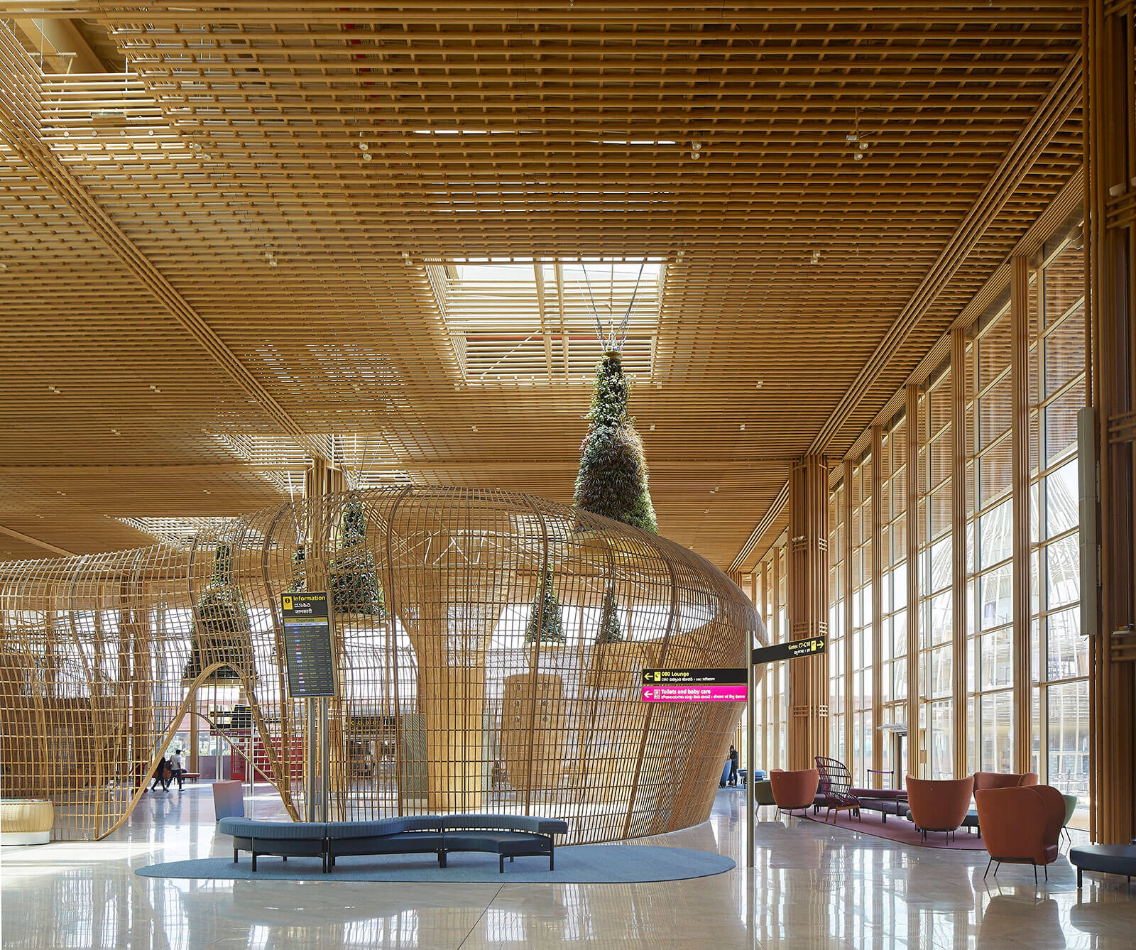 In this context, airport design using tenets of sustainable practices and transitioning to sustainable fuels are essential strategies to offset aircraft emissions. Airports worldwide are adopting methods to reduce their industrial carbon footprint. The International Airport in Cochin, India, for instance, generates 100 per cent of its energy through renewables with the installation of solar panels on the airport buildings and surrounding land. Similarly, San Francisco Airport, in addition to using renewables, employs mapping and modelling tools to optimise its airfield layout. Airports are also embracing the principles of a circular economy, reusing materials, reducing waste, improving recycling, and committing to zero waste to landfill. The practice of their architecture too thus requires urgent management of resources, waste, energy and cost, while maintaining healthy indoor environments, through enduring innovation in sustainable practices. A holistic sustainable design therefore would integrate intrinsically ecological local cultural references—whether material, stylistic or conceptual—with contemporary techniques. In this context, natural materials such as bamboo, rattan, timber, clay, etc., which are not only renewable but also have a lower carbon footprint, are emerging as—almost pervasively so—ubiquitous building materials.