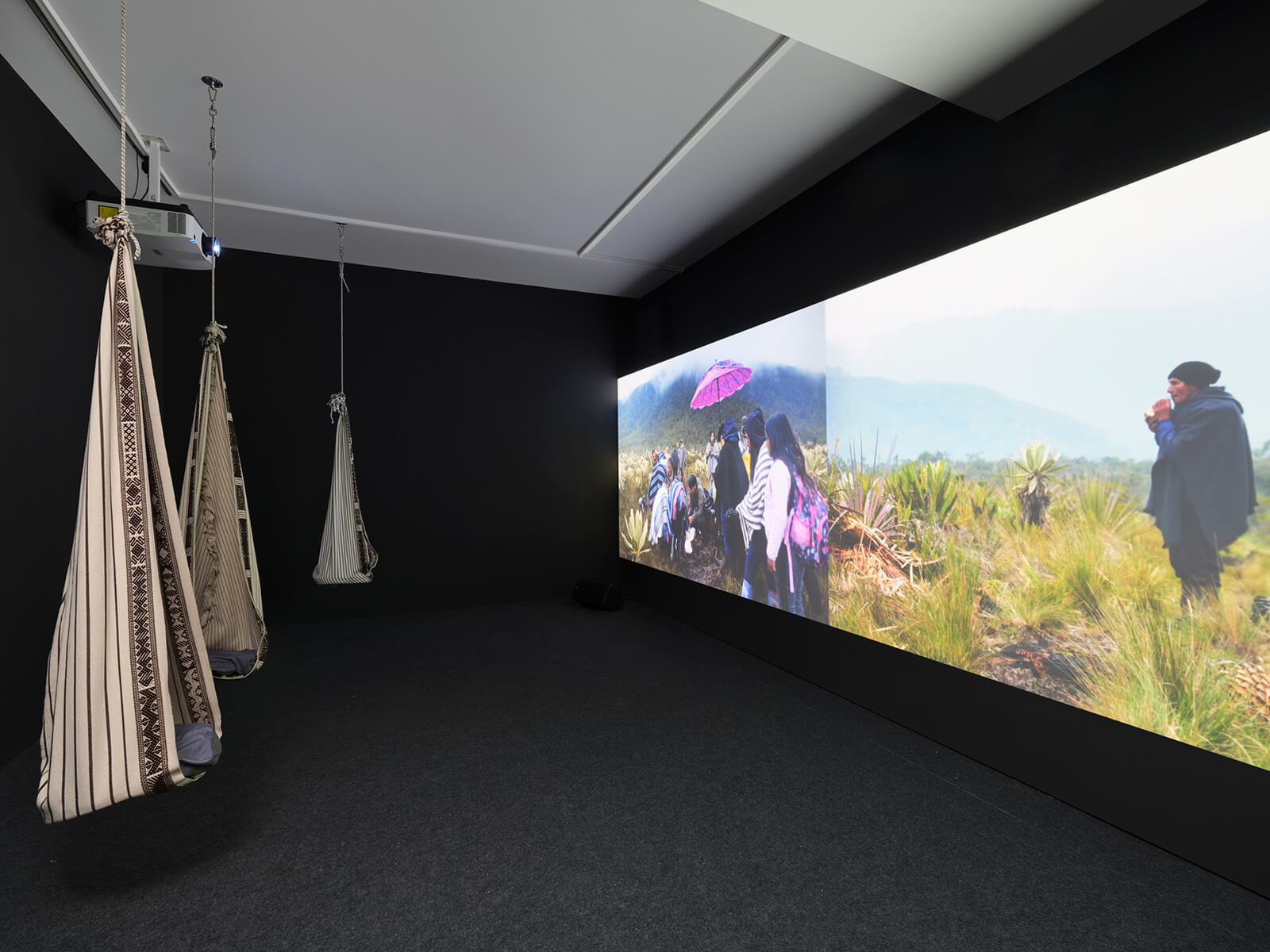 In this sense, the artist's role as an explorer (or counter-explorer) in the films, traversing difficult terrain, is not to take possession of the place or the unique encounter. It's about the body as an archive within an eco-social fabric. The artist elaborates, "The works featured in the show trace a 10-year period of movement, dislocation and re-rooting—leaving Colombia, my birthplace, and returning after more than a decade to reconnect with territories I had become estranged from. That process involved more than geography or site-responsive research; it was about re-establishing ties to the biocultural memory of the Putumayo mountains, rivers and residents, and engaging with the rainforest not as a symbolic landscape, but as a living, spiritual and contested territory."