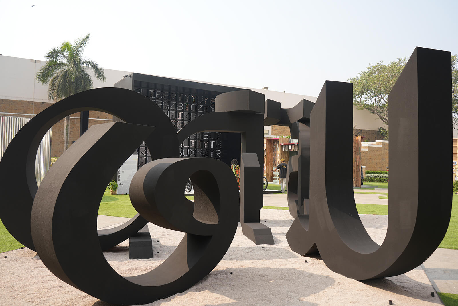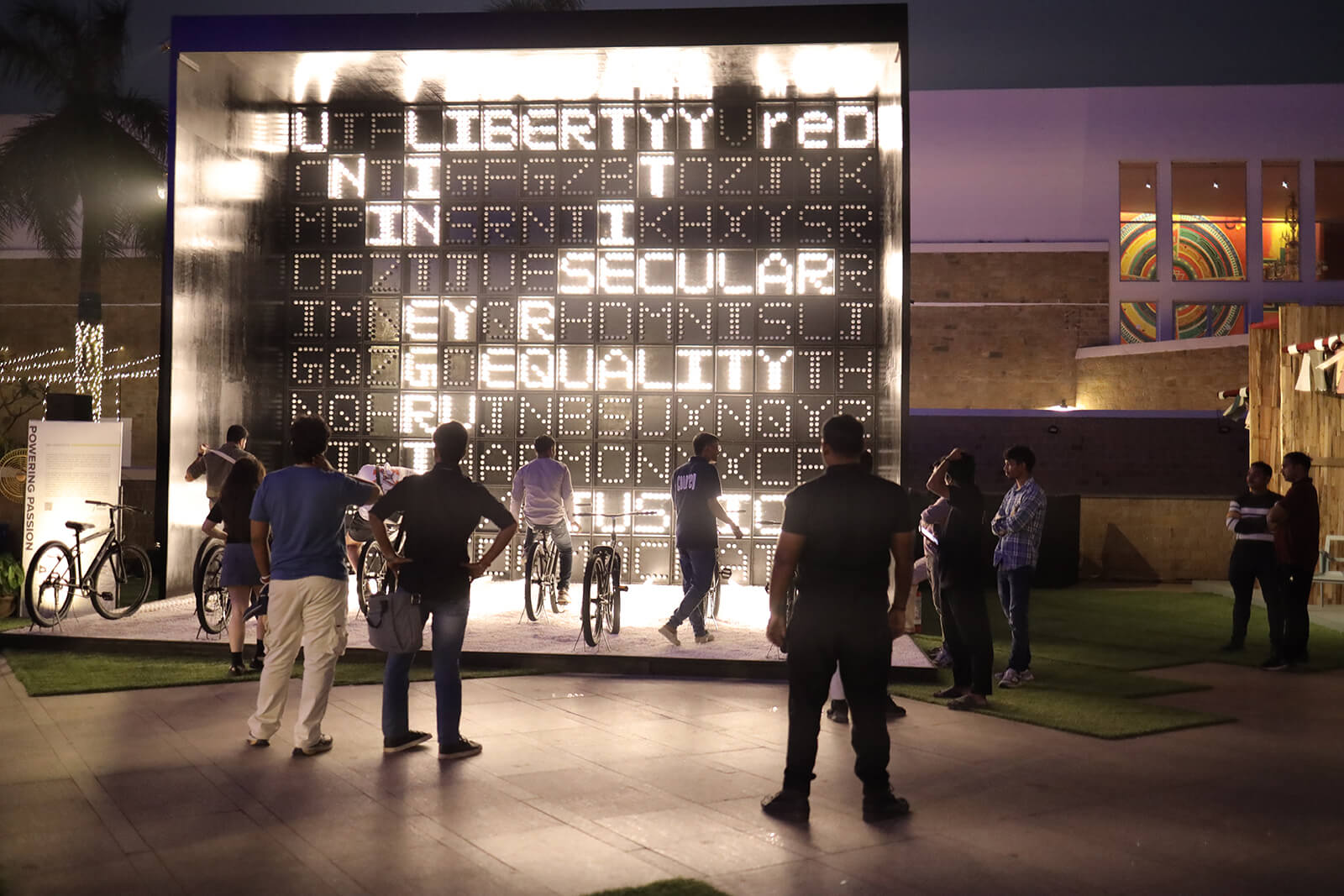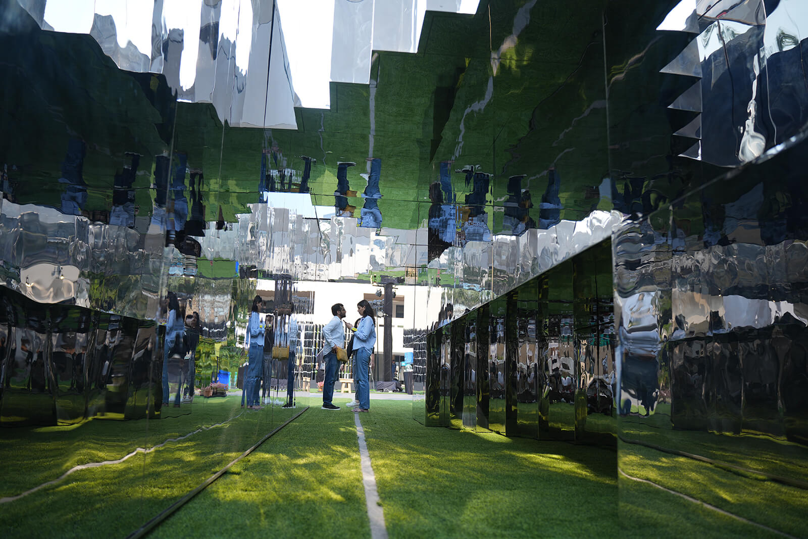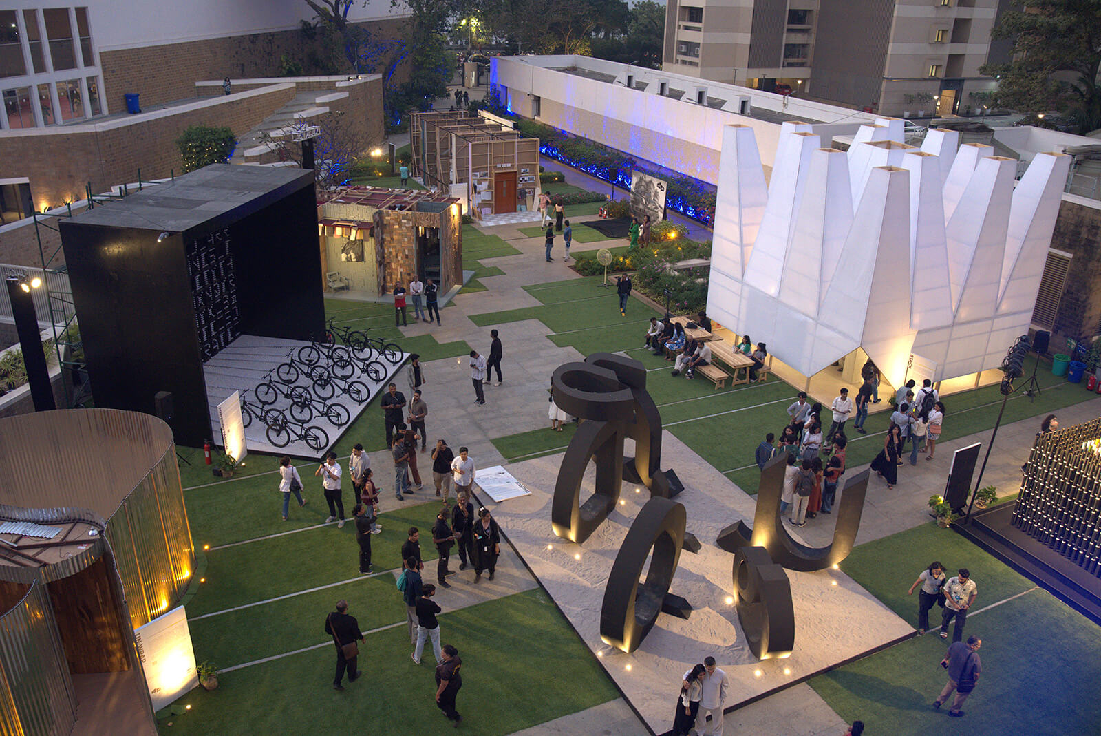 Walk of Frames by Manish Gulati of M:OFA and production designer Shruti Gupte, supported by ICA Pidilite, compiled a series of five standalone facades as doorway(s) to transition into the Pavilion Park. Rounding out an expansive field of view ahead were Conserve by LOCO Design in collaboration with CAUR embodying ‘waste made beautiful’; Dialogue by Tania and Sandeep Khosla supported by vis à vis India, comprising the ‘Curry Display’ typeface framed by black serpentine volumes perched weightily on sand; Un-Wrap by Matharoo Associates, with the support of Artize by Jaquar Group, re-interpreting the Klein bottle with a signature pivoting doorway; and Ananta by SHROFFLEóN, supported by Jindal Stainless, flipping a Baoli (stepwell) on its axis to contrive a space of endless reflections using stainless steel.
