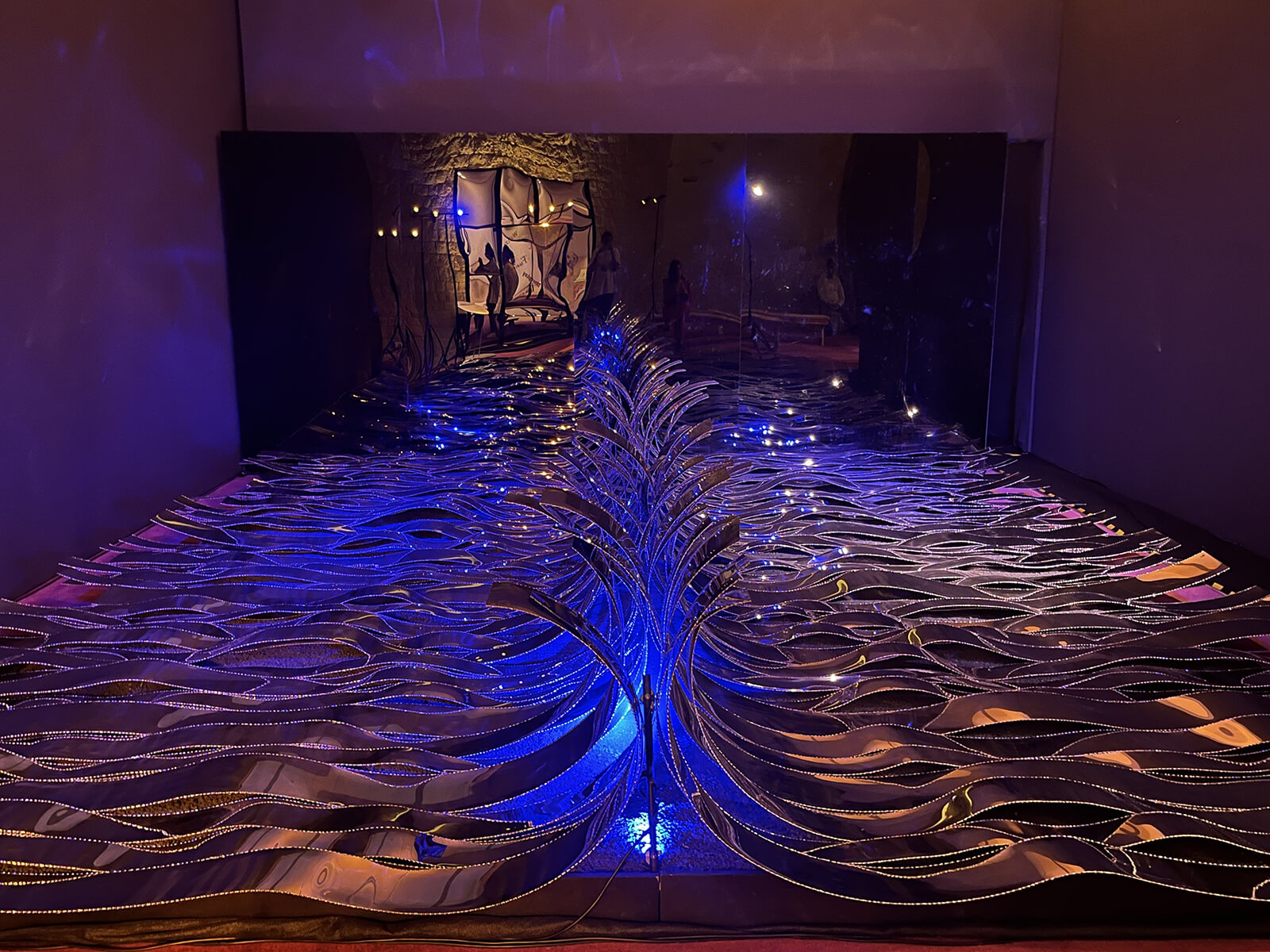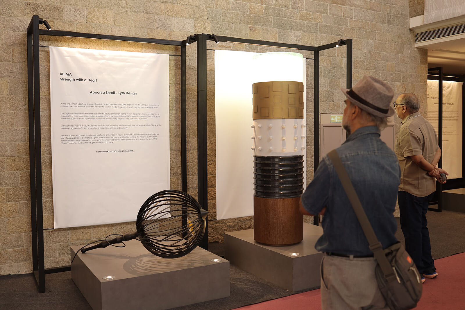 Two indoor installations completed the Pavilion Park, revealing their cinematic visions within the NCPA building. Supported by Valueline and FTS by Sharmilee, The Five Virtues by Supraja Rao in collaboration with Shabnam Gupta, Quirk Studio, Apoorva Shroff, Swanzal Kak Kapoor and Kanchan Puri, reinterpreted the enduring virtues of the Pandavas through a feminist design lens. Upstairs, the iridescent installation Tidal Tango by Vibhor Sogani mimicked the ebb and flow of the ocean waves and the cinematic allure of their rhythm and repetition.
