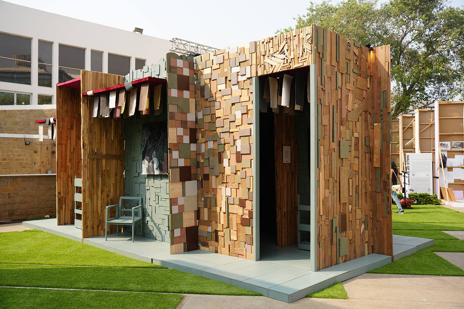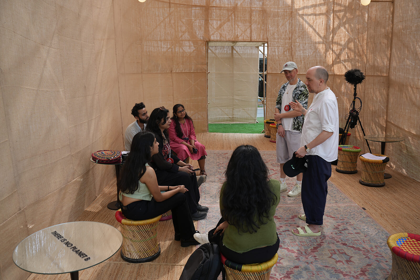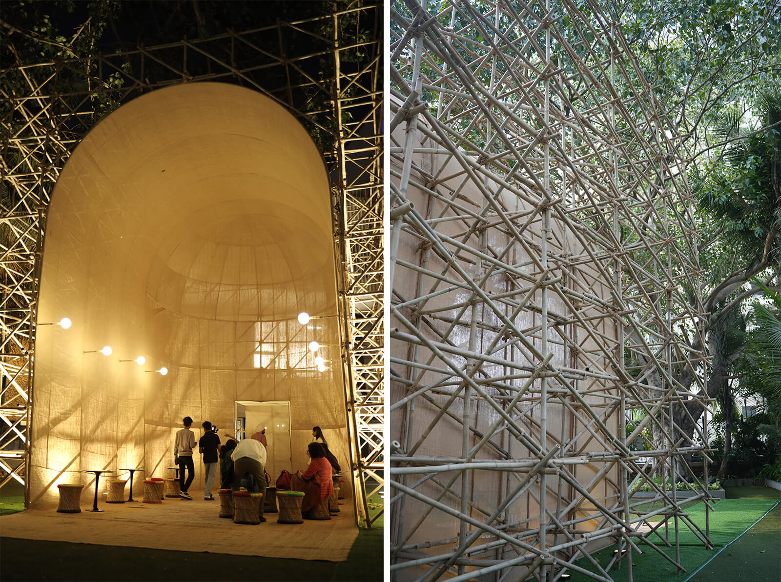 Other pavilions delved into more real-time activation than sculptural edification, including a particular crowd-favourite—Jaquar’s Powering Passion by reD Architects—combining cycling with a word puzzle inspired by the Indian Constitution’s Preamble; along with UHA’s Stack, a glowing theatre-within-a-theatre supported by the Saraf Foundation, housing artefacts essential to ‘Bombay-living’ under eponymous towering stacks. The pavilion screened documentaries reflecting the cultural significance of Mumbai by Virtual Bharat, Dinesh Choudhary, Sneha Patil, Kutuhala Films, Martin Edström, Saraf Foundation, Sudarshan Sawant, Dhanesh Gopal, Panjaj Rishi Kumar and The Heritage Project. Particularly expansive in geographical approach and outlook was a screening of Saraf Foundation's film, Sagarmatha Next Director's Cut, by Nundrisha Wakhloo. Across the Experimental Theatre’s garden, There is No Planet B, designed by SPASM Design Architects (led by Sangeeta Merchant and Sanjeev Panjabi) and supported by Jaipur Rugs and FCML, reimagined the ancient Indian Chaitya through bamboo scaffoldings and strands of jute fabric, forming a natural sanctum.