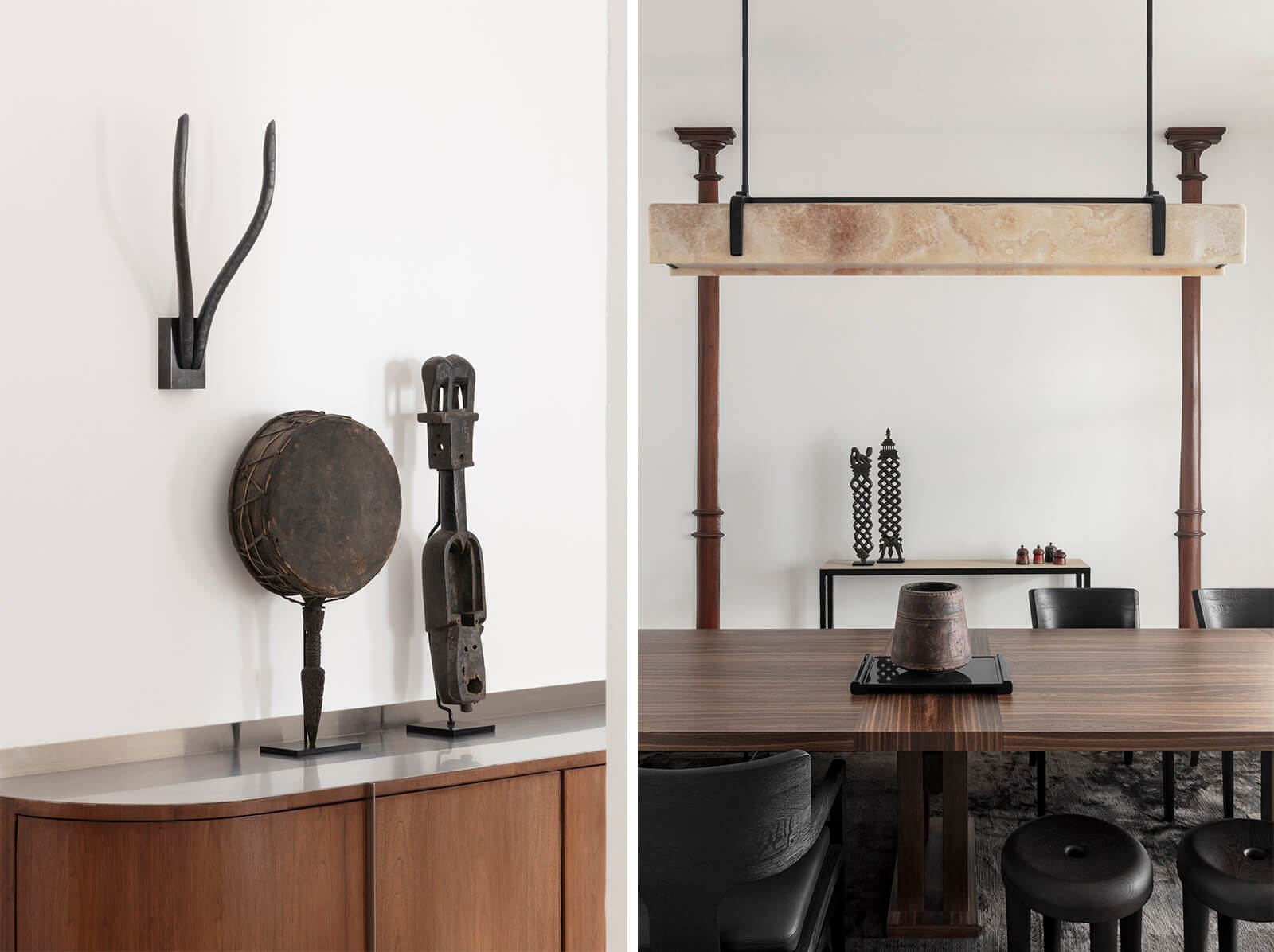 Complementing these are some of the brand’s table designs, such as the Craie table, combining a wooden top with a ceramic base, the Naja coffee table and the bronze Trépied side table. Each setting showcases the brand’s emphasis on timeless pieces that can be combined and passed down for generations. Apart from the signature works on display, the exhibition also features new work, including the Sienne lamp, a sculptural ceramic piece designed in collaboration with Paris-based ceramic artist Karen Swami. As Caillaud elaborates, Liaigre’s minimal designs are complemented by Indian antiques—sourced from stores like Phillips Antiques and Mahendra Doshi—adding a distinct charm to the exhibition. Other new works on display include the Don sconce in bronze, the Emae wall candle holder in bronze and stone and the Mezzo lamp in glass and bronze.