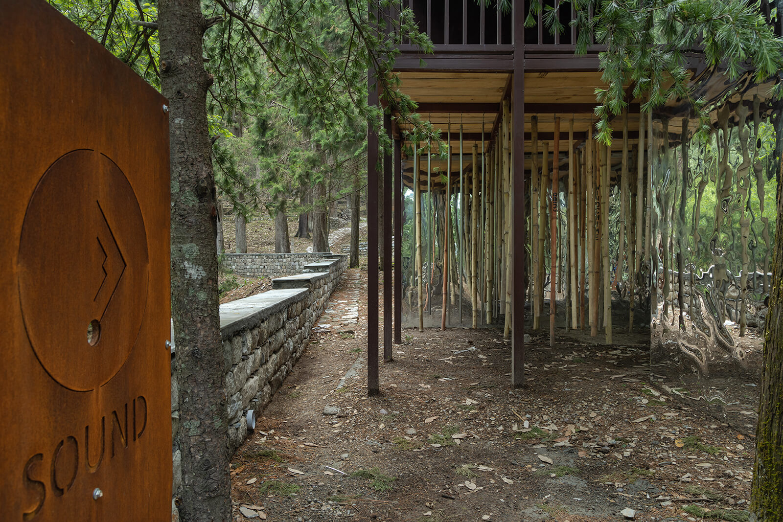 Sensorium Park, as the name suggests, is structured as a sensory landscape rather than a visually dominant one. A series of small, dispersed installations engages the body and senses without foregrounding formal gestures or symbolism. A mirror-clad cabin reflects the surrounding forest, creating a brief shift in perception that redirects attention back to one’s presence within the landscape. A human-scale bamboo wind chime produces sound that merges with ambient forest noise. Further, elements crafted in Deodar wood introduce incense into the scheme while textured stone and bark surfaces invite touch along the pathway. A garden of edible fruit and berry trees adds taste to the narrative, integrating a sense of nurturing into the experience of the site.