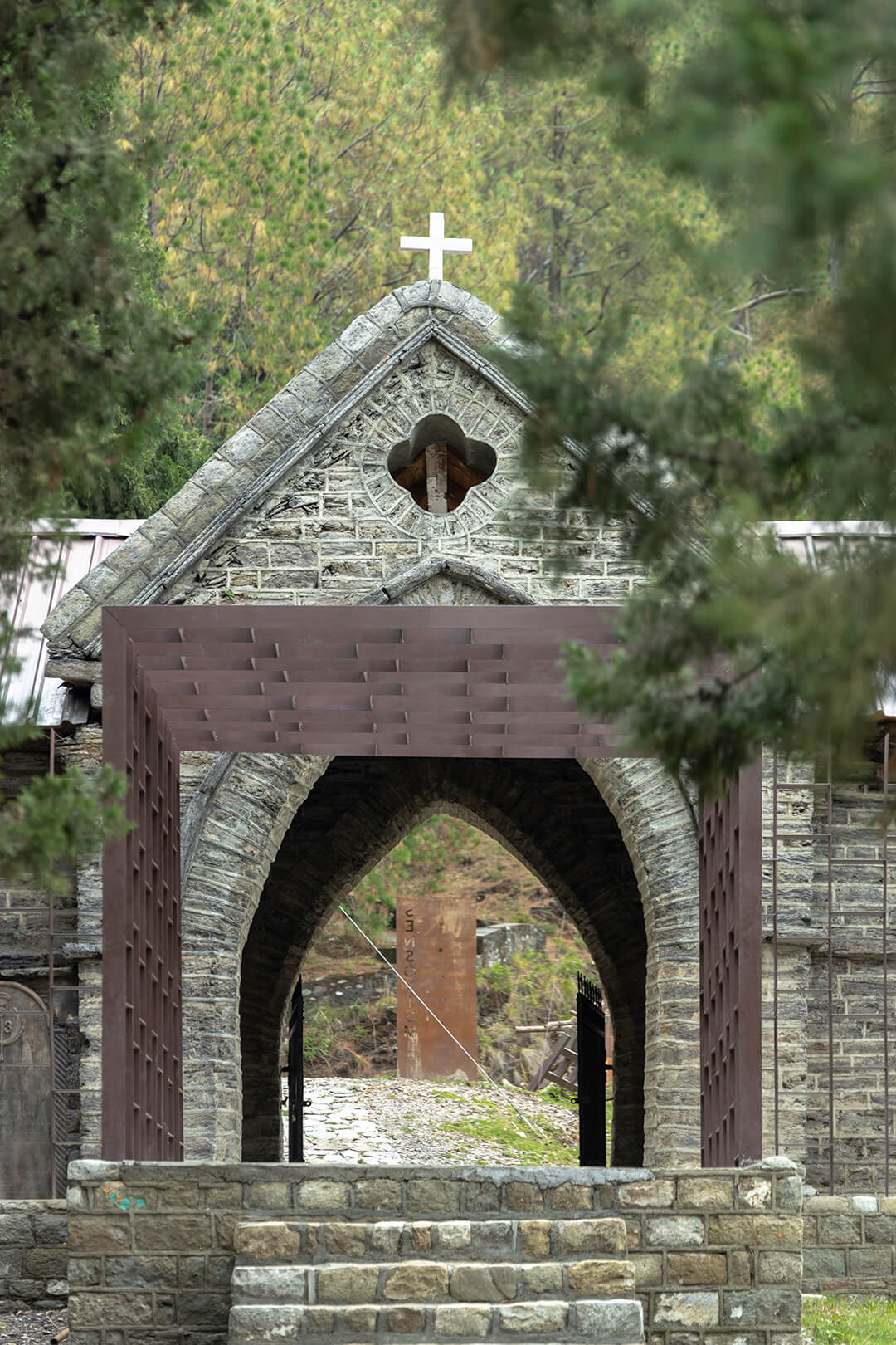 Movement through the park is organised around a meandering stone pathway that moves organically through the forest. The path is intentionally non-linear, encouraging slow movement and allowing visitors to encounter the site gradually. At the entrance, the original stone gate of the cemetery has been carefully restored. A contemporary metal frame draws attention to the portal without altering its character. Within this stone enclosure, the wooden roof has been reconstructed using material techniques consistent with the site.