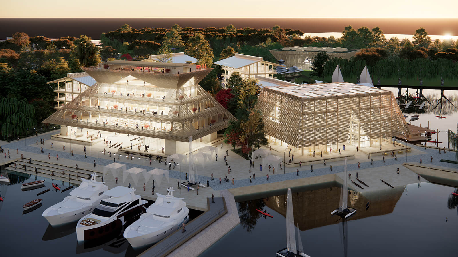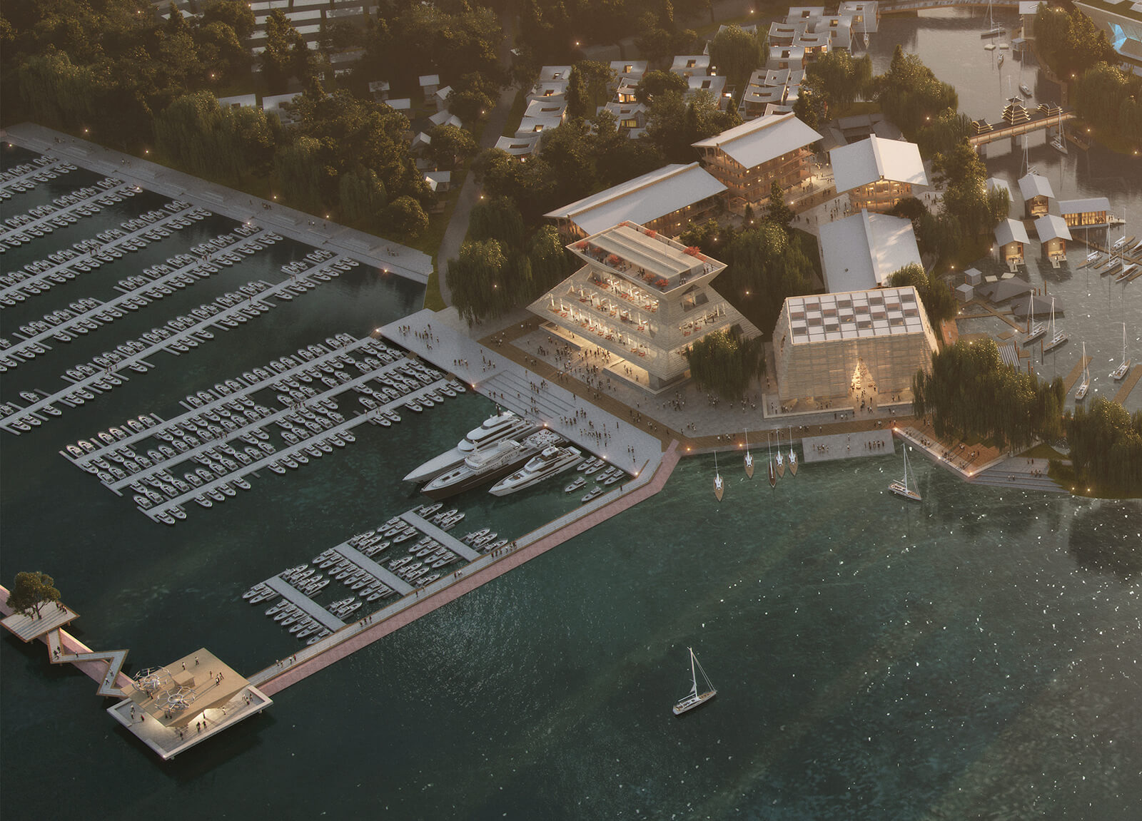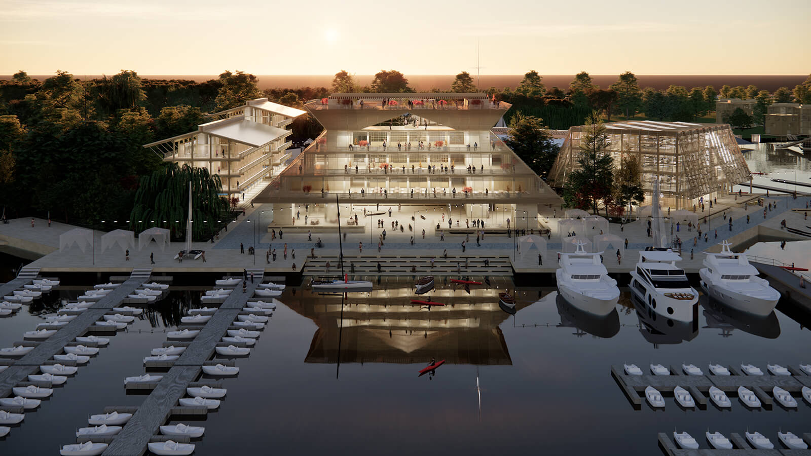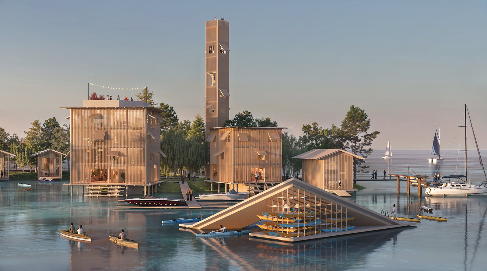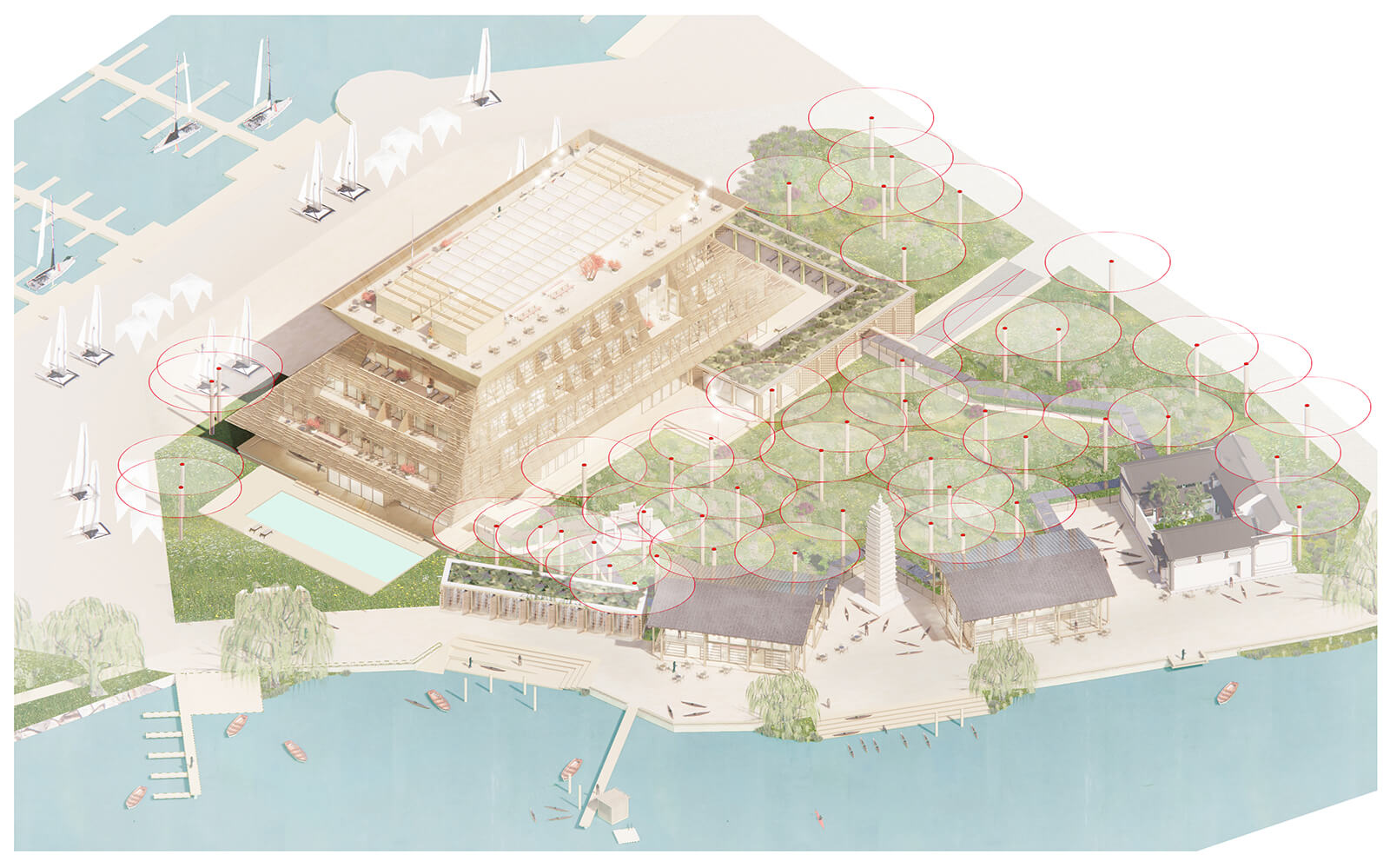 A cluster of buildings and landscape architecture constitutes the project’s masterplan, placed on a series of small islands by the lake. Designed as the primary attraction, the pavilion architecture will combine hospitality, administrative and commercial spaces, in addition to a meeting centre, an observation tower and spaces that offer panoramic views of the natural and urban landscape. A ceremonial space will be carved out to host regatta prize-givings, media events and a members’ lounge and a museum to honour Shanghai’s maritime heritage and culture.