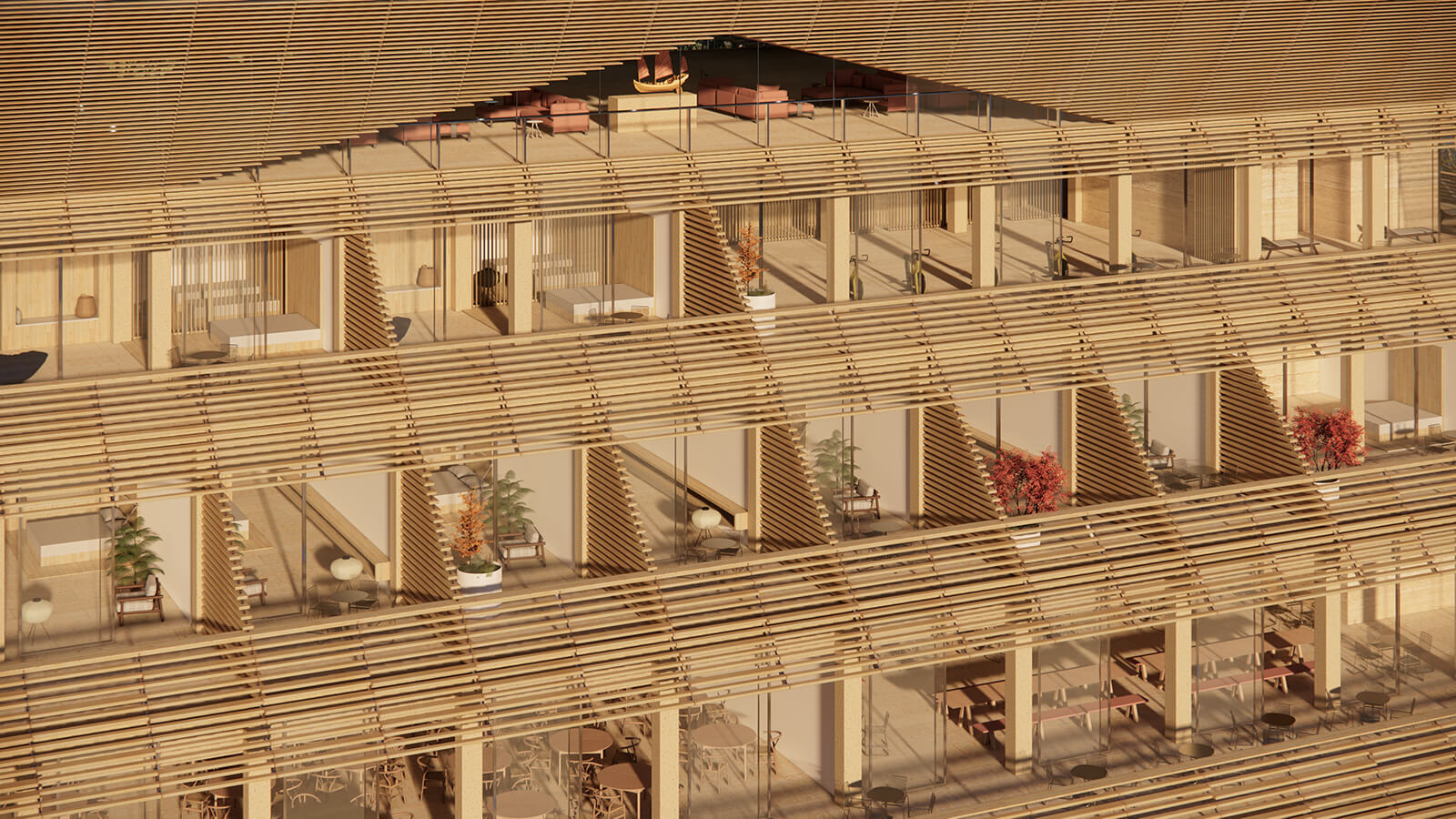 Scott: The veil was iterated several times, even at the early design phase, to prove that it could work. The tension with it is that the building’s sole purpose is about uninterrupted views out to the sport, but we need it to be sufficiently screened off to create meaningful shading. The solution was to accept that on the facades facing the water, we would pull back the veil and have open terraces at eye level to maximise views out, limiting the batons to a higher portion that only partially shade the glazing in those areas. Maintenance and durability were early concerns with this kind of double-skin facade. All of it is served by decking for ease of maintenance and cleaning, so it becomes a relatively simple building to operate. We did discover that the use of a ceramic baton on another project nearby quickly degraded with the humidity. Again, that was looking back to find a solution, where ceramic on traditional roofs is glazed to avoid being impregnated by the damp air. The added benefit is that the glaze also picks up a kind of shimmer and motion on a waterside site like this.