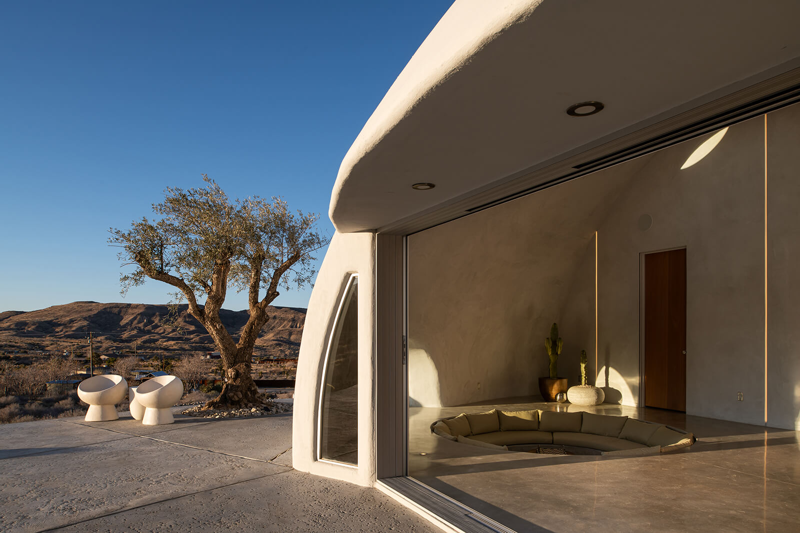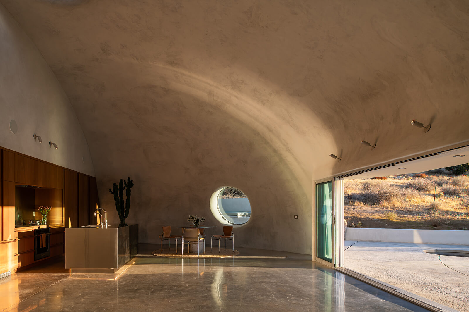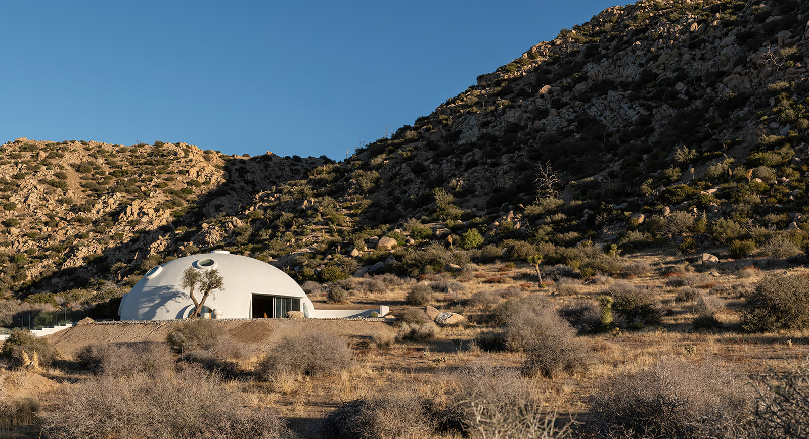 Diverging from conventional desert architecture, Dudik envisions a vacation rental where visitors feel ‘transported, grounded and connected’. Situated minutes away from an unincorporated community, Pioneertown—built in 1946 as a live-in motion picture set—Hata Dome does not exist in isolation from its context, despite being a lone structure. Overlooking the 1880s-themed settlement, the private residence acts as an alternative, futuristic dreamscape against the nostalgic illusion of Pioneertown.