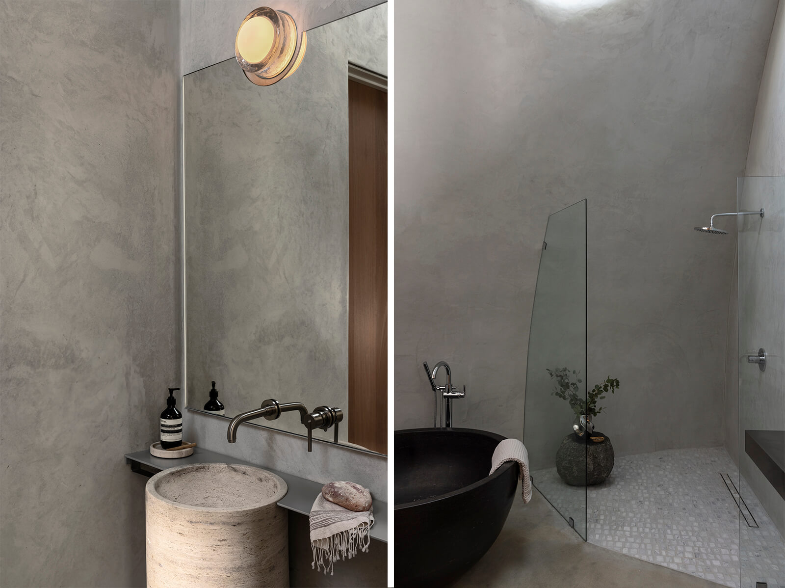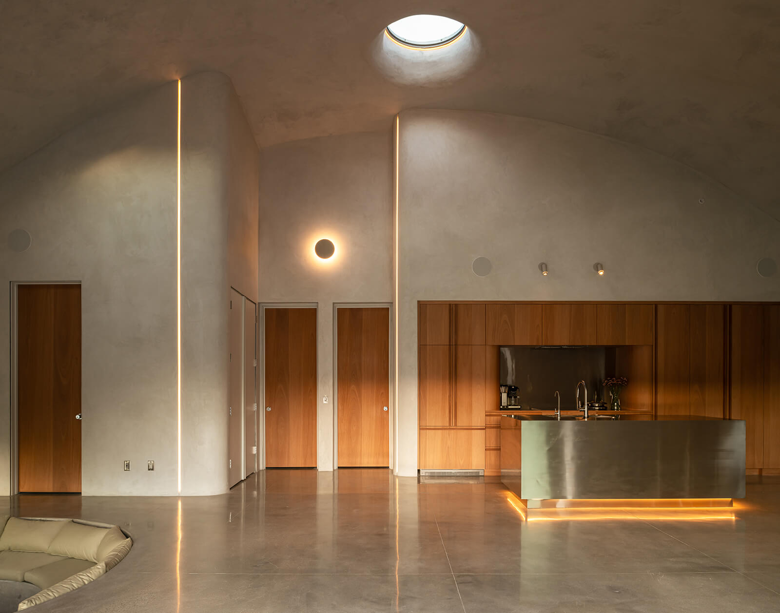 Primarily made of airform foam, rebar and shotcrete, Hata Dome towers at 16ft and features tactile stucco surfaces that invite exploration. “Working with shotcrete and foam construction required a specialised team. Weather, access, permitting hurdles and sourcing materials that aligned with the vision all tested me, but the end result was worth every obstacle,” Dudik reveals. The home’s lighting design, marked by recessed lights that render a diffused glow, plays a vital role in spotlighting its monolithic form and spatial design. The kitchen naturally draws the attention of the visitors with its lustrous stainless steel backdrop and island, complemented by African mahogany cabinets.