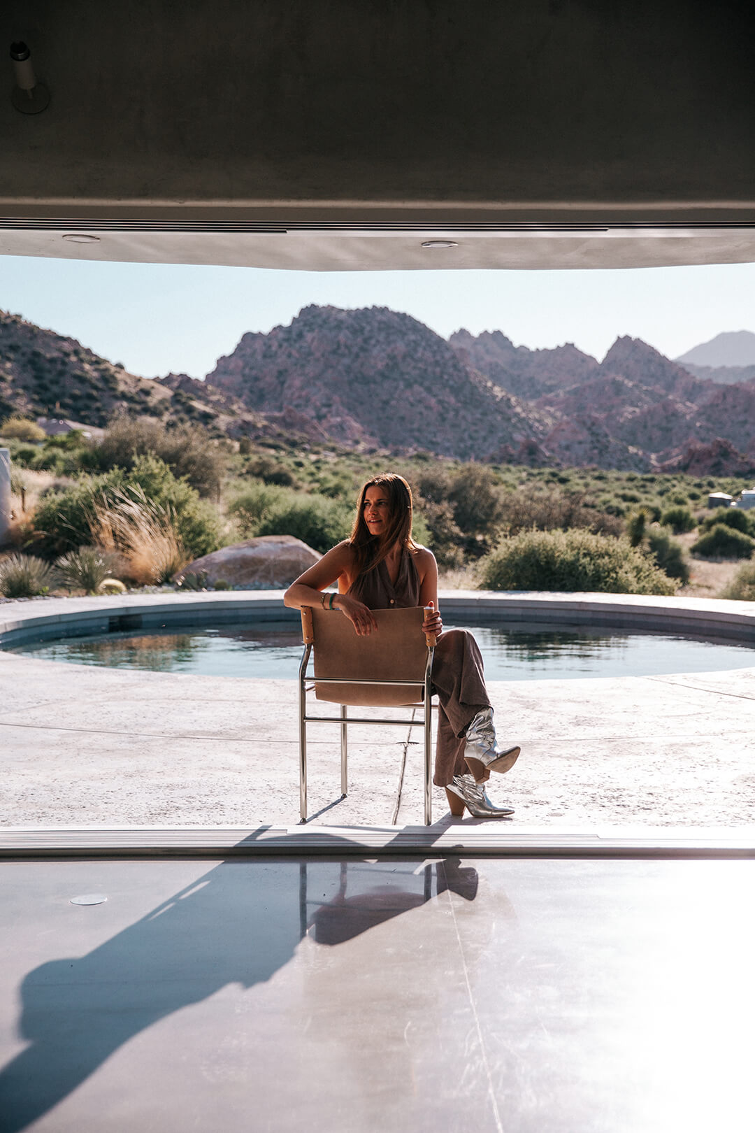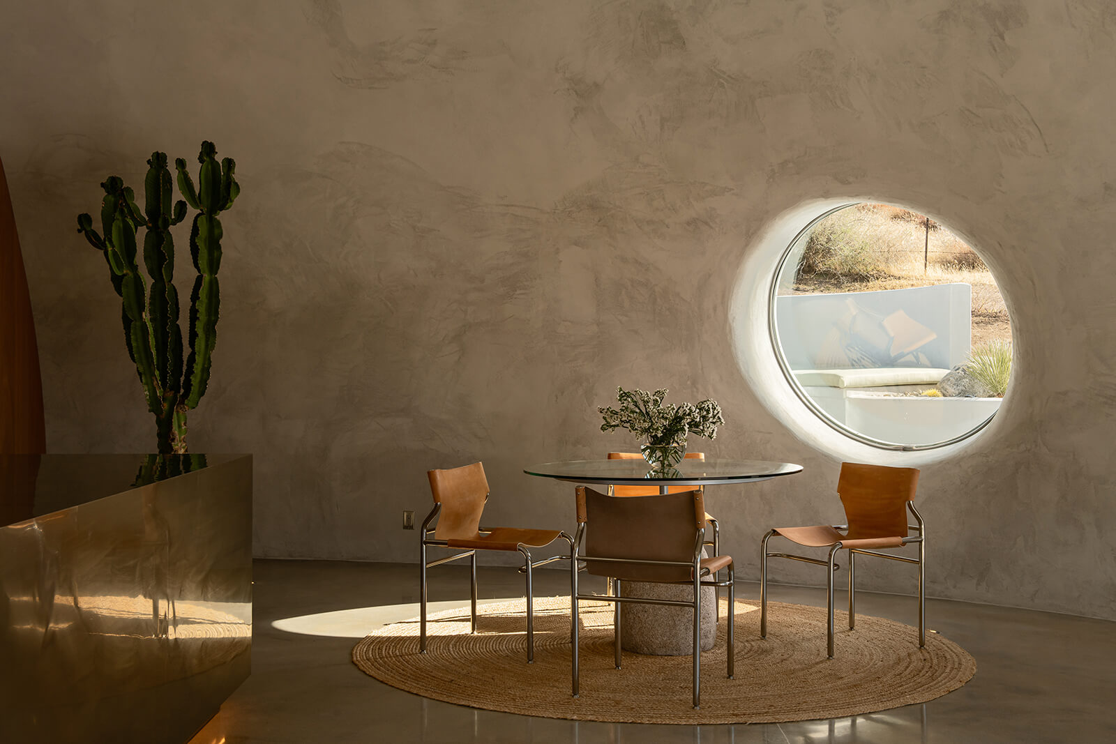 Dudik took inspiration from the surreal natural landscape of Pioneertown to create a form that reciprocates its boulder-strewn terrain. “The vision for the dome was to create a sanctuary—something that felt both futuristic and ancient, like a structure unearthed rather than built,” Dudik says. Spanning over 1,700 sq ft, the monolithic dome sits as a massive sculpture, accommodating two bedrooms and bathrooms and a large hall with a sunken living area, a kitchen and a dining area. A pool, a hot tub, a fireplace and a couple of lounging areas populate the outdoors, acting as vantage points that connect one to the natural landscape.