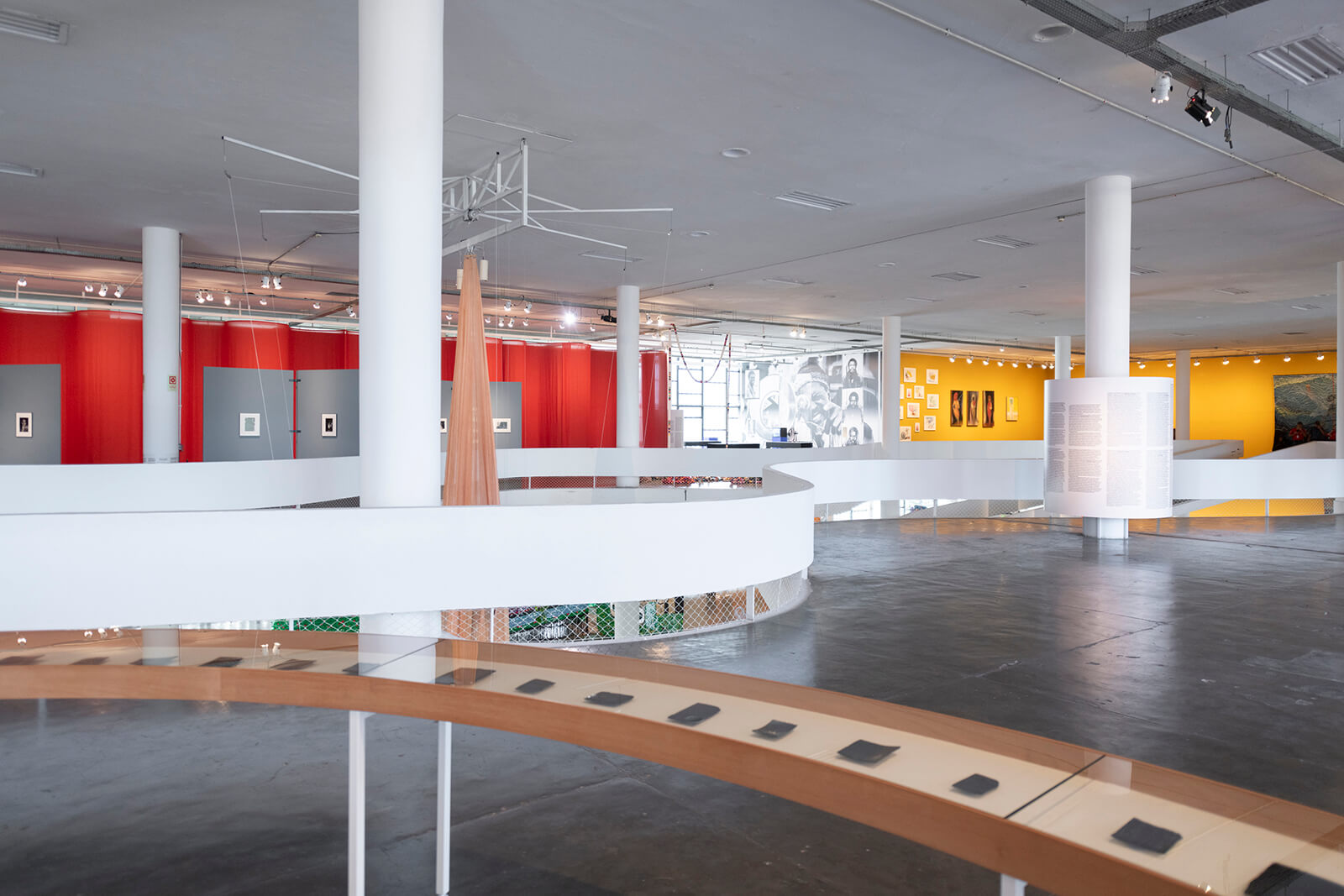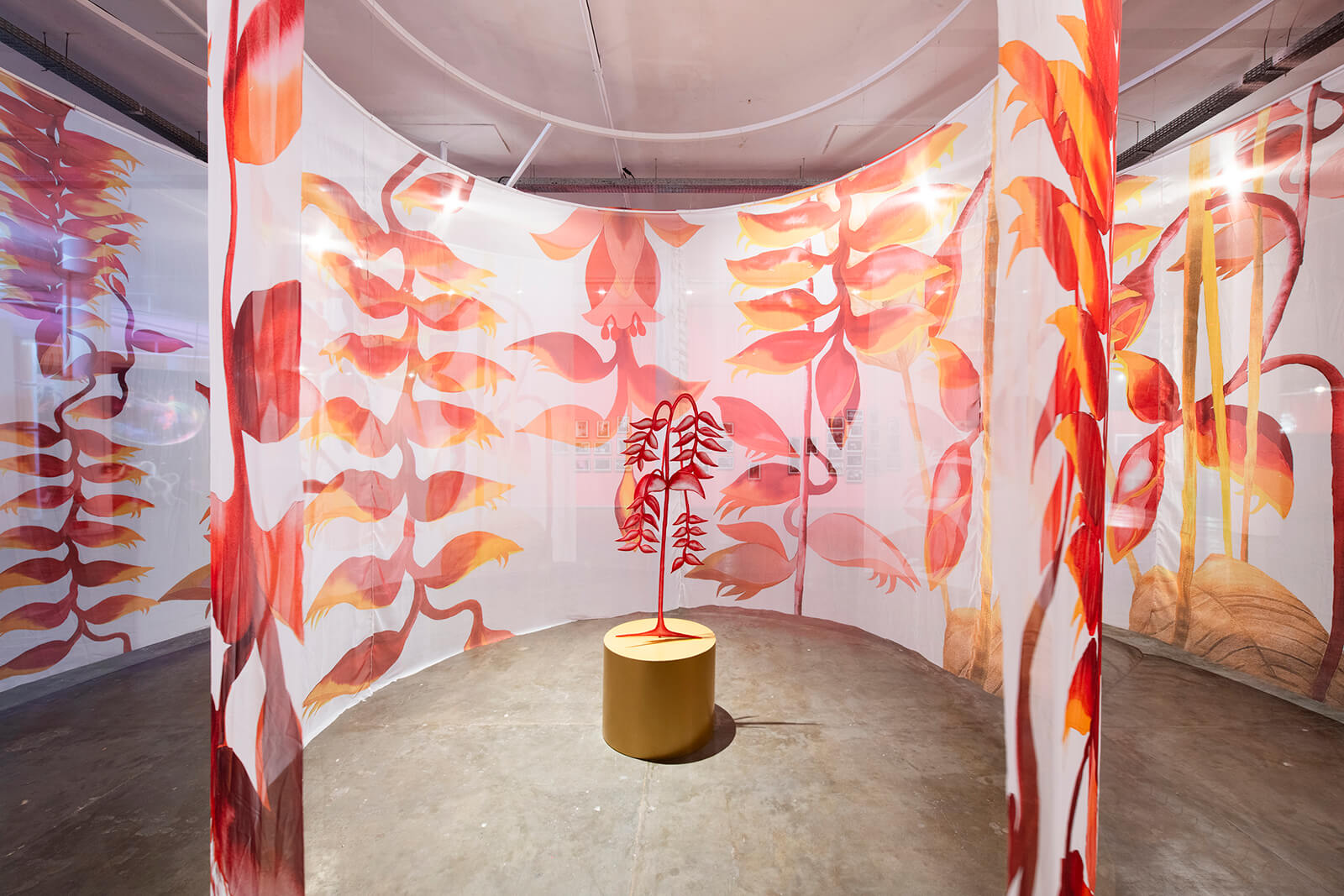 One of the most acclaimed names in the biennial is German photographer Wolfgang Tillmans, also known for his contributions to pop culture, like the cover of American singer-songwriter Frank Ocean’s Blonde. For this Bienal, Wolfgang presents a new video installation inside a dark room, where two perpendicular walls are transformed into vast projection surfaces. The images—shown individually or in combinations of pairs, trios or overlays—bring together scenes from urban daily life and from nature: mud sticking to a boot, fallen leaves on dry ground, a train suspended over a narrow stream, colourful folders in a cabinet, the crown of a tree, a rushing waterfall, a piece of fruit hanging from a branch. These images are interwoven with an equally diverse soundscape: the blowing of wind and the chirping of crickets mix with engine noises, the distant passage of an aeroplane and human snoring. Also surrounded by curtains, in her own personal space, is the work of the Cuban artist María Magdalena Campos-Pons, who for 40 years has created works based on an autobiographical narrative rooted in her family histories and her origins as a Cuban artist, descended from Hispanic and Chinese immigrants and from Nigerian slaves brought to the island in the 19th century. The space dedicated to Campos-Pons is organised as a large circle where translucent fabrics printed with floral motifs descend from the ceiling in concentric rings. At the centre stands the sculpture Macuto (2025), made of metal painted in warm tones of red, orange and yellow. The piece, inspired by the form of a tropical heliconia, serves as the ritual axis of the space, around which the public can sit. Periodically, diffusers release fragrances of herbs and spices associated with healing practices, while loudspeakers project chants, voices and Afro-diasporic rhythms, reinforcing the work’s communal and spiritual dimension.