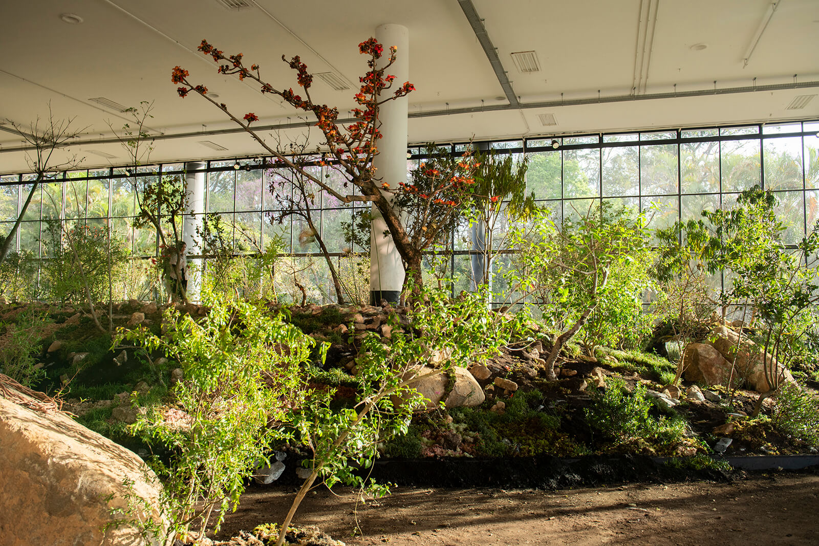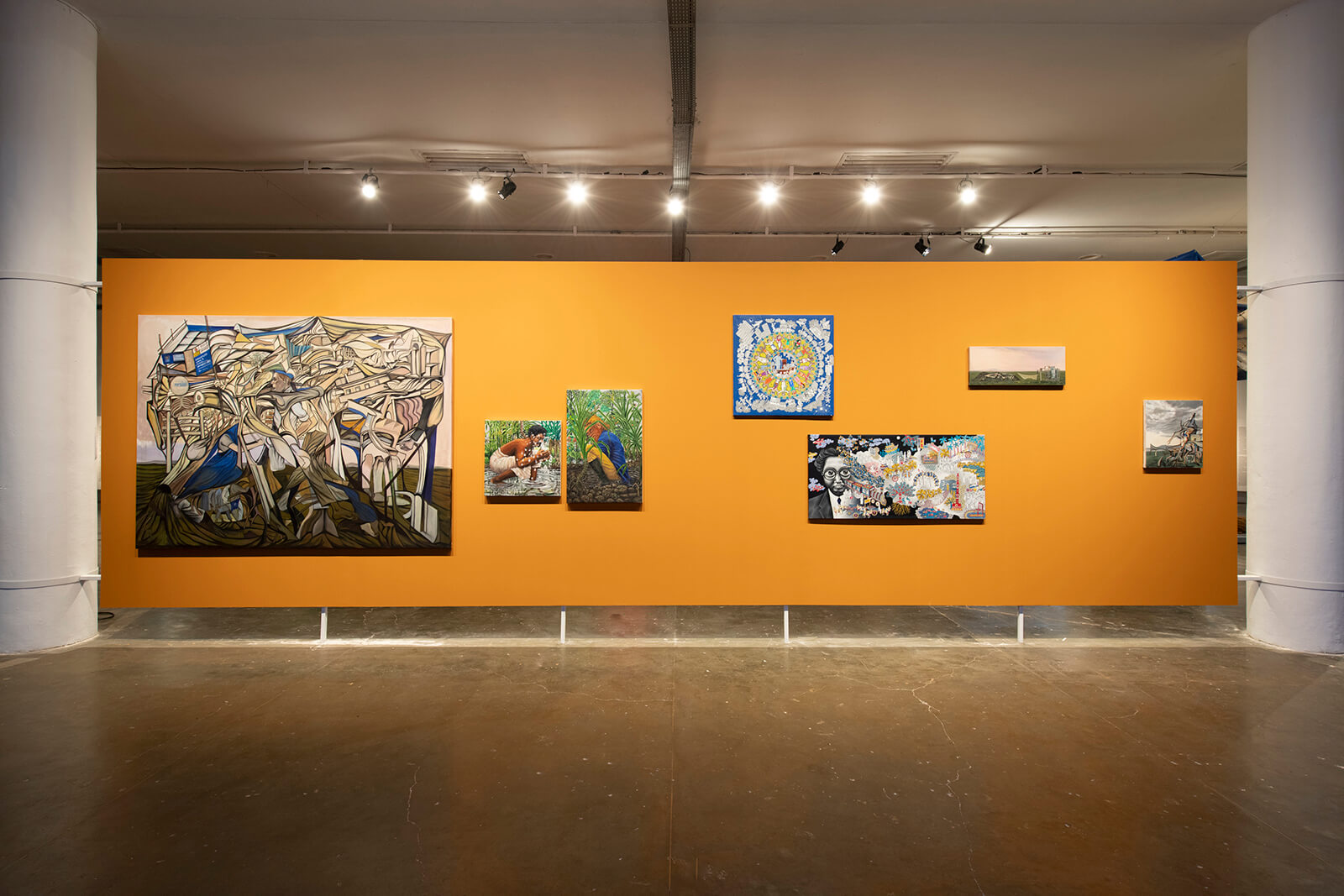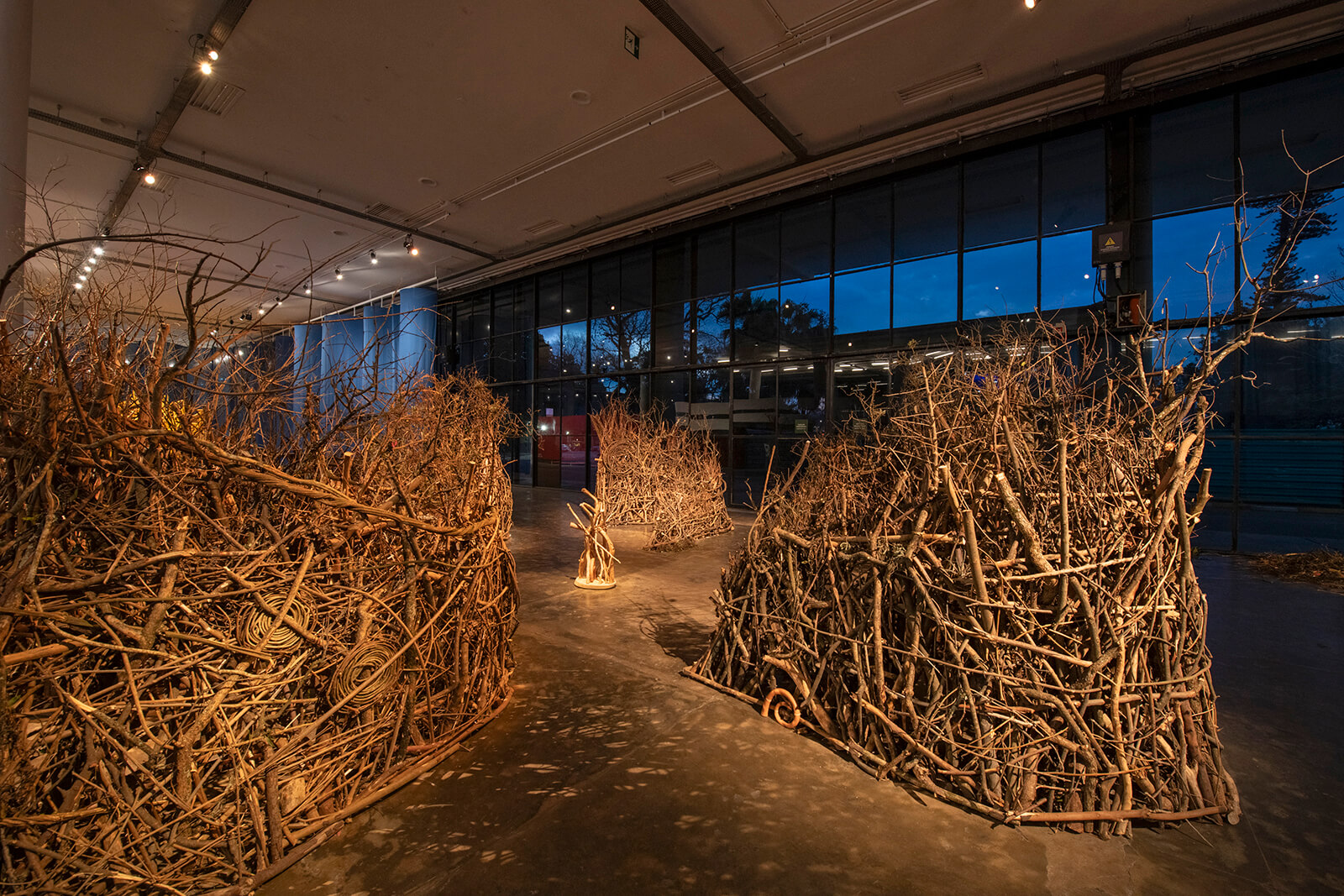 On the third floor of the pavilion, visitors encounter Brasilidades by Brazilian artist Moisés Patrício (1984, São Paulo). In his practice, he takes ceramic elements from the Candomblé religion, such as clay bowls, jars and vases, and wraps them until they are completely covered with different elements, making their form or trace disappear and rendering them unrecognisable, as an allegory of the disappearance of the symbolic marks of Afro-Brazilian cultures in the construction of the country’s imaginary. Likewise and located directly opposite this piece, is the installation Catástrofe orquestra #1 by the self-taught Brazilian artist Antonio Tarsis (Salvador, 1995), who grew up in the Arraial do Retiro favela in Salvador and began his artistic practice at the age of 14. His work consists of a series of panels made with reddish matchboxes that hang from the ceiling, together with fragments of the same material scattered on the floor. Here, with a landscape that alludes to the material impact of humanity’s ecological footprint, the artist affirms the persistence of life, which resonates in an almost silent symphony, like the little matchboxes as they move. Meanwhile, a labyrinth made entirely of tree branches and clay constitutes the work of Sallisa Rosa (Goiânia, 1986; lives in Rio de Janeiro), who questions the ancestral memory present in elements of nature, like branches, clay, rivers.