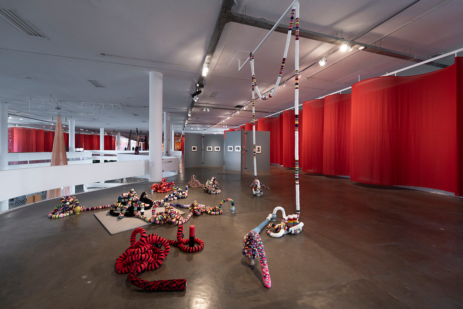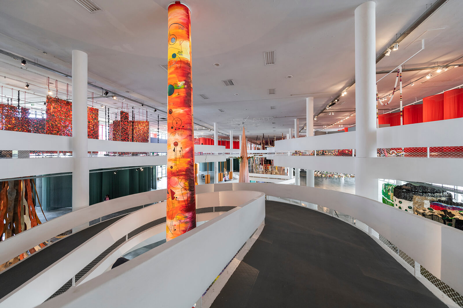 The building's facade, covered by a monumental curtain of multicoloured braided fabric strips, already hints at the spirit of the exhibition. Inside, there is an abundance of works made from everyday, fragile, discarded or recycled materials that evoke both global economies and forms of resistance. The pavilion’s interior features undulating ramps and curved mezzanines that contrast with the rigidity of its orthogonal exterior grid. The biennial opens with an immersive installation by Precious Okoyomon, a queer artist of Nigerian origin based in London, who creates an unsettling forest with plants and living materials that mutate over time. The scene, somewhere between beauty and menace, reminds us that nature is an active player and not just a backdrop.