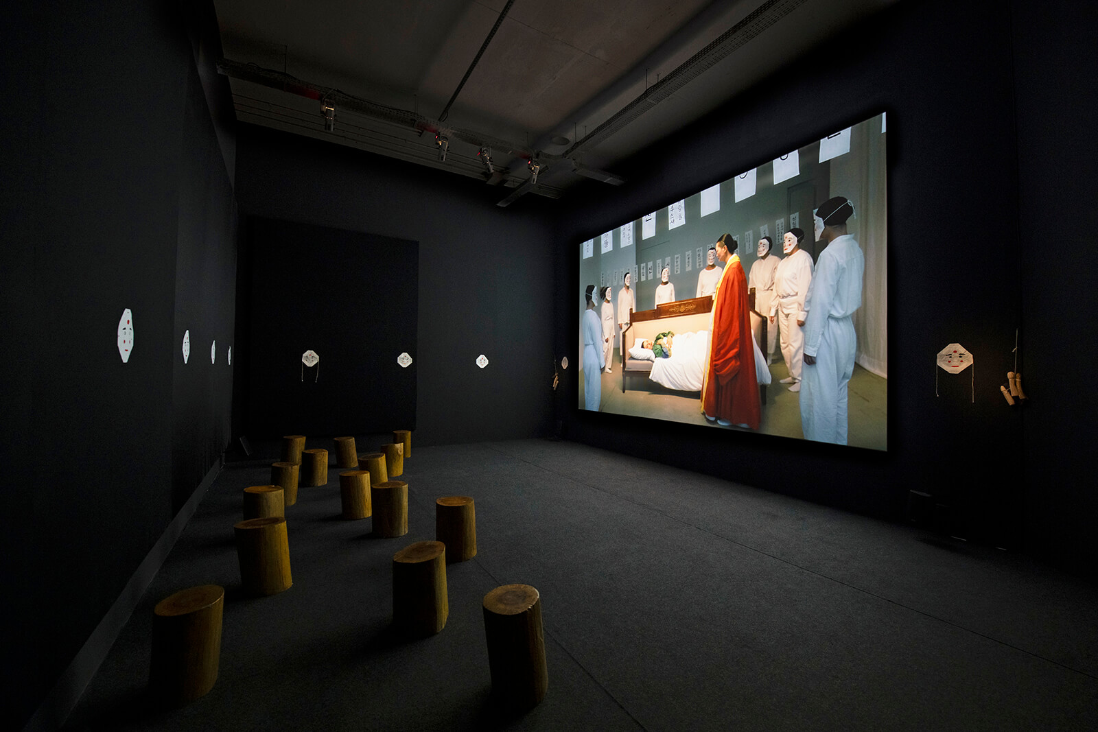 Berlin-based Sara Sejin Chang (Busan, 1977) works across film, writing, installation and performance to question how Eurocentric systems of categorisation and racialisation continue to shape contemporary society. In her video installation Dismemberment (2024), she creates the allegorical figure of a gallerist named Europe, while introducing Korean deities such as the Great Grandmother (Daesin Halmeoni) and the Mountain God (Sansin). The clash between Enlightenment rationality and Korean shamanic ritual materialises in a healing ceremony, in which the ailing Europe is dismembered and purified. In this way, Chang interweaves the European and the Korean to point to the persistence of colonial hierarchies and, at the same time, proposes their symbolic transformation.