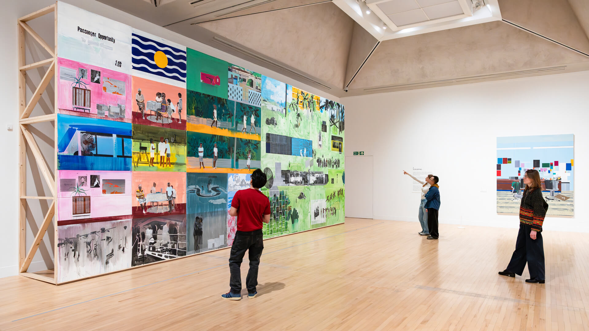 One of the largest works in the exhibition, Passenger Opportunity (2024 – 2025) builds on this idea of the threshold, reimagining Jamaican painter Carl Abrahams’ 1985 murals created for Jamaica’s Norman Manley International Airport. The 24-panel piece serves as a montage of the journeys, emotional and geographical, undertaken by Jamaicans emigrating to Britain historically and in the present day. The painting’s scope and the decision to break it into panels give it a filmic quality, becoming a kind of montage. Amid verdant settings filled with lively community are monochrome panels of people on journeys, sitting together but looking straight ahead. The left side is sparser—homes left behind, people gathering in parks, at dinner tables and airplane ramps, finding themselves alone in taxis or absent from sitting rooms and seascapes. In one panel, two people hold onto each other tightly, the gravity of their embrace speaking volumes about the pain of separation, even as they appear to have escaped it.