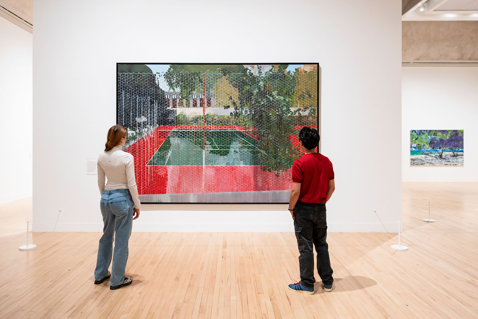 A tennis court, fresh-looking, surrounded by green flora, with neat concrete steps leading away from it to a modern, grey building in the background. The mood of richesse and relaxation never reaches the viewer, broken up into little hexagonal tiles by a foreboding chicken-wire fence. The viewer is placed in the shoes of a person on the outside, the scenery in a different world, even as lush plants spill out of the constructed barrier. This is Country Club Chicken Wire (2008) by British artist Hurvin Anderson, reflecting on his experiences growing up in a Jamaican family in Birmingham and his time as an artist-in-residence in Trinidad. The painting is part of Hurvin Anderson, a survey exhibition of the contemporary artist’s paintings at Tate Britain. Tropical flora rendered in vibrant greens evokes the Caribbean even as they are interrupted by dilapidated, greying hotels; figures from family photographs recur in paintings, sometimes as children, other times as adults, at times both, holding hands and intersecting, linear time be damned. The exhibition, like Anderson’s practice, loops and shuffles through times and spaces, embracing overlaps, repetitions and blurs as England and the Caribbean, childhood and adulthood, departure and return layer over each other endlessly, creating lingering compositions that commit the foggy nostalgia of memory to canvas.
