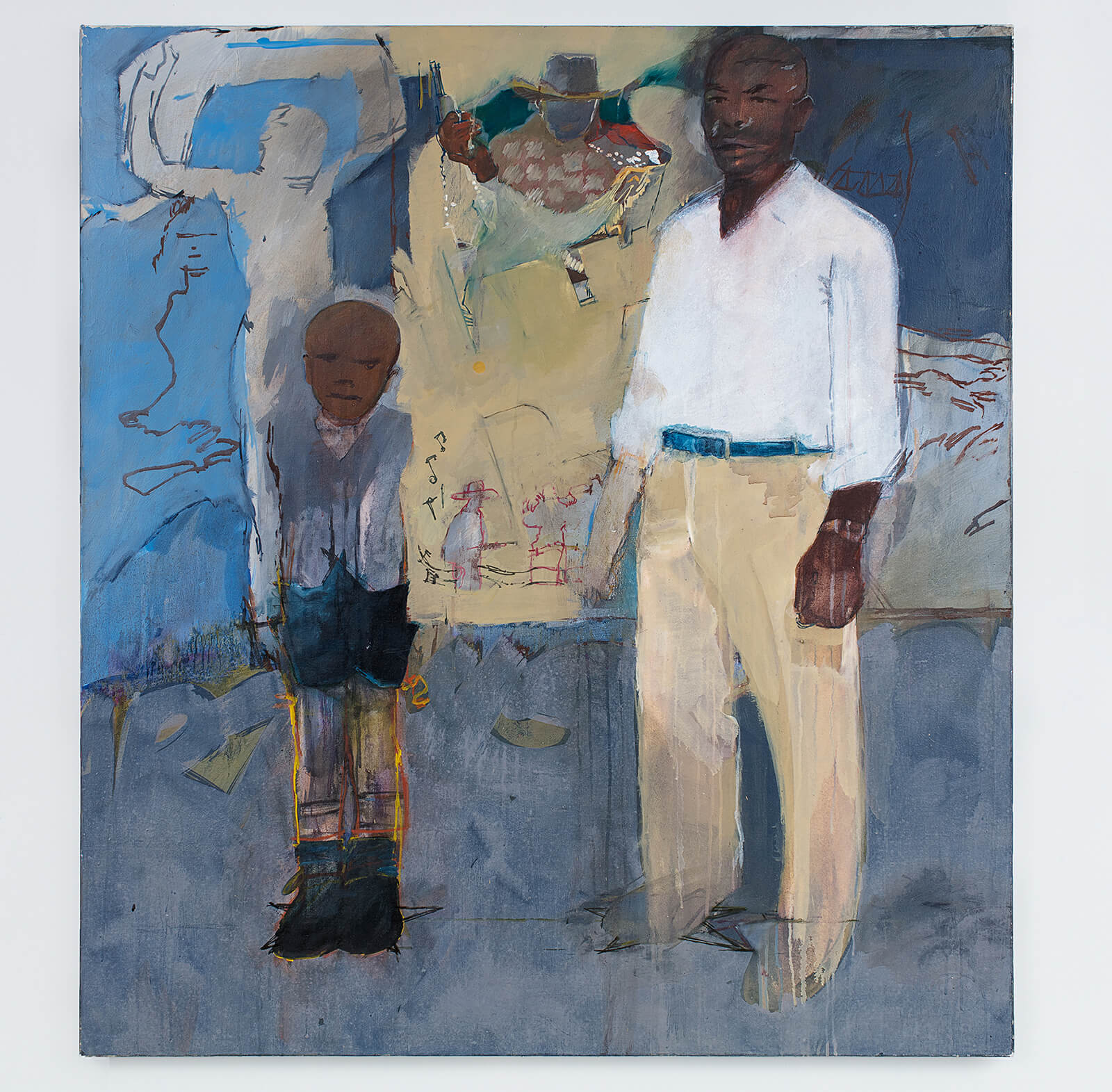 Many of Anderson’s works are set in Birmingham, where he grew up, though they maintain a continuity in tone and colour palette with his other works. Ball Watching (1997), an earlier work, is based on a photograph of Anderson and his friends looking into a pond that their football has been kicked into during a friendly game. Despite the intense cultural Britishness of the image and the moment, the figures staring pensively into the blue lake in the foreground—in search, in wait, at a threshold—evoke a deeper feeling, tying into the migrant experience shared by many communities in the world, caught between worlds.