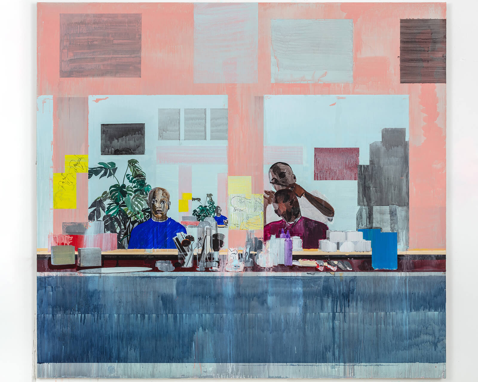 Spaces—the feelings they evoke, who they include and exclude—are integral to Anderson’s work, with one of the best examples of this focus being his barbershop series. In a similar vein to his landscapes, he takes the Western tradition of domestic paintings of homes, salons, etc., and reinterprets them through his cultural lens. The barber shop represents a space of socialisation and community more than commerce, a space for intimacy. In Shear Cut (2004), three figures—a barber and two customers, one having his hair cut, the other looking into the mirror, waiting. The former are rendered in spare brushstrokes, their faces mostly a suggestion. The lone figure is shown in greater detail, his eyes striking, seeming to look at the viewer through the mirror. Identity and self-perception are brought to the forefront with his melancholy expression, while the other, more gestural figures bring a more casual, intimate feeling to the scene. Peach tones and translucent blues create a sense of warm familiarity. The potted plants in the composition call back to paintings from a series set in the Caribbean, bridging geographic space with colour and personal references, bringing another world into a Birmingham barbershop.