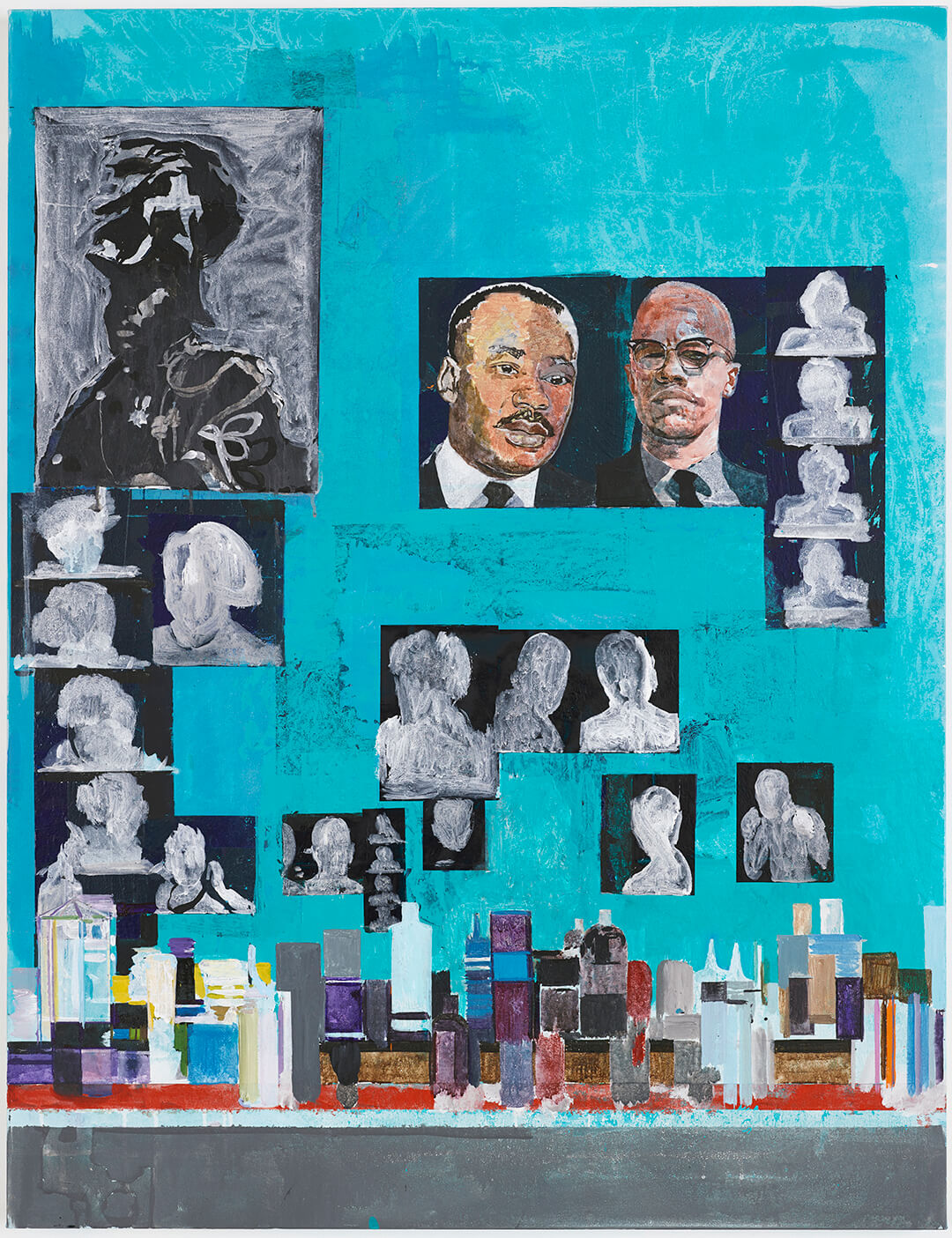 Another work set in the barbershop is the direct and almost confrontational work titled, Is It OK To Be Black? (2015 – 16). The painting shows images of black political icons such as Martin Luther King Jr. and Malcolm X in sharp relief, contrasted with Anderson’s usual semi-abstract or blurred depictions of people. Other images in this more familiar style show the silhouette of cultural icons such as Muhammad Ali, taped up above a slew of hairdressing tools and products. The perspective of the painting puts the viewer in the barber’s chair, placing them in the same position of introspection and questioning as the figure in Shear Cut. The title and use of popular imagery place the painting within a larger discourse of race relations and politics. This is underscored by Handsworth Songs (1986), a film essay by Black Audio Film Collective screened outside the exhibition, contextualising Anderson’s upbringing and experiences in Handsworth, Birmingham, in the 70s and 80s.