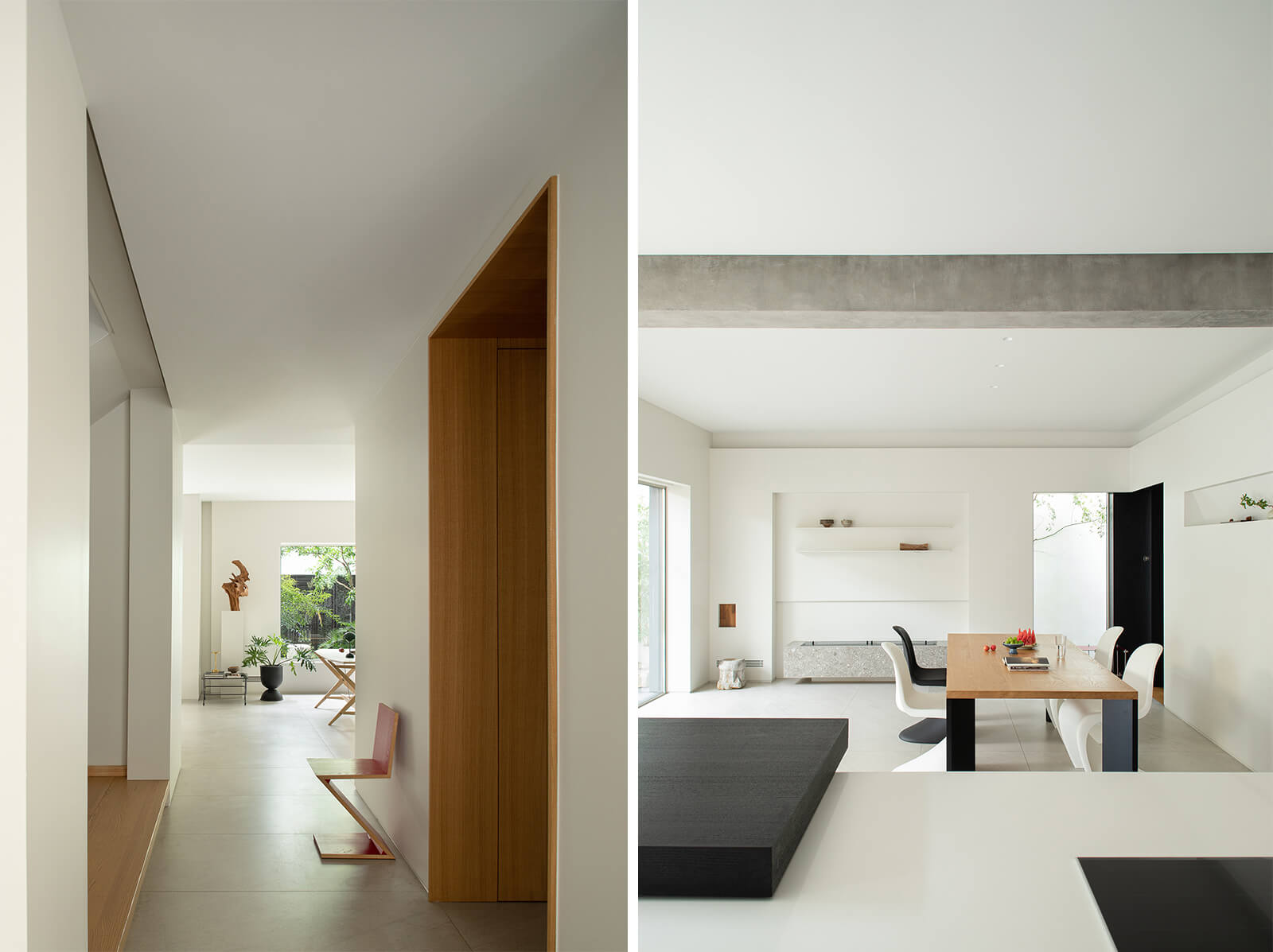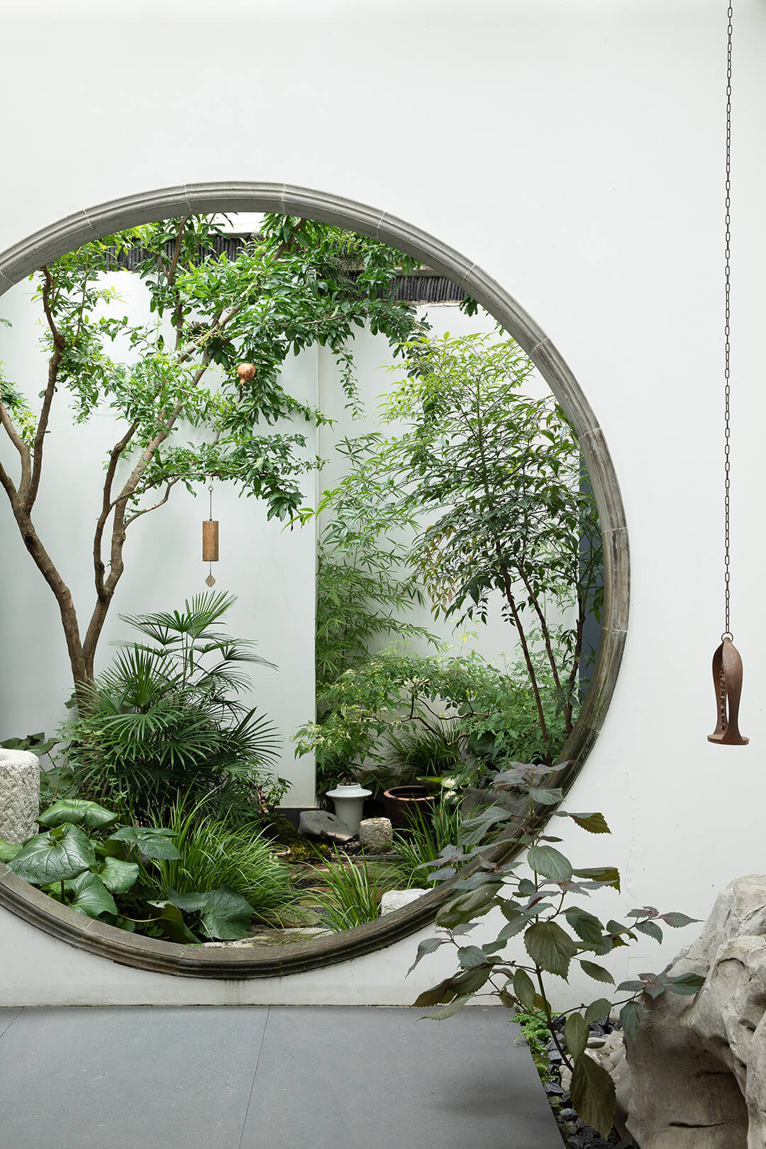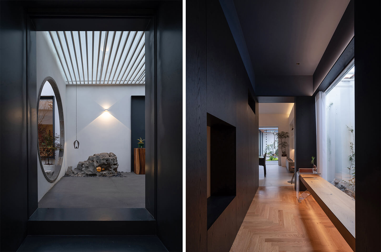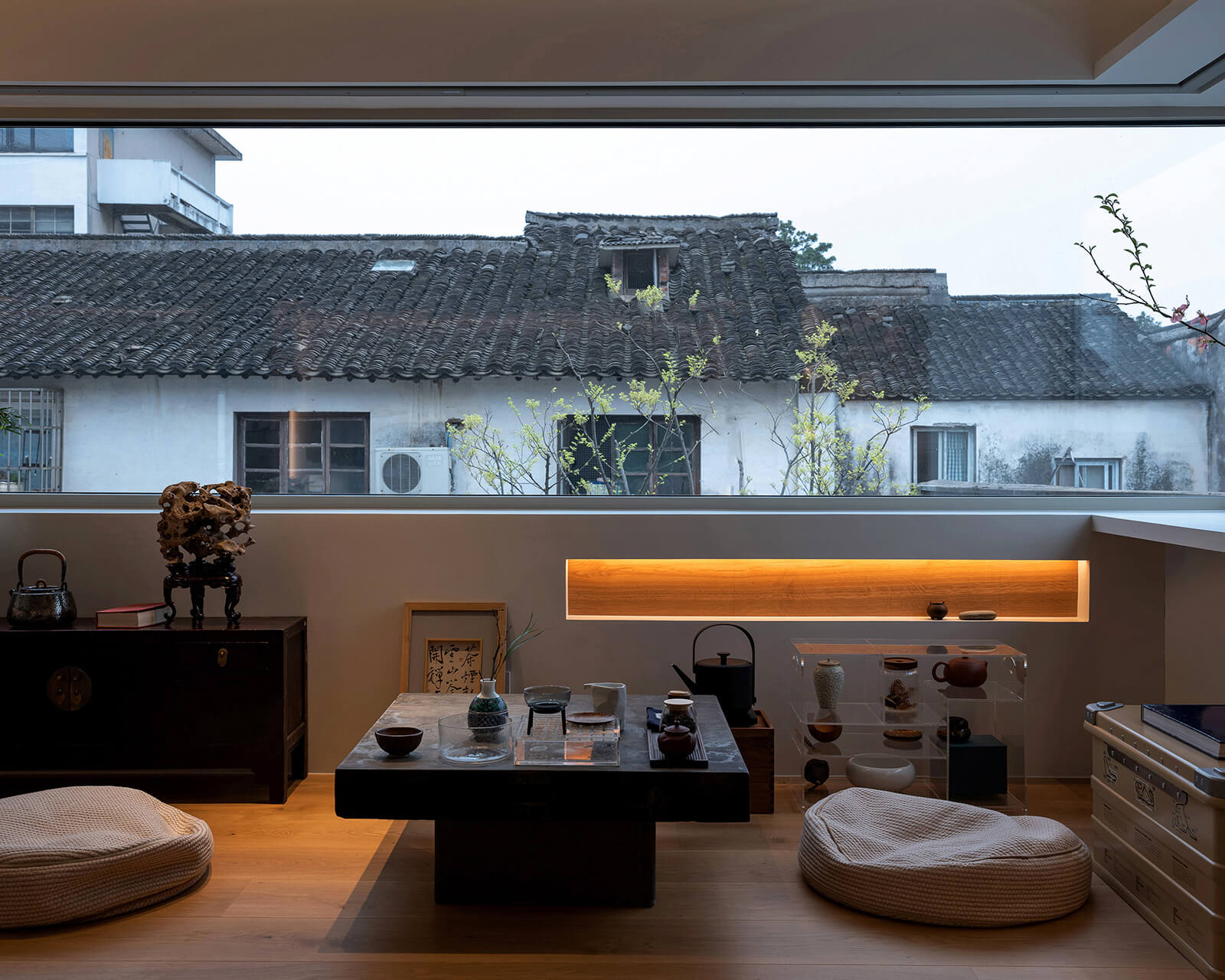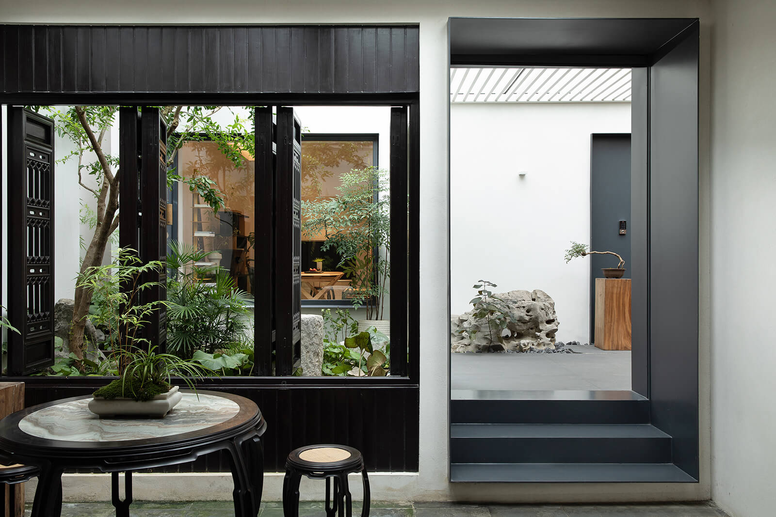 From the street, the courtyard design evokes the essence of Jiangnan gardens. A Moon Cave Gate frames a cluster of plants, creating the first scene in a sequence of carefully orchestrated views. Suzhou’s classical gardens are famed for their art of framing, where every doorway or window becomes a picture plane for nature. This principle is used sparingly by Yuanliang, who brought vegetation within the retreat to grow unhindered. As one continues further into the property, one comes across a hidden courtyard with subtle level shifts and a pond reflecting the sunlight. The space is anchored by a sturdy pine standing against the wall amidst the surrounding rocks.