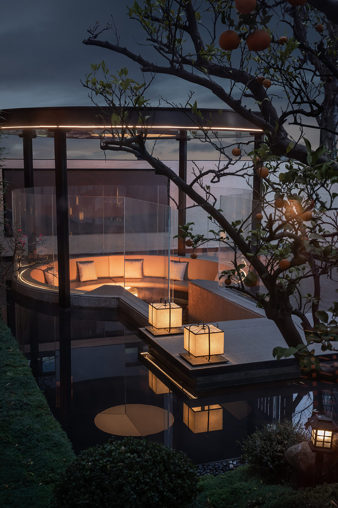 Window openings extend the borrowed scenery strategy, drawing the riverside night into the interior. Reflections from water, metal and glass introduce movement, while bamboo shadows and controlled illumination add texture and variation. The emphasis remains on atmosphere shaped through detail rather than visual excess.