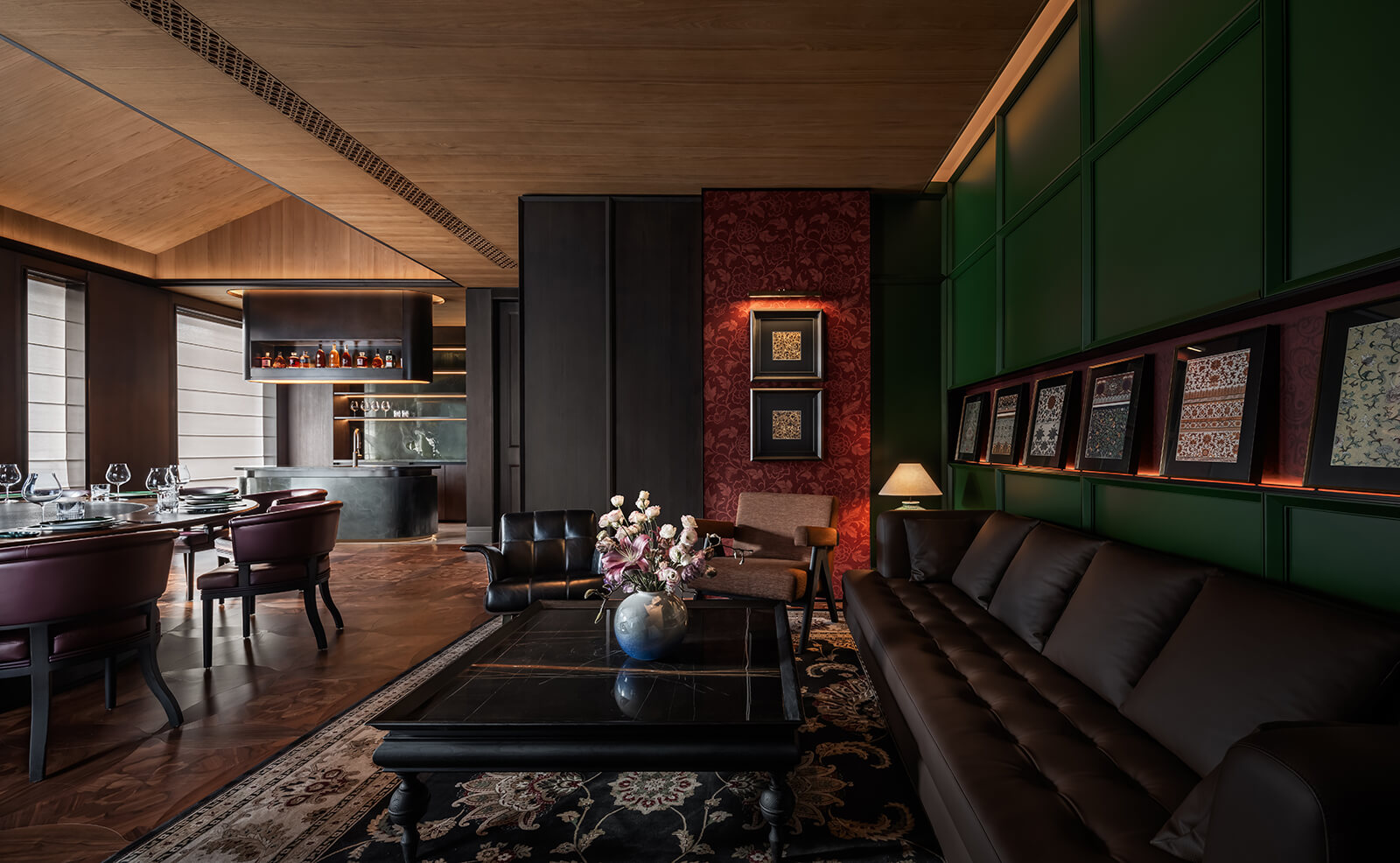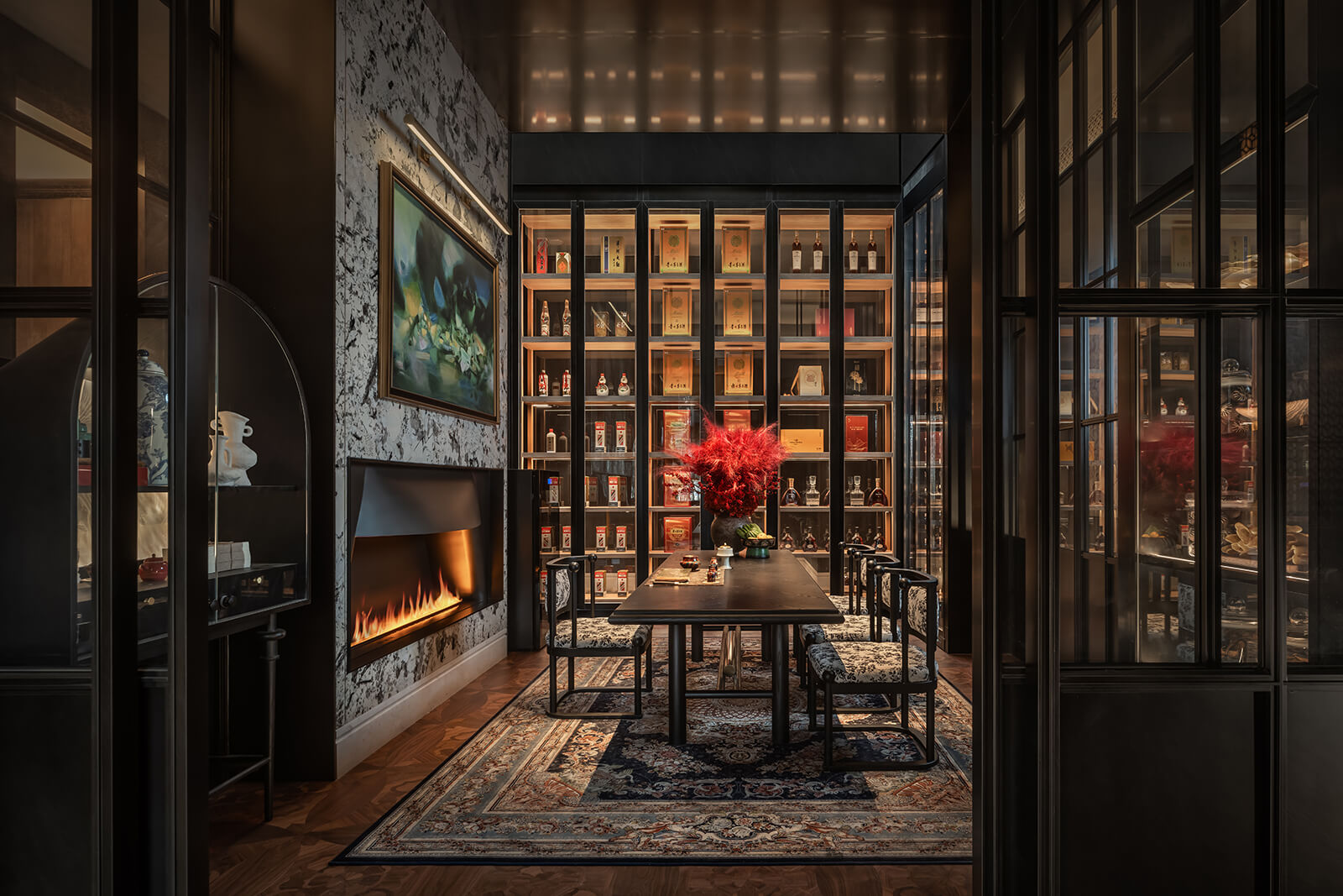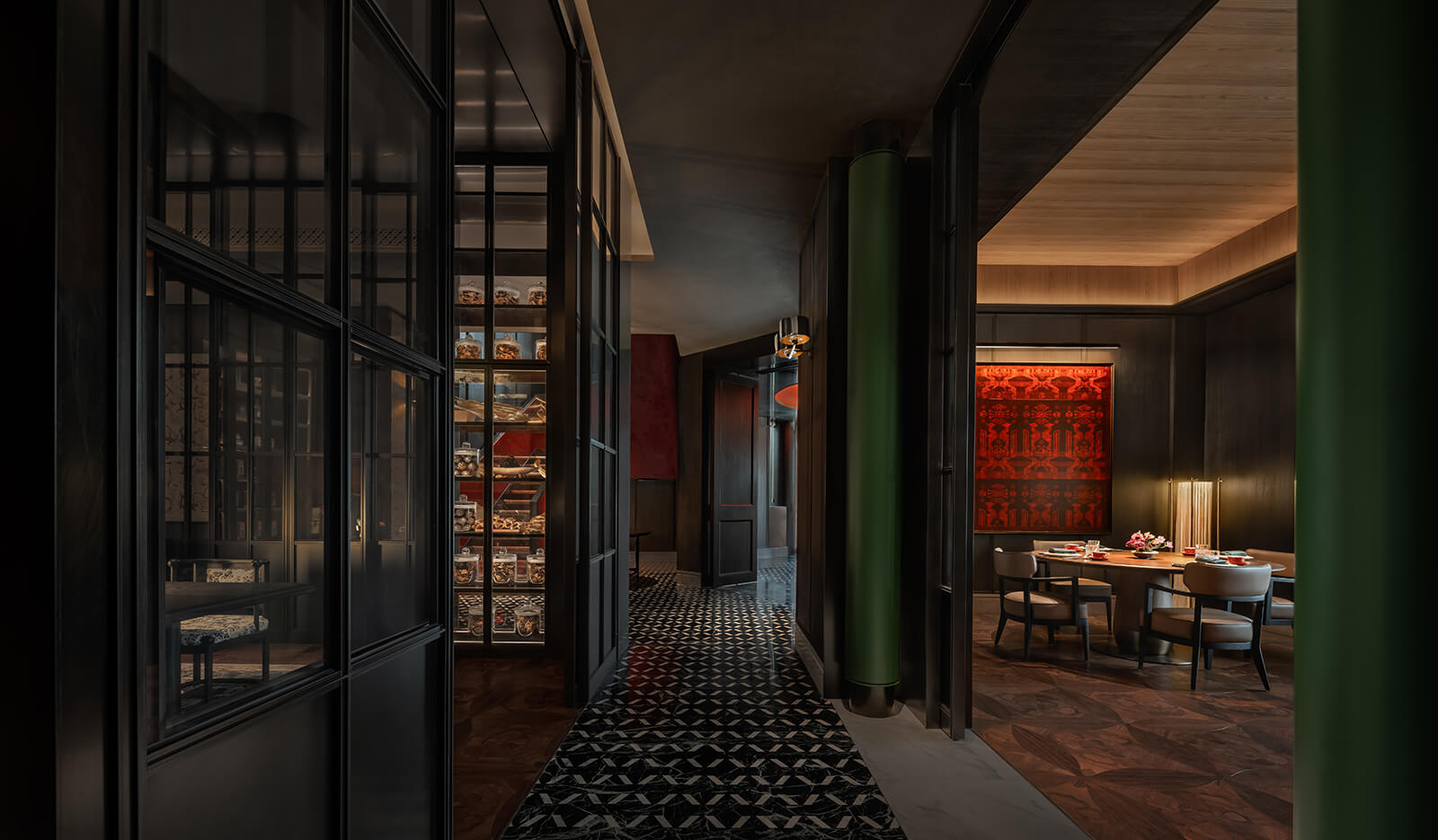 Lighting design by Langlige Lighting becomes increasingly important after dusk. A layered system of pendants, linear fixtures and concealed sources creates depth without theatricality. Light moves across red jade, ebony finishes and blue brick, maintaining continuity while supporting different moods across zones.