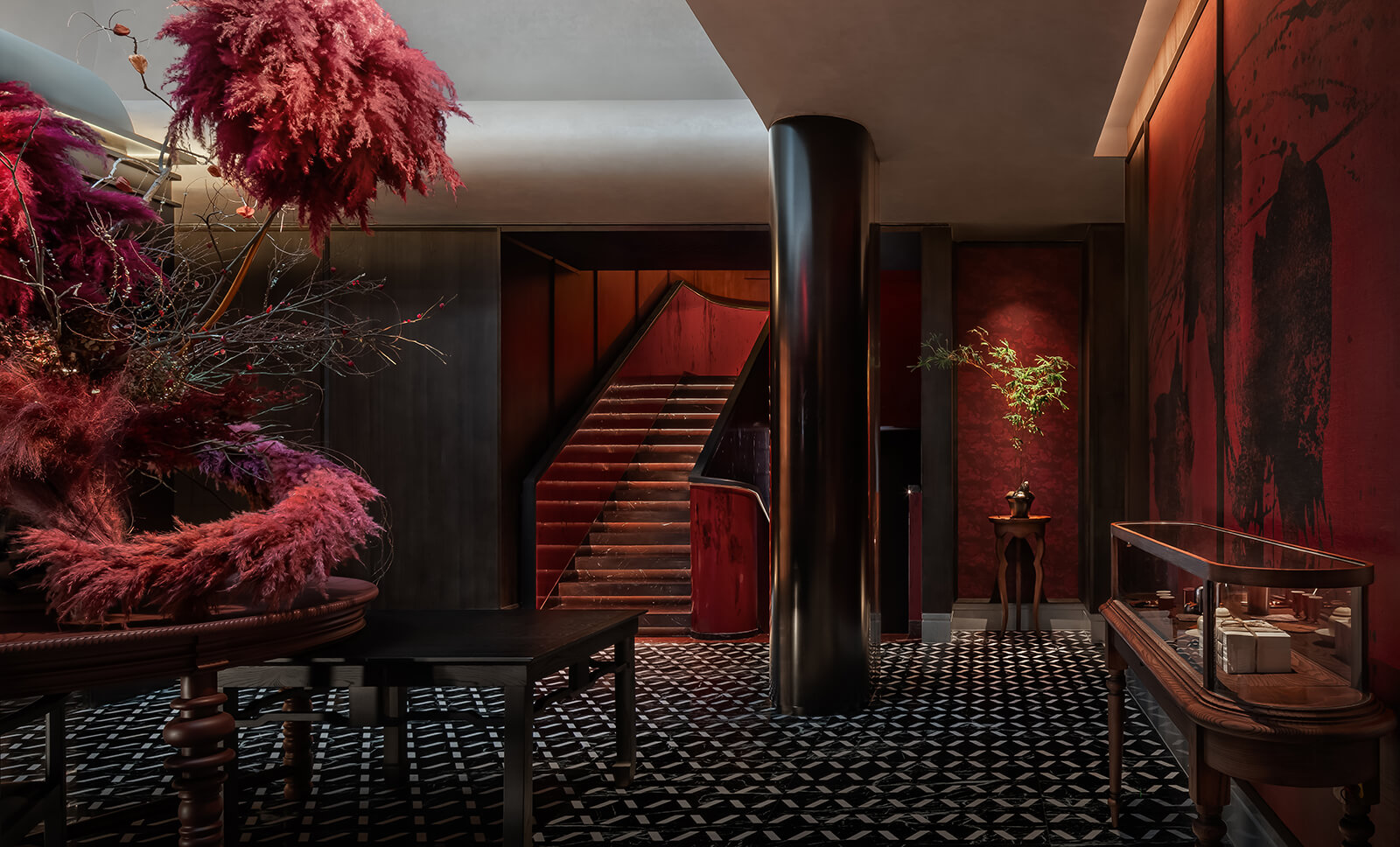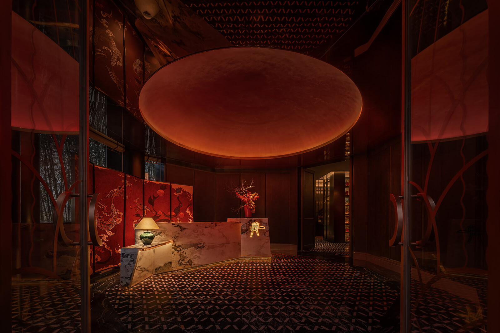 These materials are used structurally rather than decoratively. Texture, reflectivity and colour interaction are carefully controlled, allowing light to animate surfaces over time. Traditional Chinese design elements such as Han embroidery and Han opera colours are abstracted into spatial components. In private rooms, embroidery-inspired screens soften boundaries, while embossed floral patterns on red jade walls respond subtly to shifting light conditions.