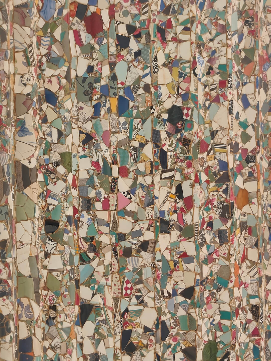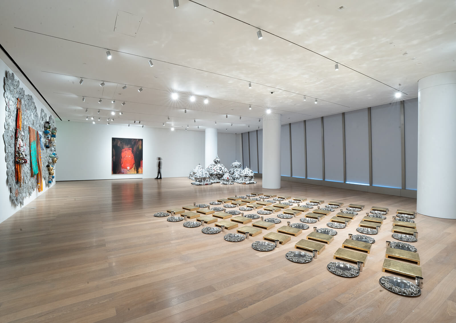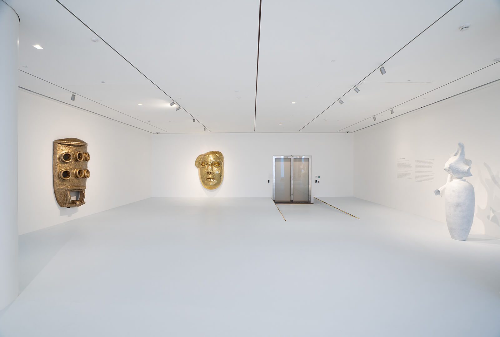 Gupta talks about the work behind the 10-year-long mixed media undertaking, saying, “[The hammered metal columns] are made through ‘chasing’ (a metalwork technique where metal is hammered from the reverse side to make a relief pattern), a technique only used in China and India. It’s meant to mimic the texture of the stone…[The concrete pillar] has a printed sari embedded in it…[For the mosaic column], one of my friends has a factory that manufactures plates, etc. I knew there would be broken plates and ceramic material, so I asked for their waste to construct this.” The varied materials come together in idealised classical forms, creating an image of modern civilisation through the physical and consumer goods it generates, and reimagining them in the language of a future archaeology. Gold masks recall more ancient, African art and round out the installation, Kingdom of the Earth (2016 – 26), expanding the timescale we typically think in, just as the white space expands the felt experience of space.